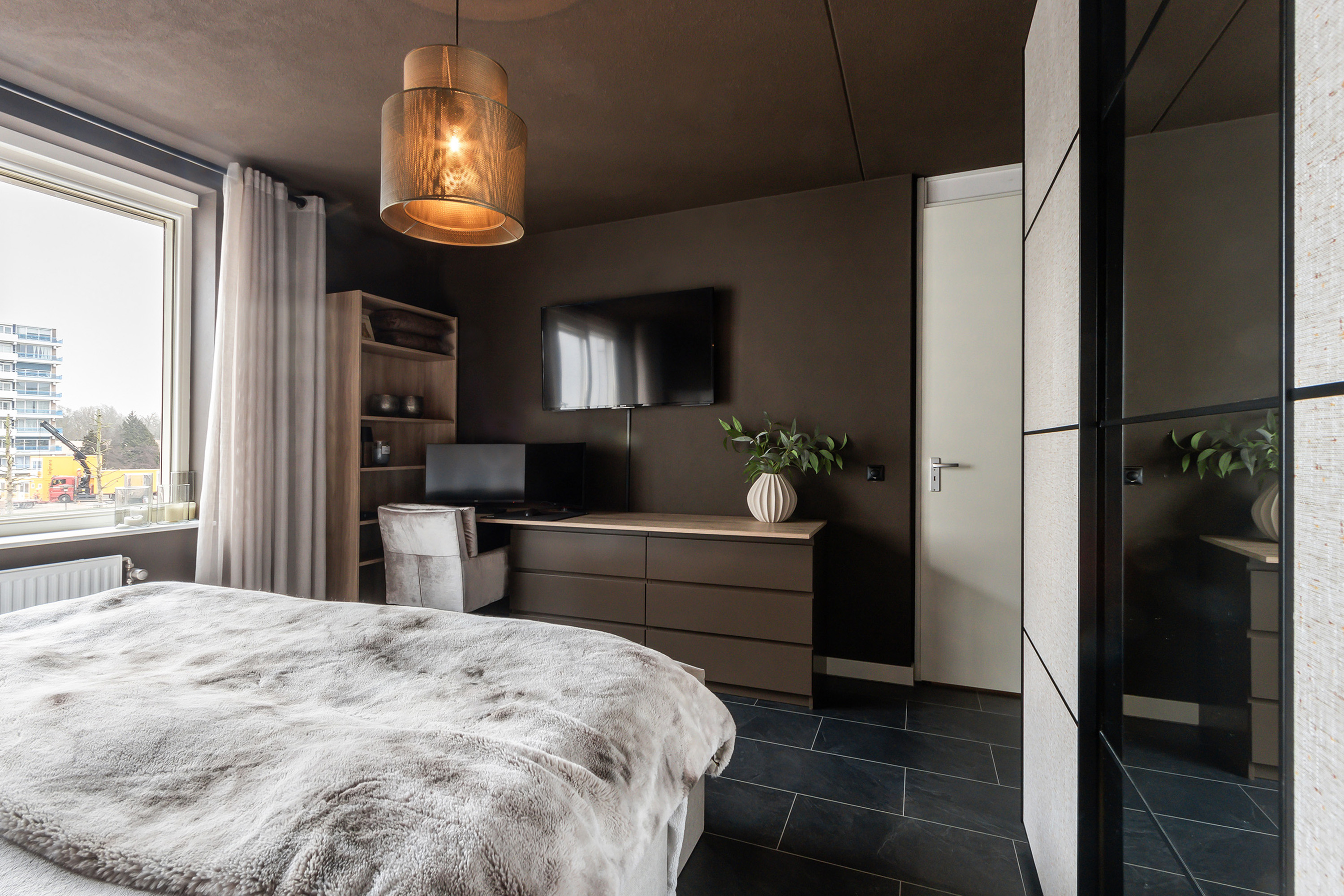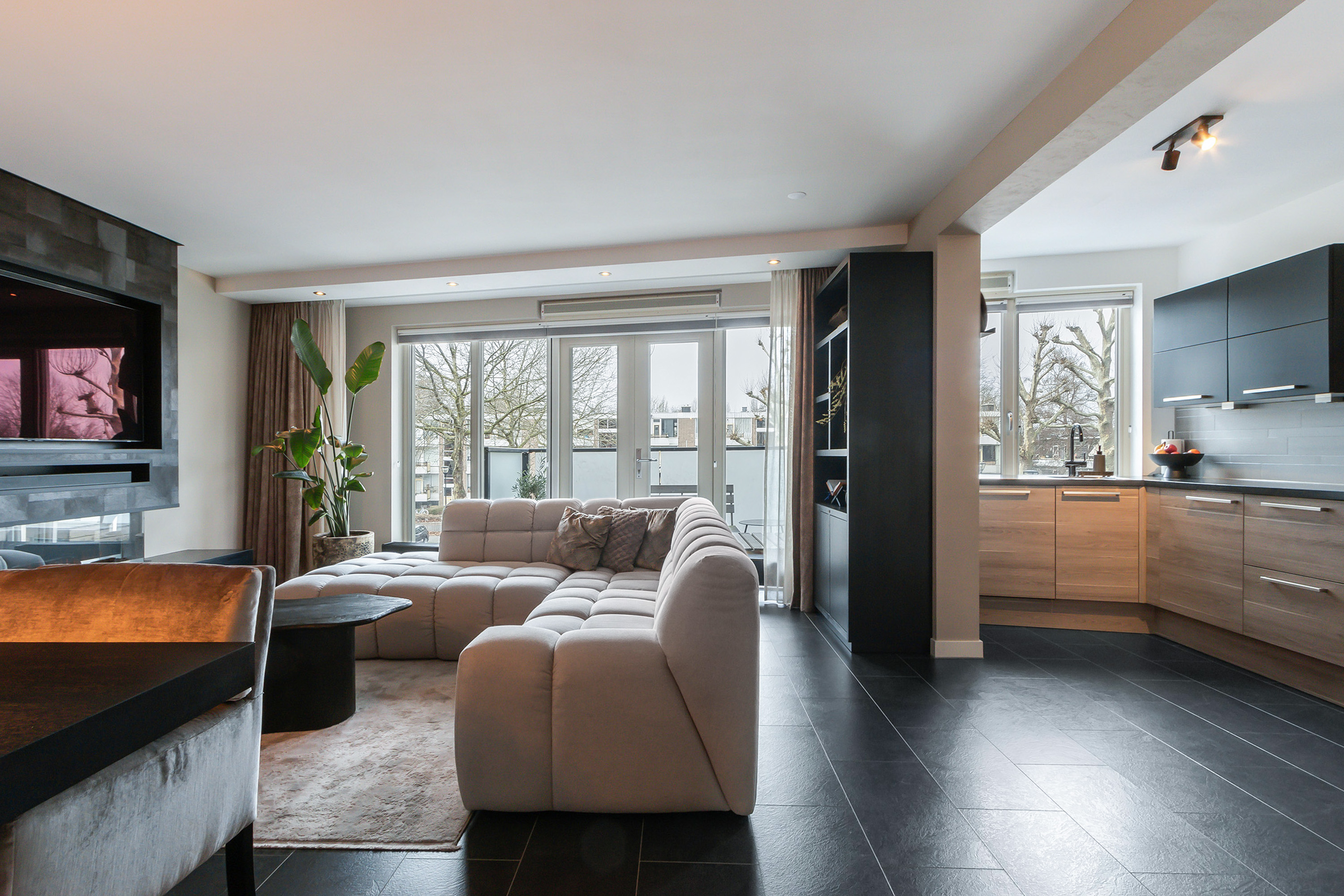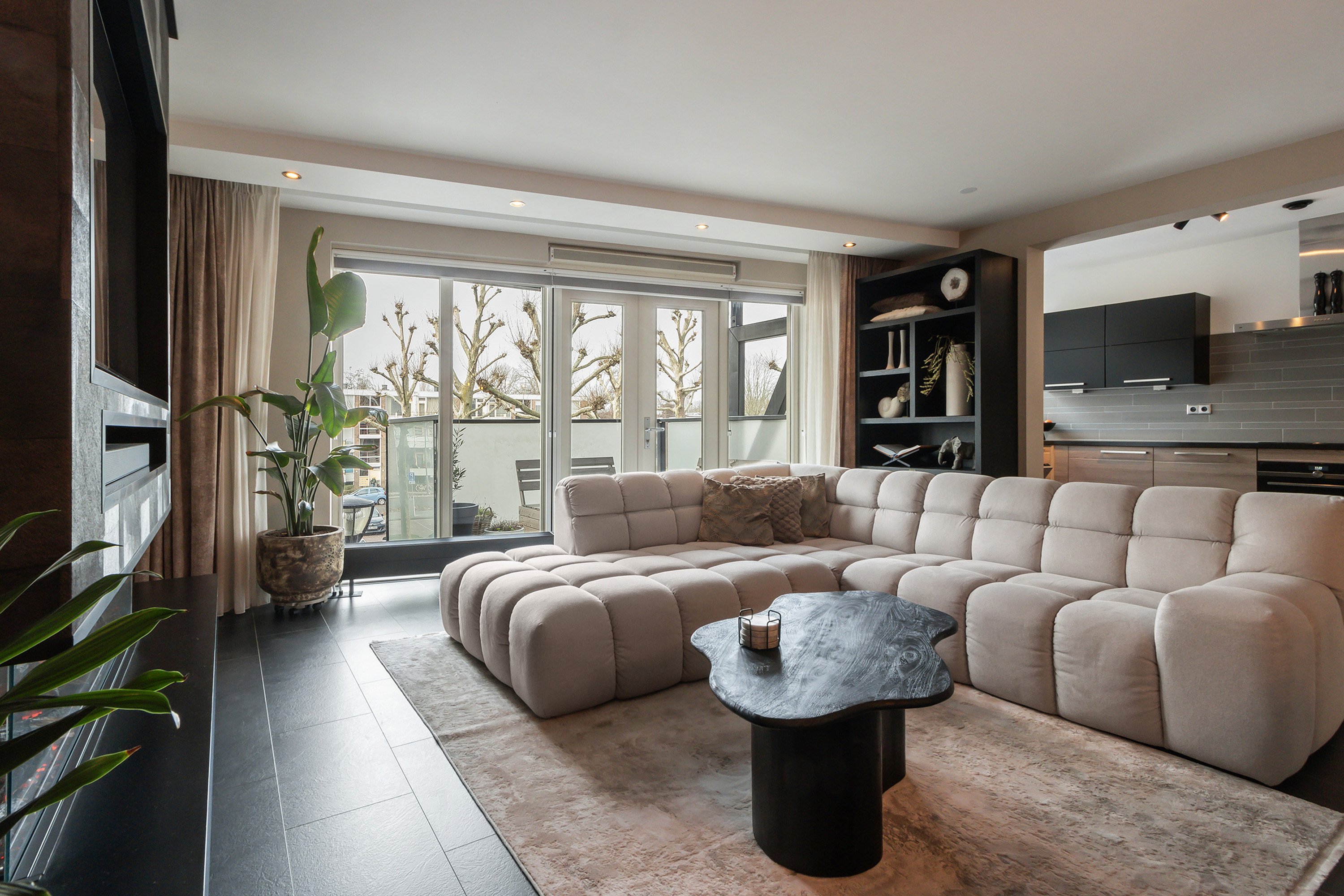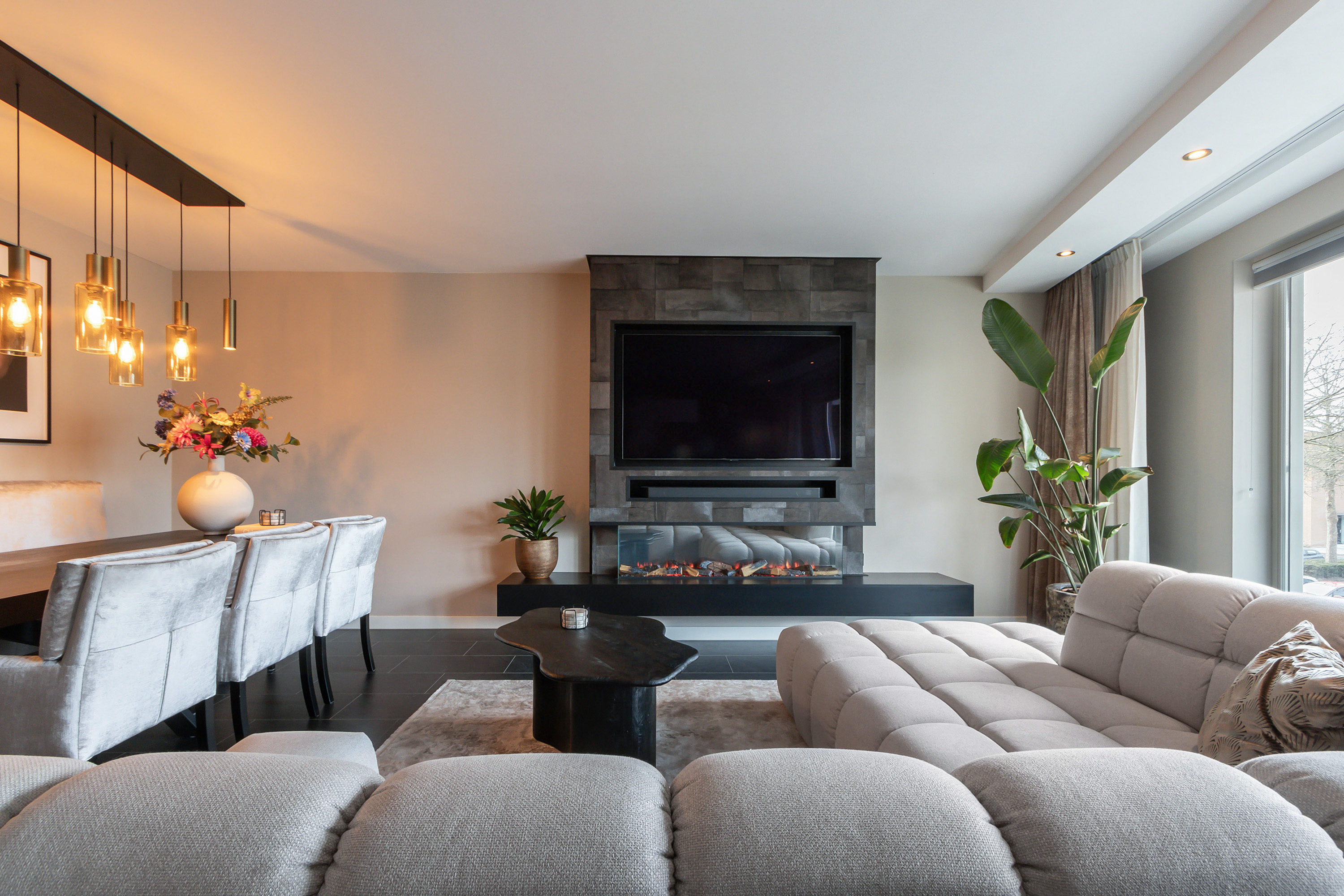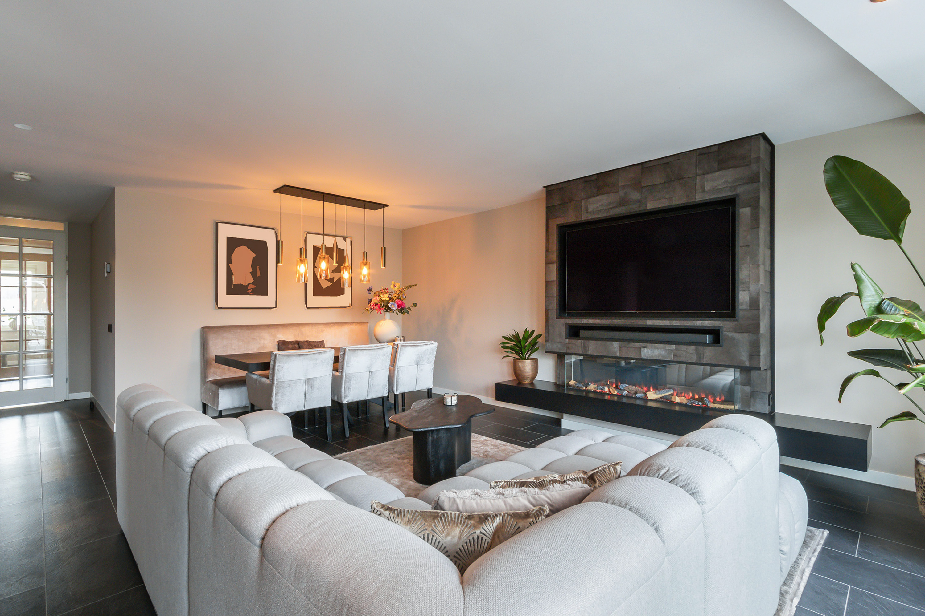 - Ruime woonkamer voorzien van een stijlvolle cinewall met elektrische sfeerhaard en dubbele openslaande deuren naar het balkon;