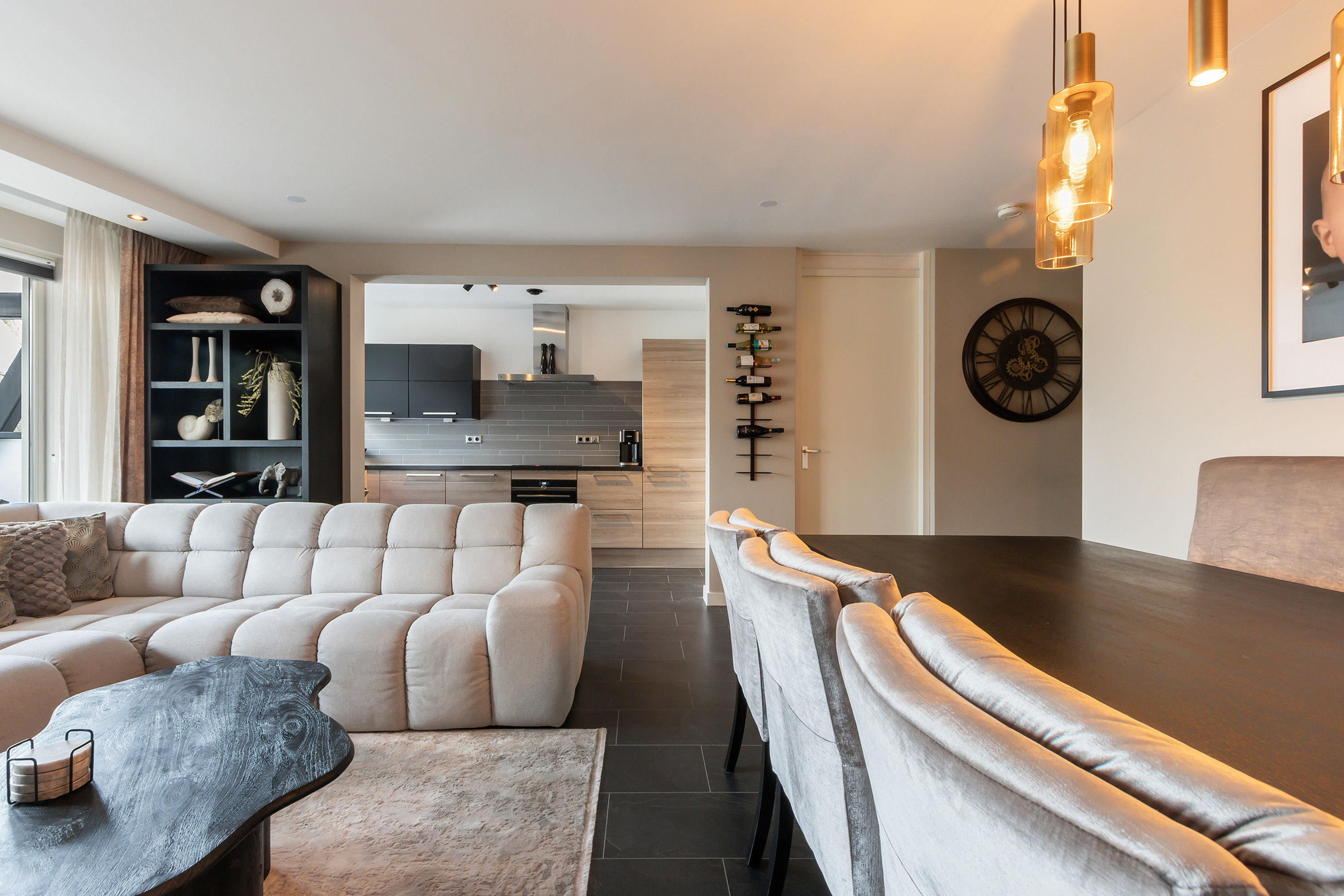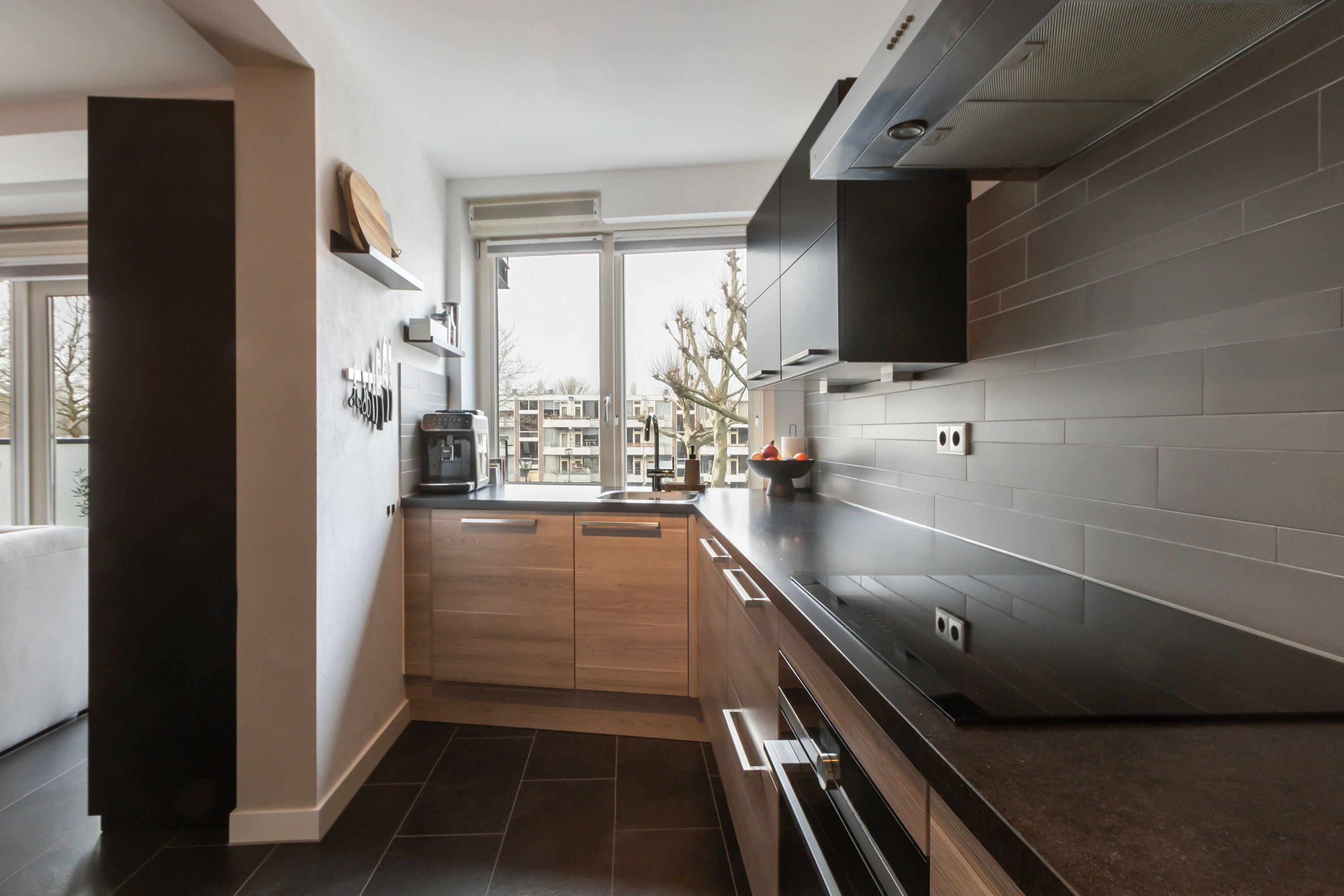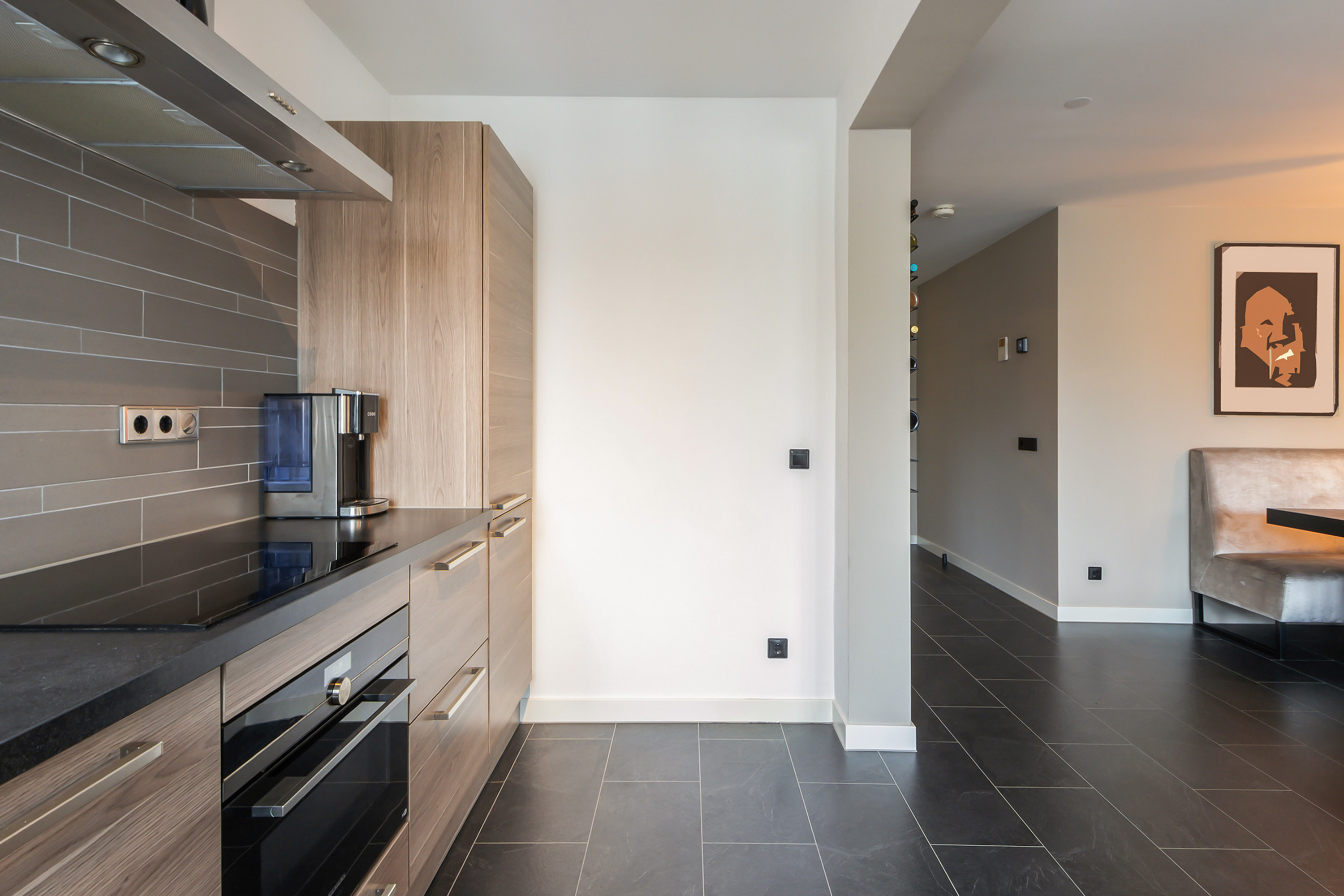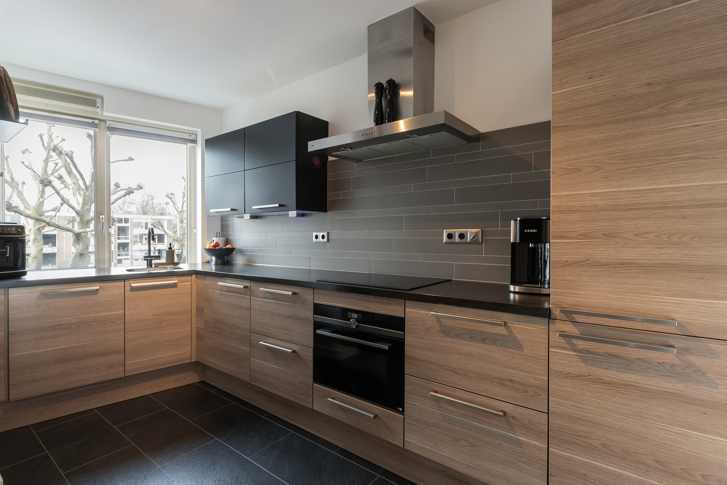 - Open keuken in hoekopstelling met (grotendeels) houtlook onder- en bovenkasten en laden, een betegelde achterwand, een enkele RVS spoelbak, afzuigkap en koel-vriescombinatie. In 2024 is een groot deel van de apparatuur vernieuwd, waaronder een 4-zone inductiekookplaat, combimagnetron en vaatwasser (allen van Siemens Studioline);