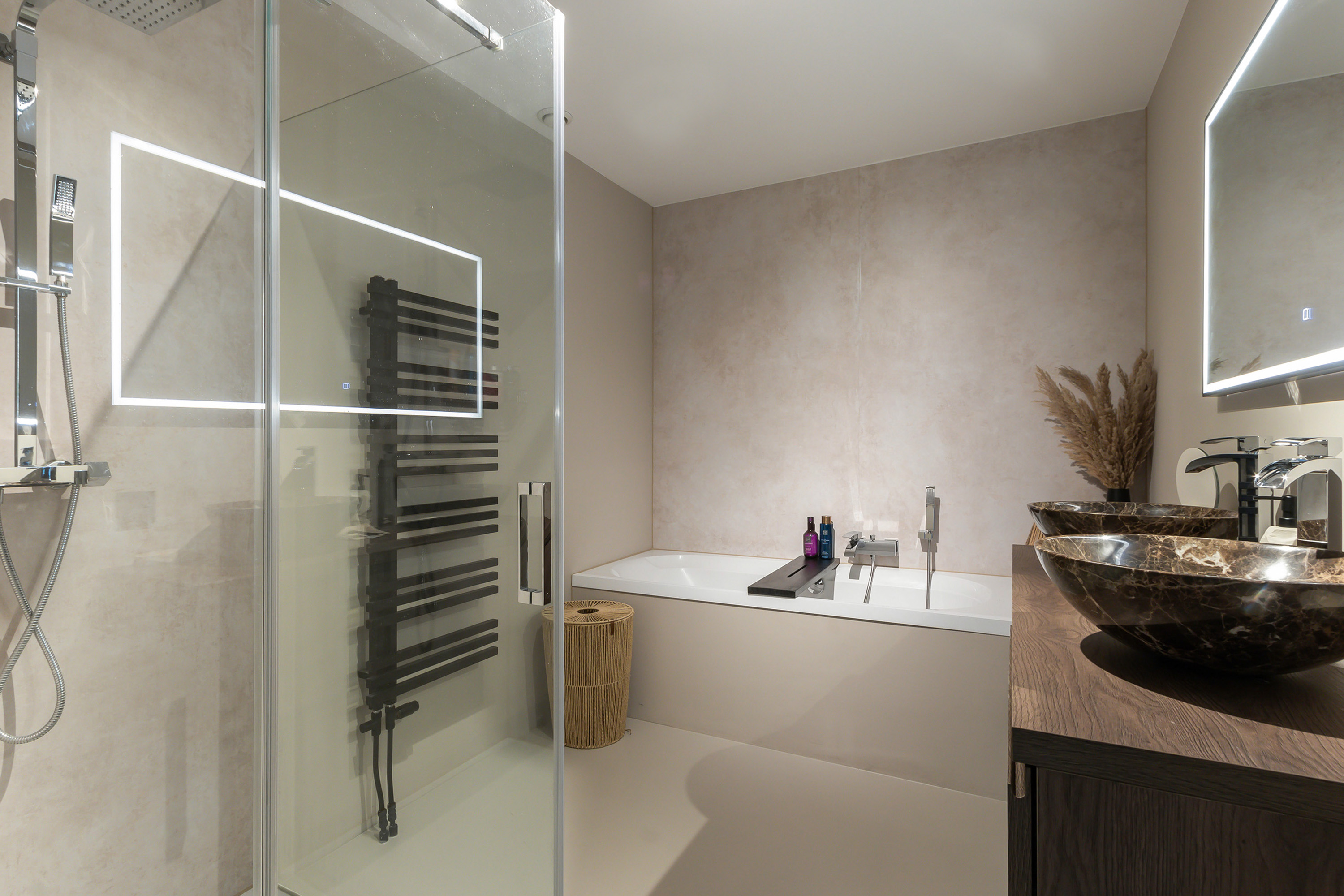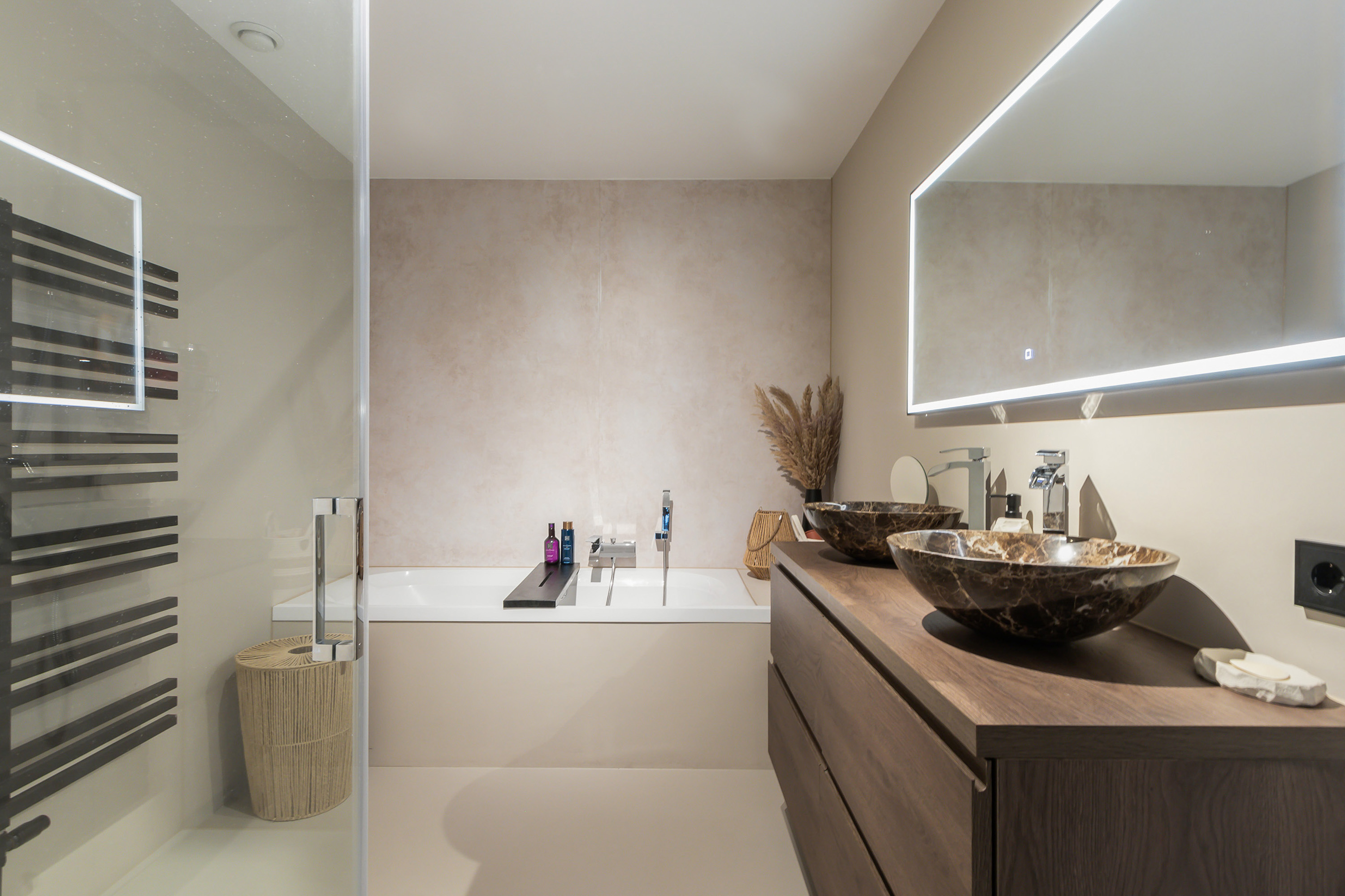 - Luxe badkamer met gestucte wanden en aan de achterzijde PVC-panelen in marmerlook bij het bad en de douche, gecombineerd met een stijlvolle gietvloer. De badkamer is voorzien van een dubbel walnoothouten wastafelmeubel met marmerlook waskommen, een verwarmde en verlichte spiegel, een royaal ligbad, een douchecabine met glazen wanden en deur, een RVS regen- en handdouche en een designradiator;