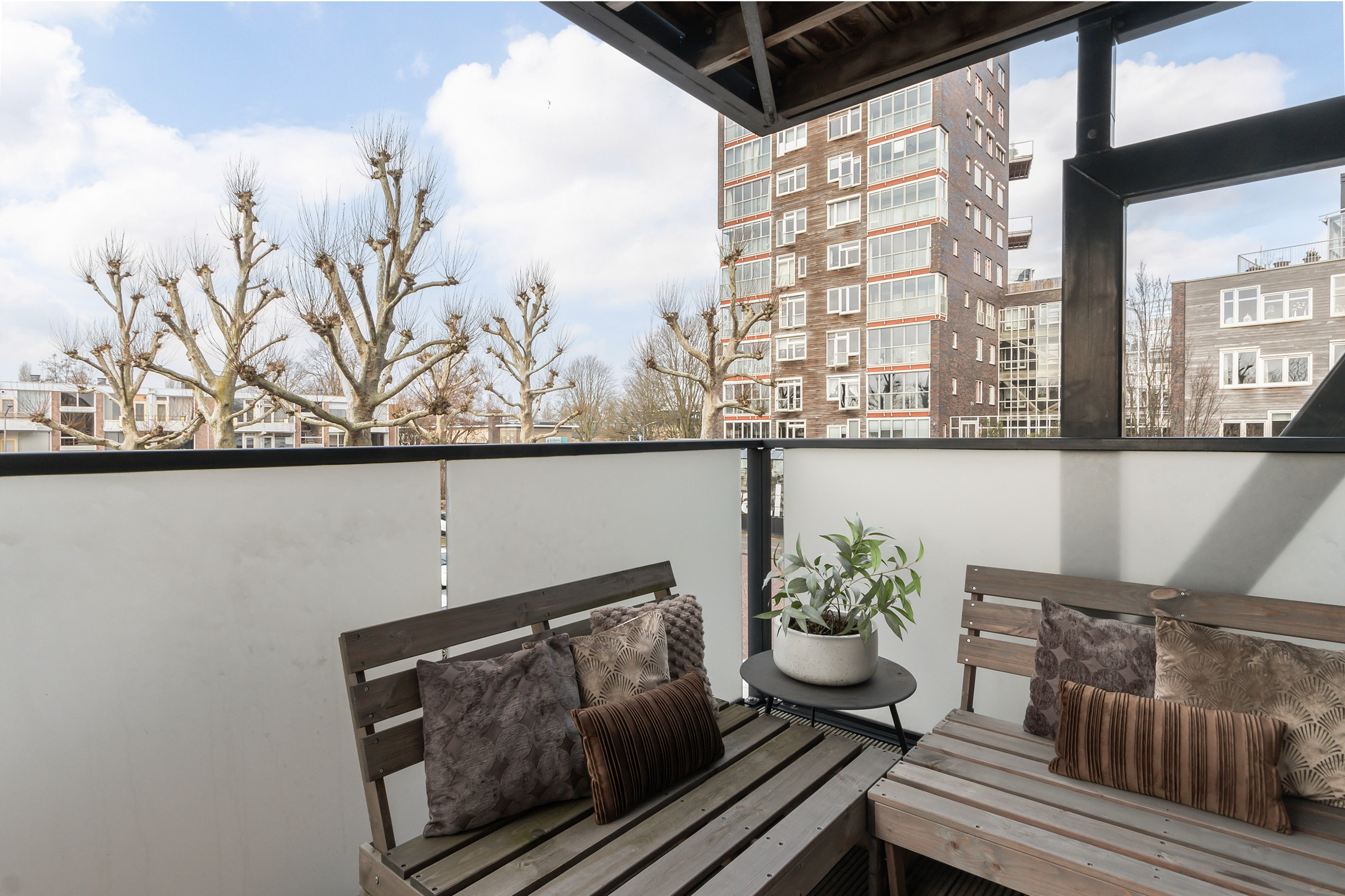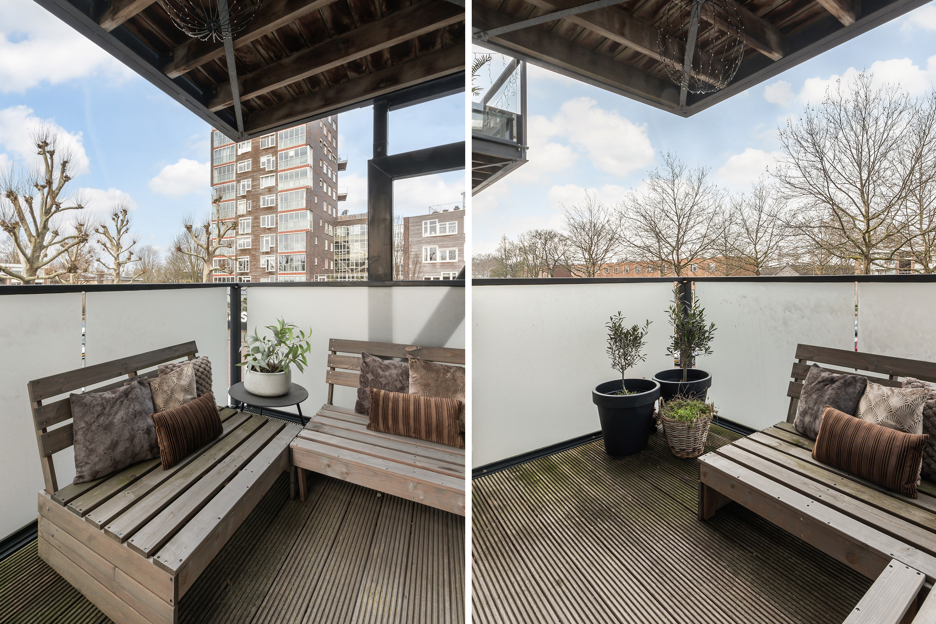 - Balkon: ca. 1.85 m x 3.10 m., gesitueerd op het westen. Aangelegd met houten vlonders;