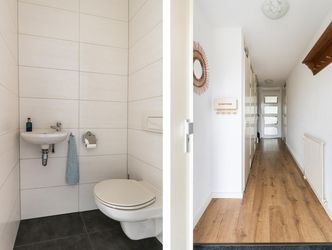 - Modern toilet (2019) met geheel betegelde wanden, plavuizen vloer, wit sanitair, hangcloset en een fontein;