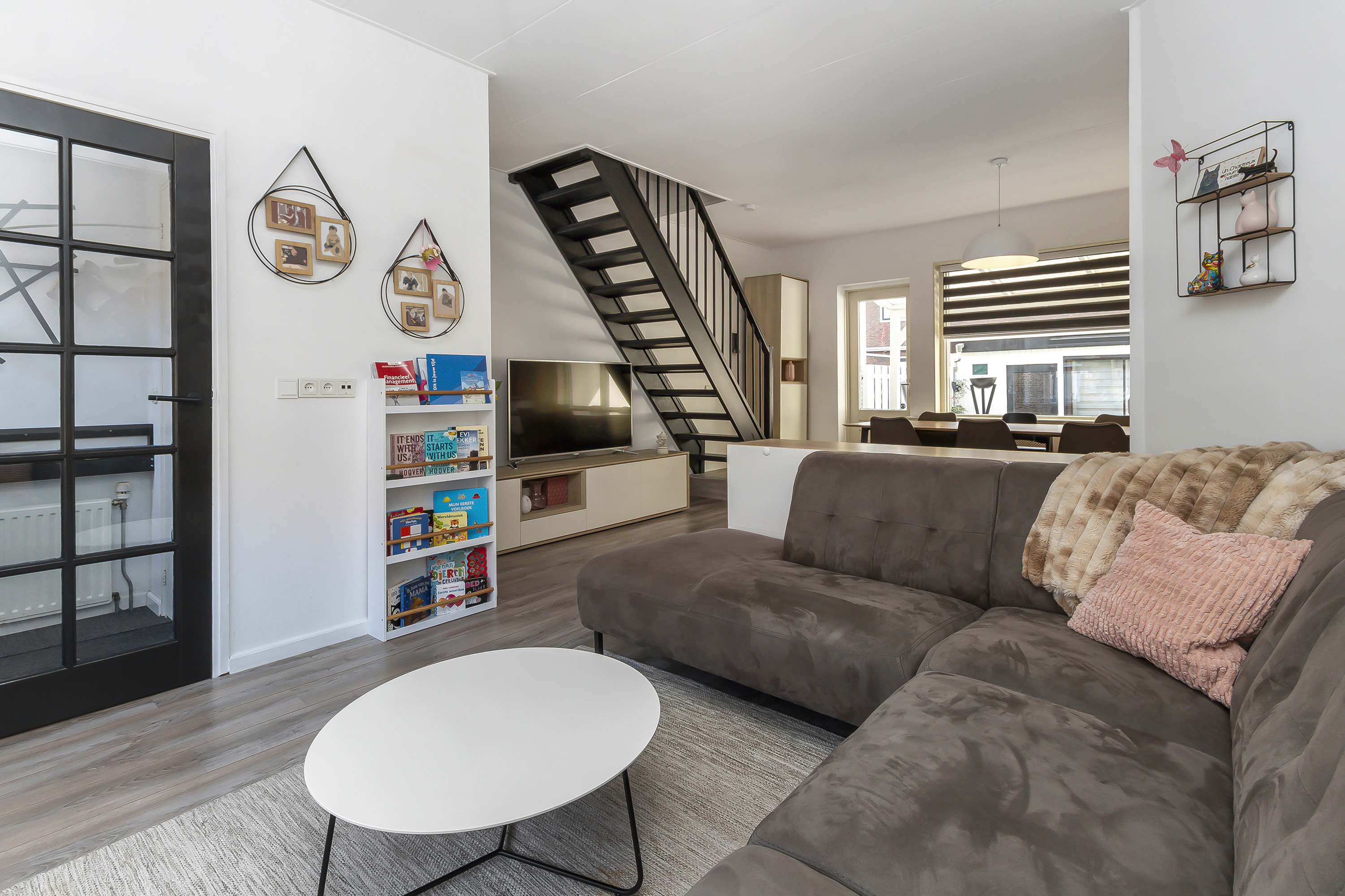 - Gezellige woonkamer met open trap en deur naar de tuin;