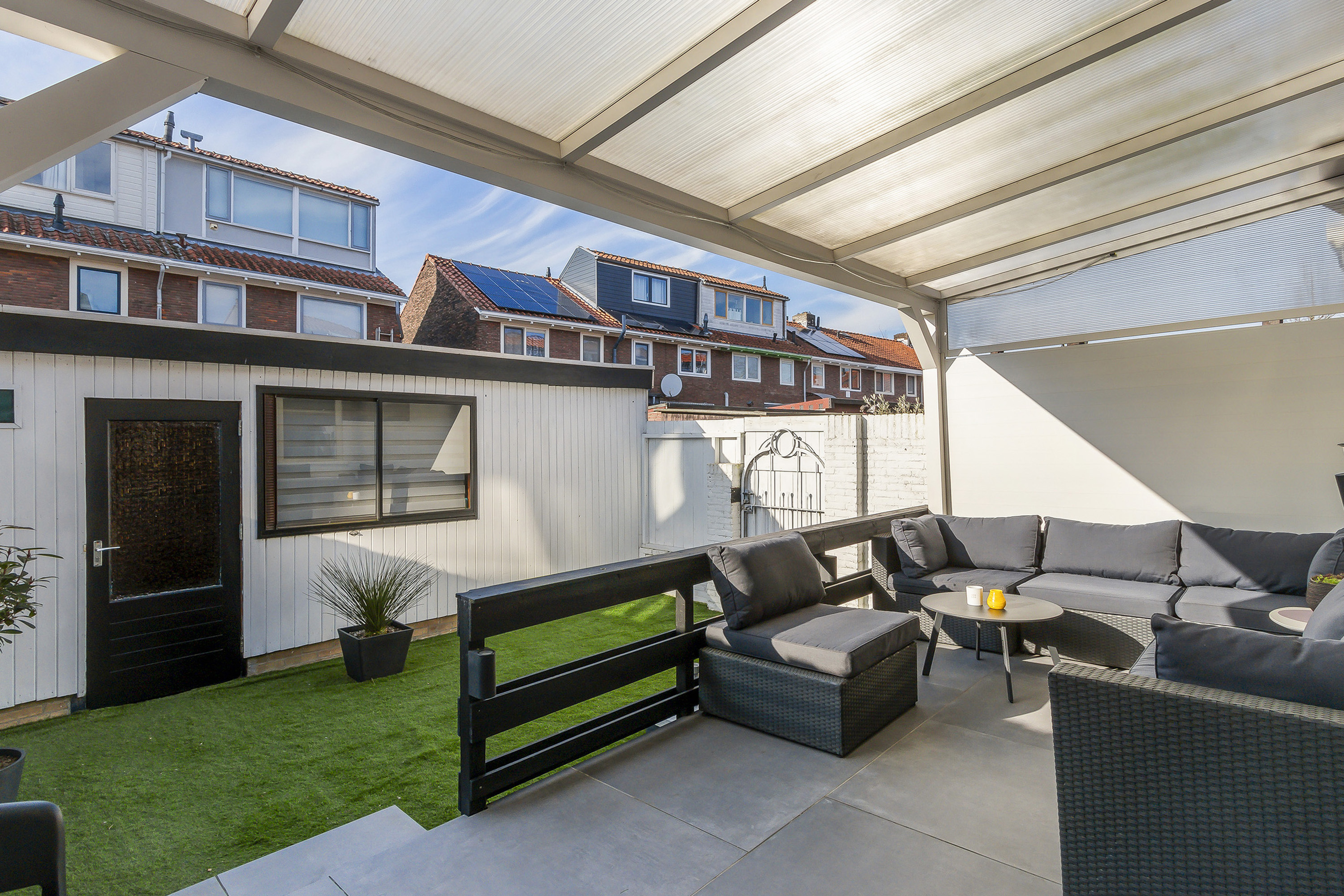 - Zonnige achtertuin gelegen op het westen. Ruim terras met overkapping van aluminium met polycarbonaat dakplaten. Leuk speelplaatsje met kunstgras. Berging van hout met bitumen dak.