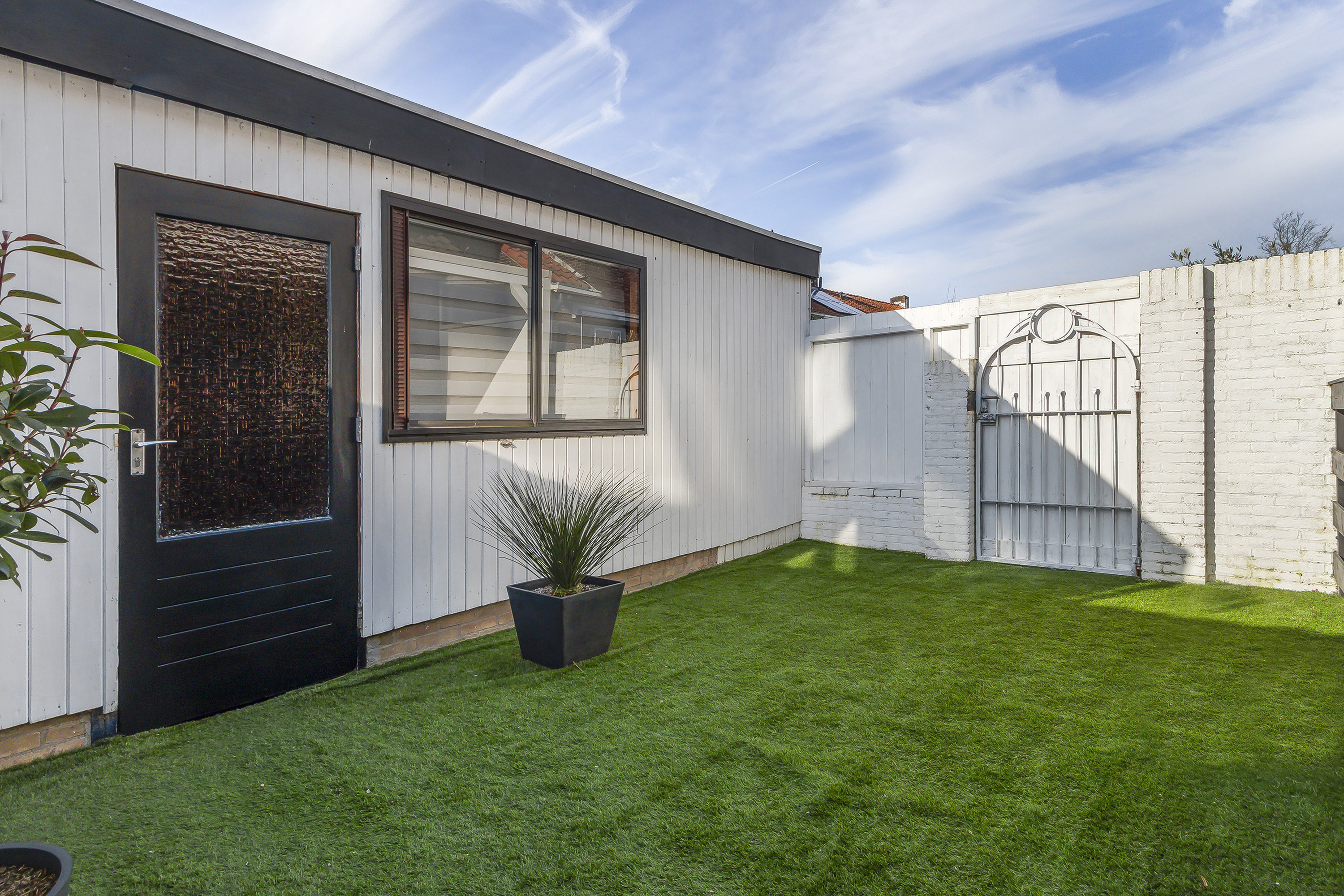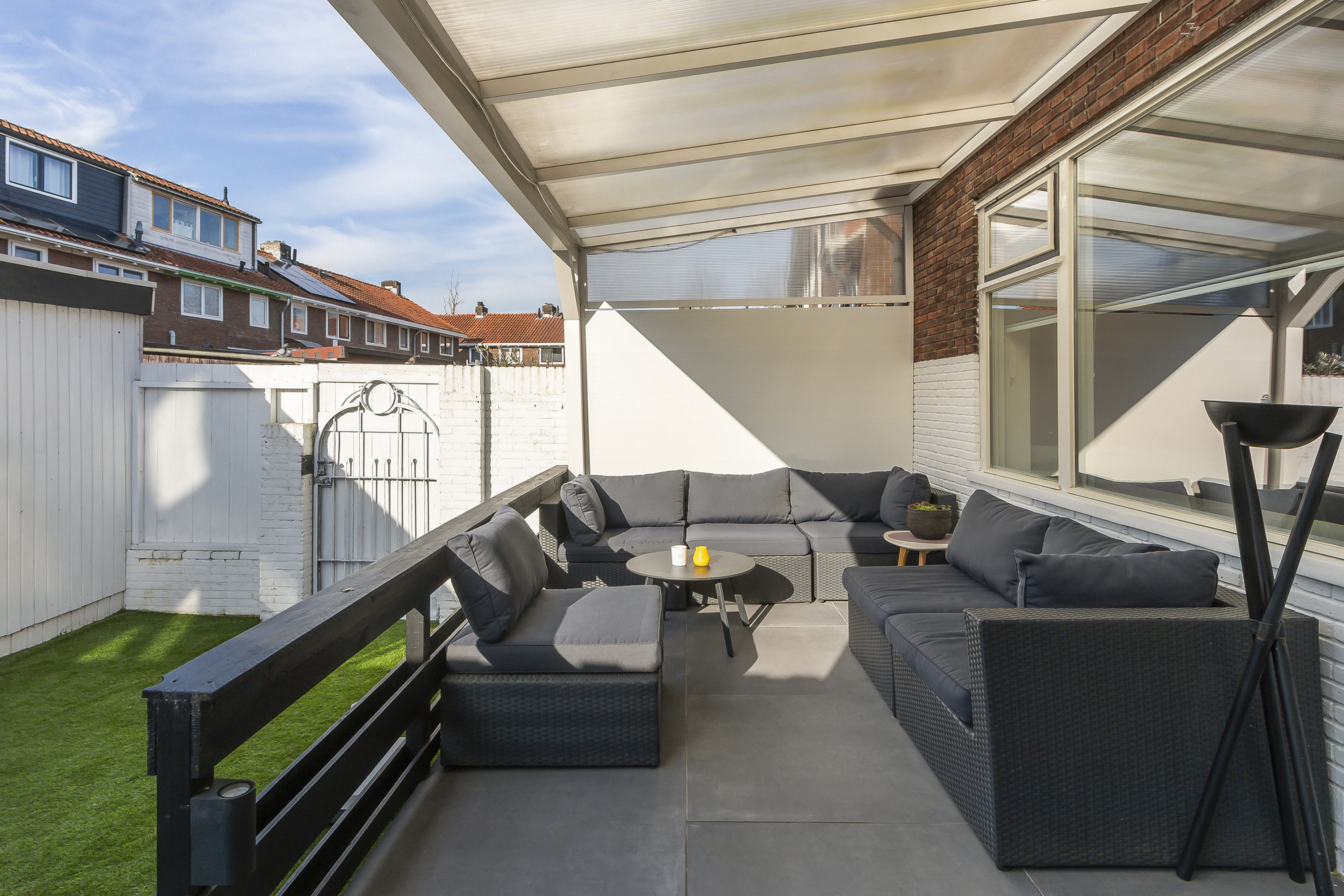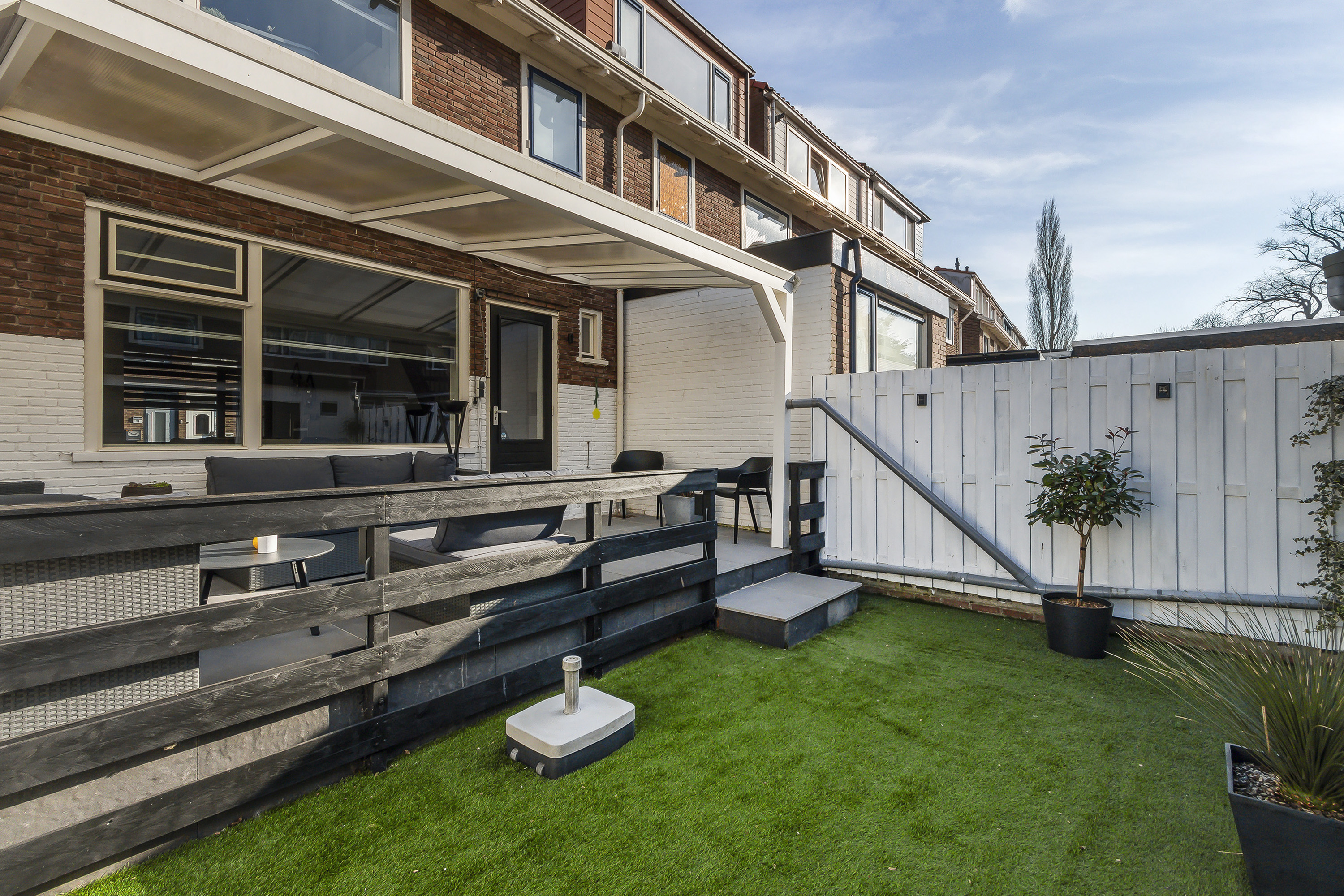 De zonnige achtertuin, gelegen op het westen, is ingericht met een groot terras inclusief aluminium overkapping met polycarbonaat dakplaten, een strook kunstgras en een ruime berging. Hier geniet je optimaal van het buitenleven!