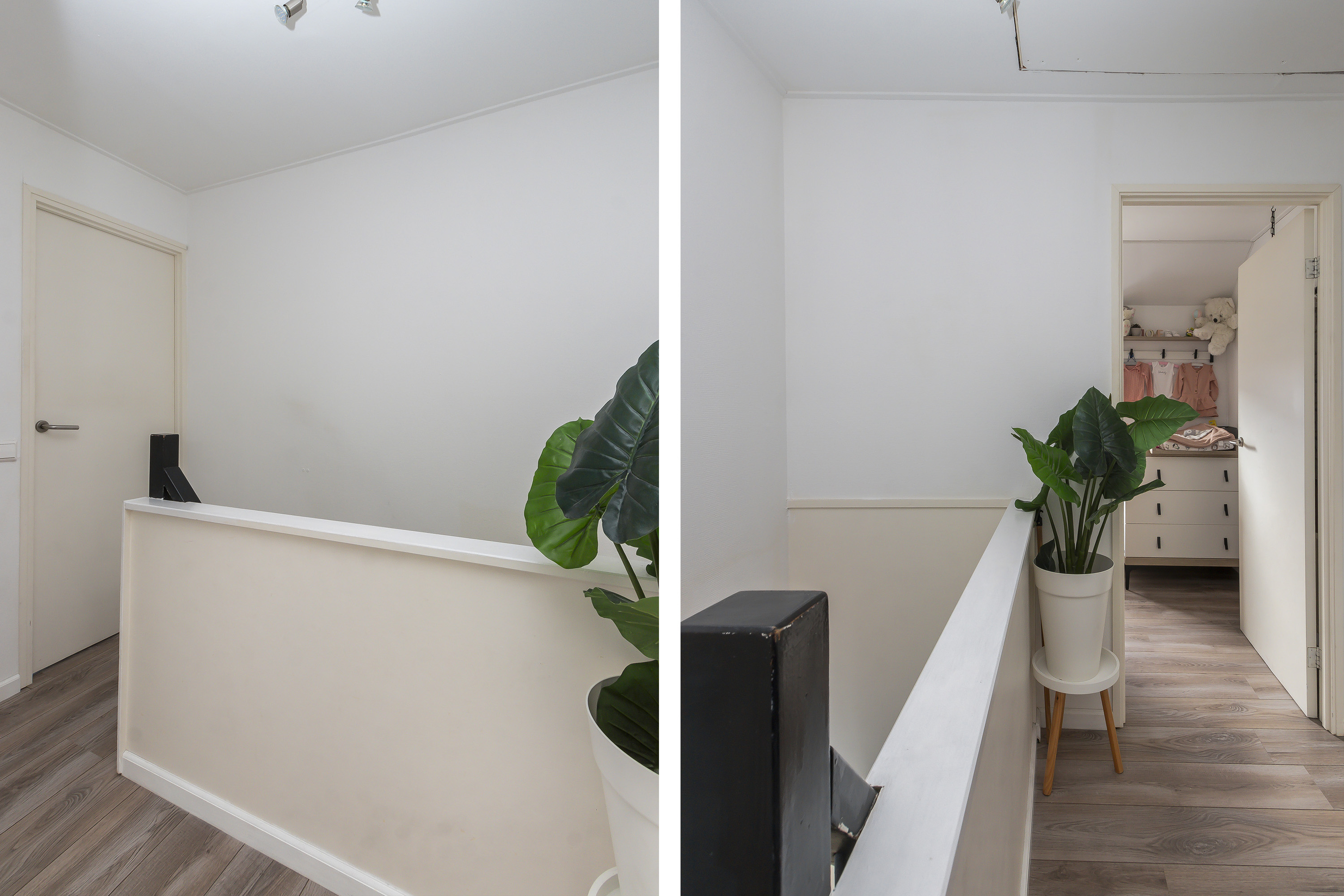 - Eerste verdieping: wandafwerking met glasvlies behang of gestucte en gesausde muren. Vloerafwerking met laminaat.