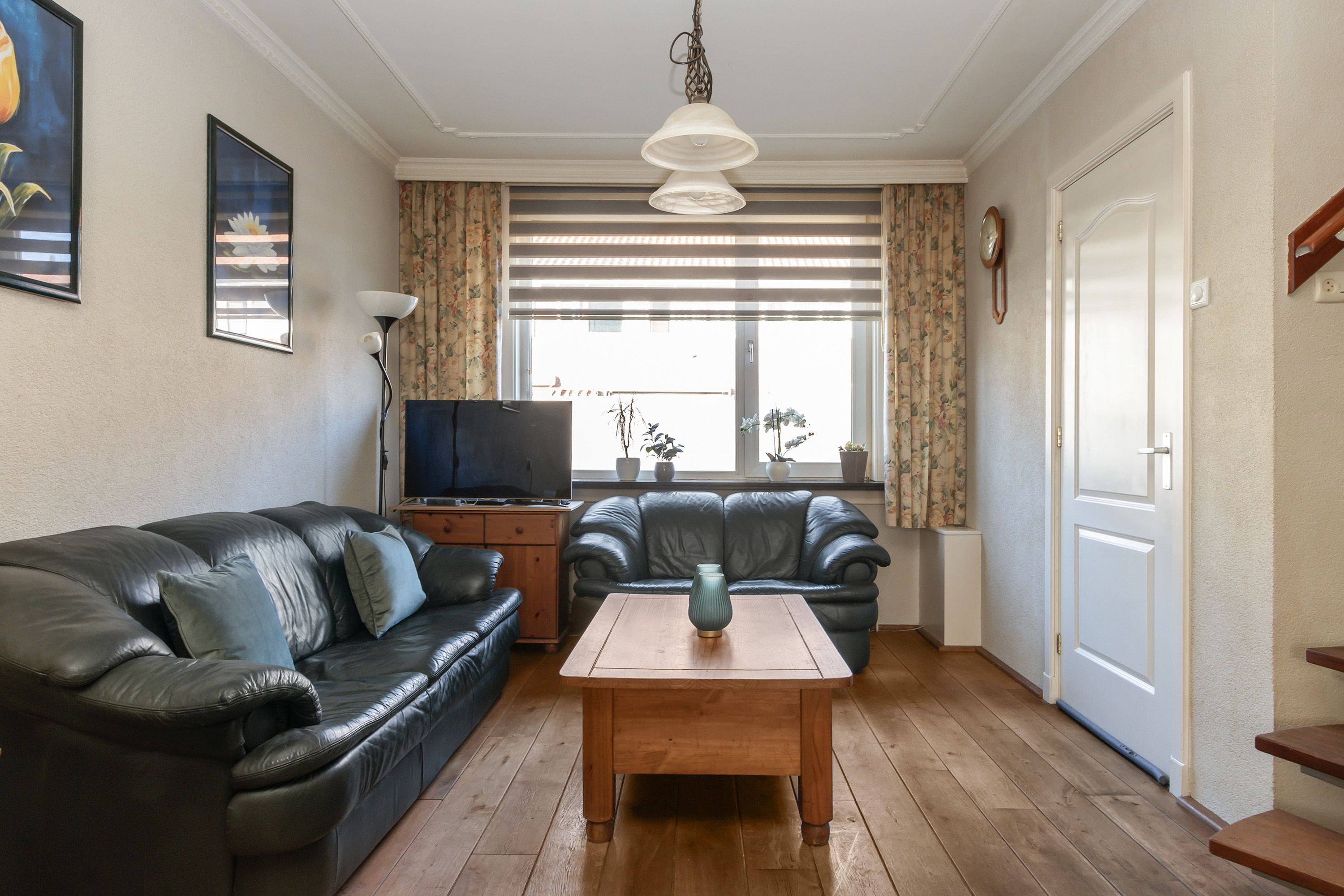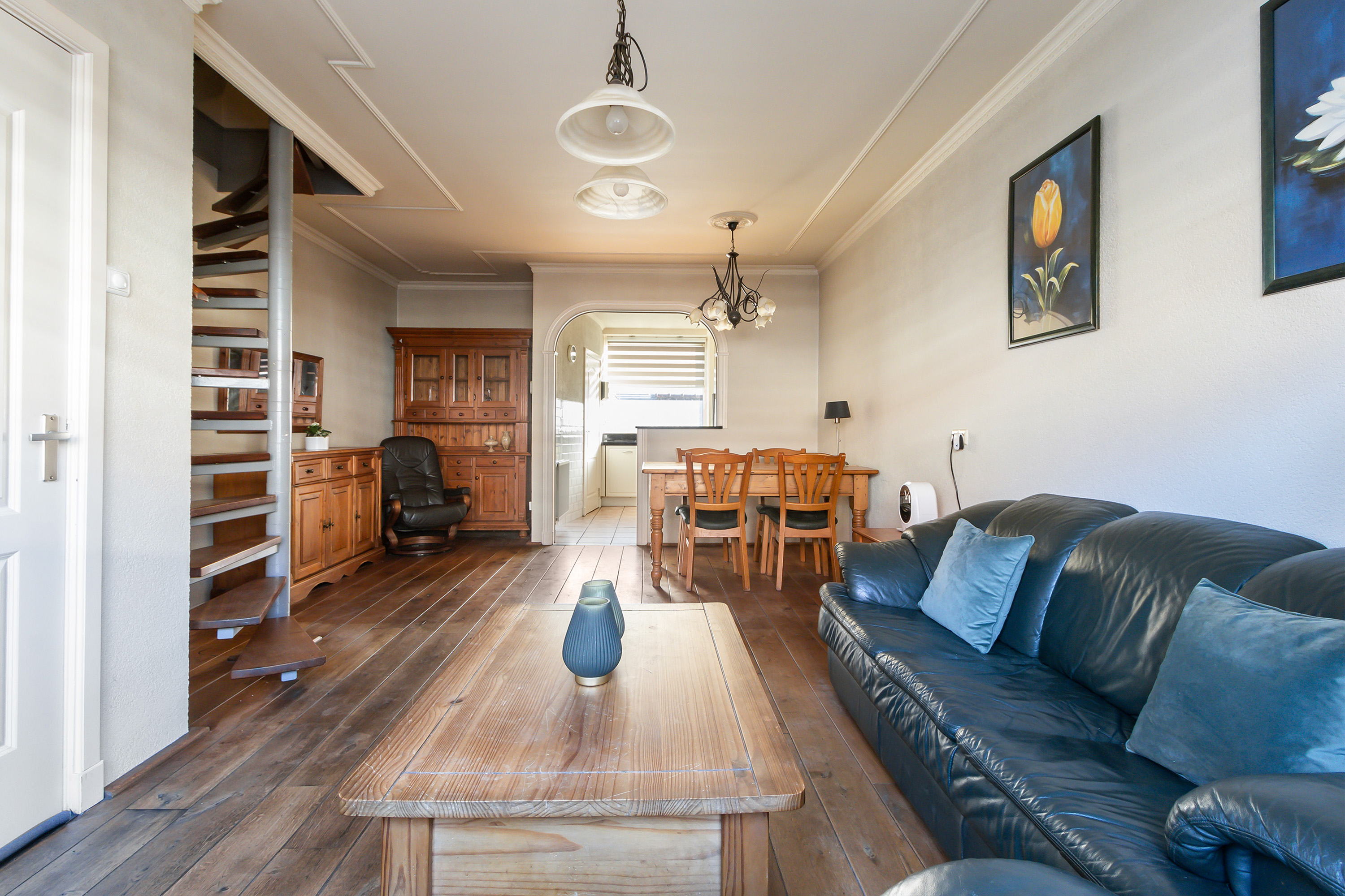 De woning beschikt over een lichte en sfeervolle woonkamer met een fraaie houten vloer en authentieke sierbelijsting op het plafond. In de uitbouw bevindt zich de hoekkeuken, voorzien van diverse inbouwapparatuur. Via de tussenhal bereik je het onlangs gerenoveerde toilet en de interne berging met aansluitingen voor wasmachine en droger. Daarnaast is hier volop ruimte voor het opslaan van voorraad.