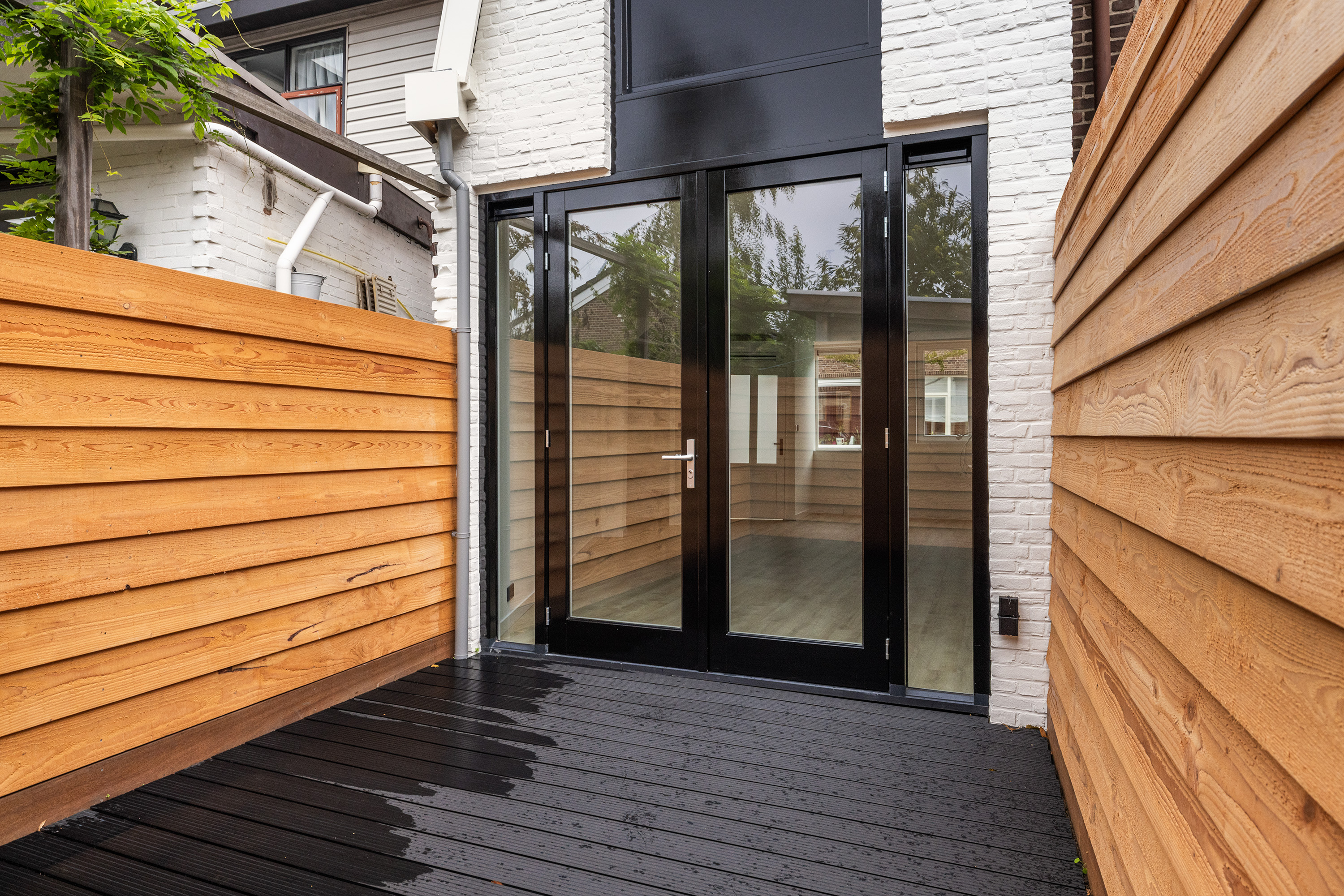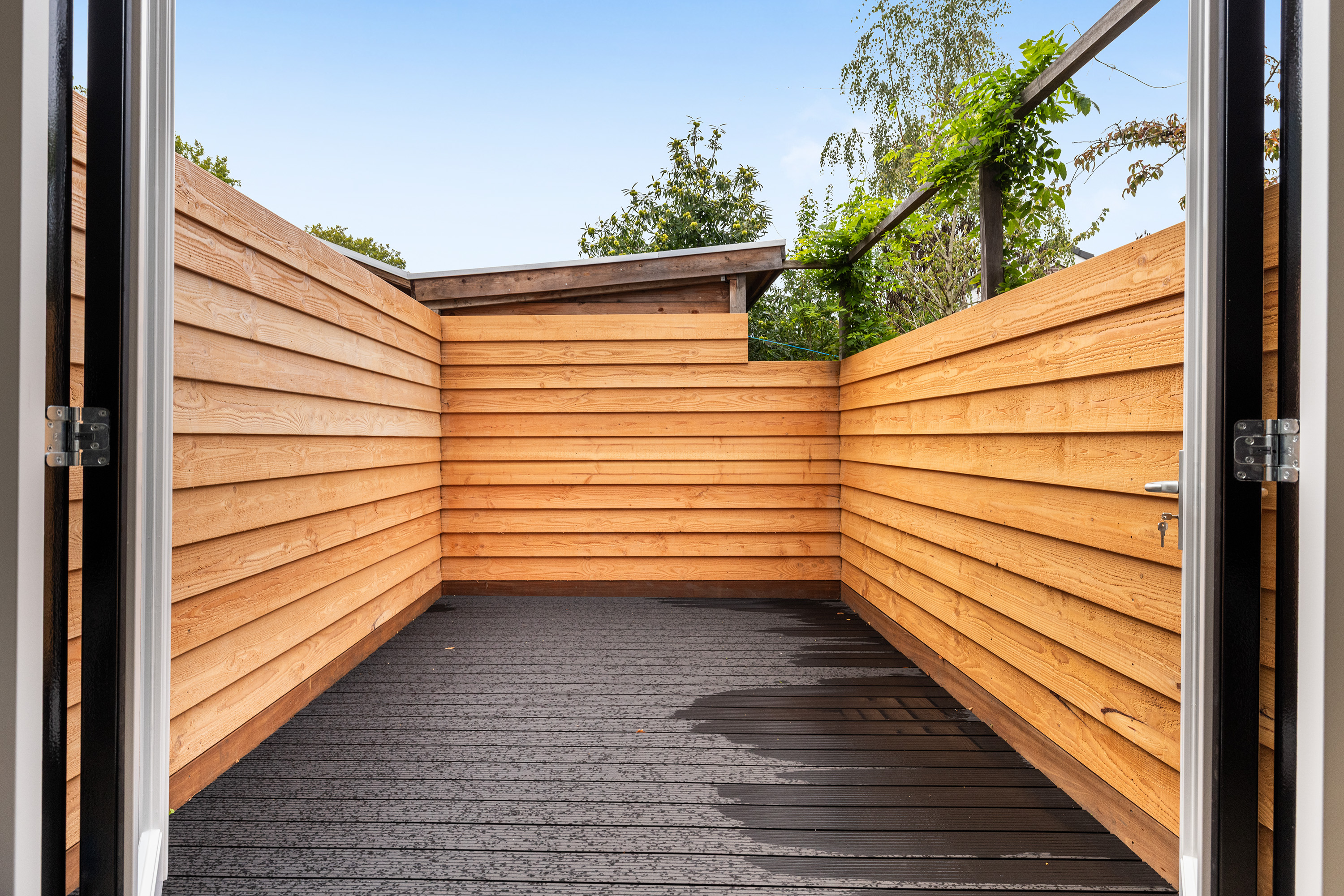 - Besloten achtertuin: ca. 4.48 m. diep en ca. 2.95 m. breed, gesitueerd op het westen. Omheind (schuttingen met gepotdekselde houten delen) en aangelegd met kunststof vlonderdelen. Stroompunten aanwezig.