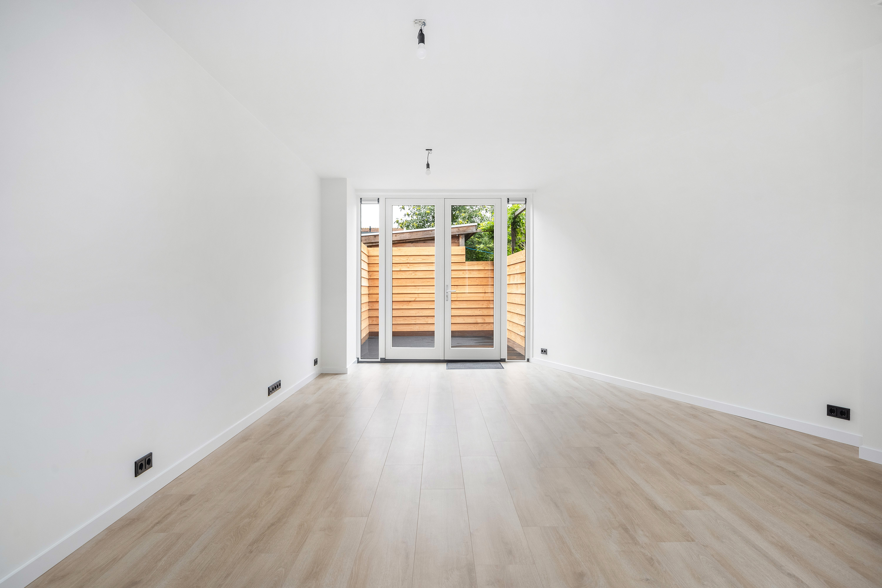 - Begane grond: glad gestucte en wit gesausde wanden. Laminaat vloerafwerking.