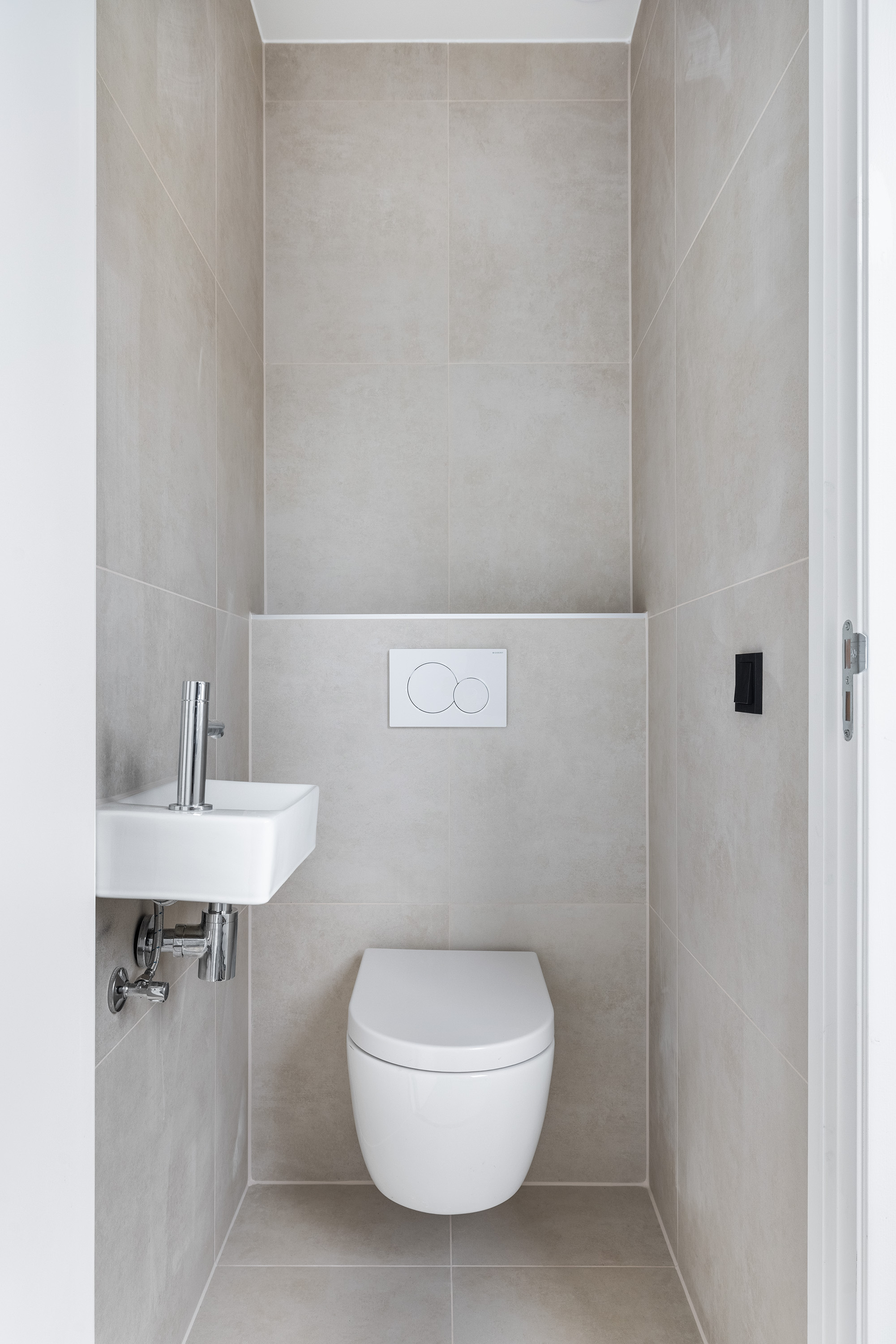 - Modern toilet met geheel betegelde wanden, een plavuizen vloer, wit sanitair, een hangcloset en een fontein;