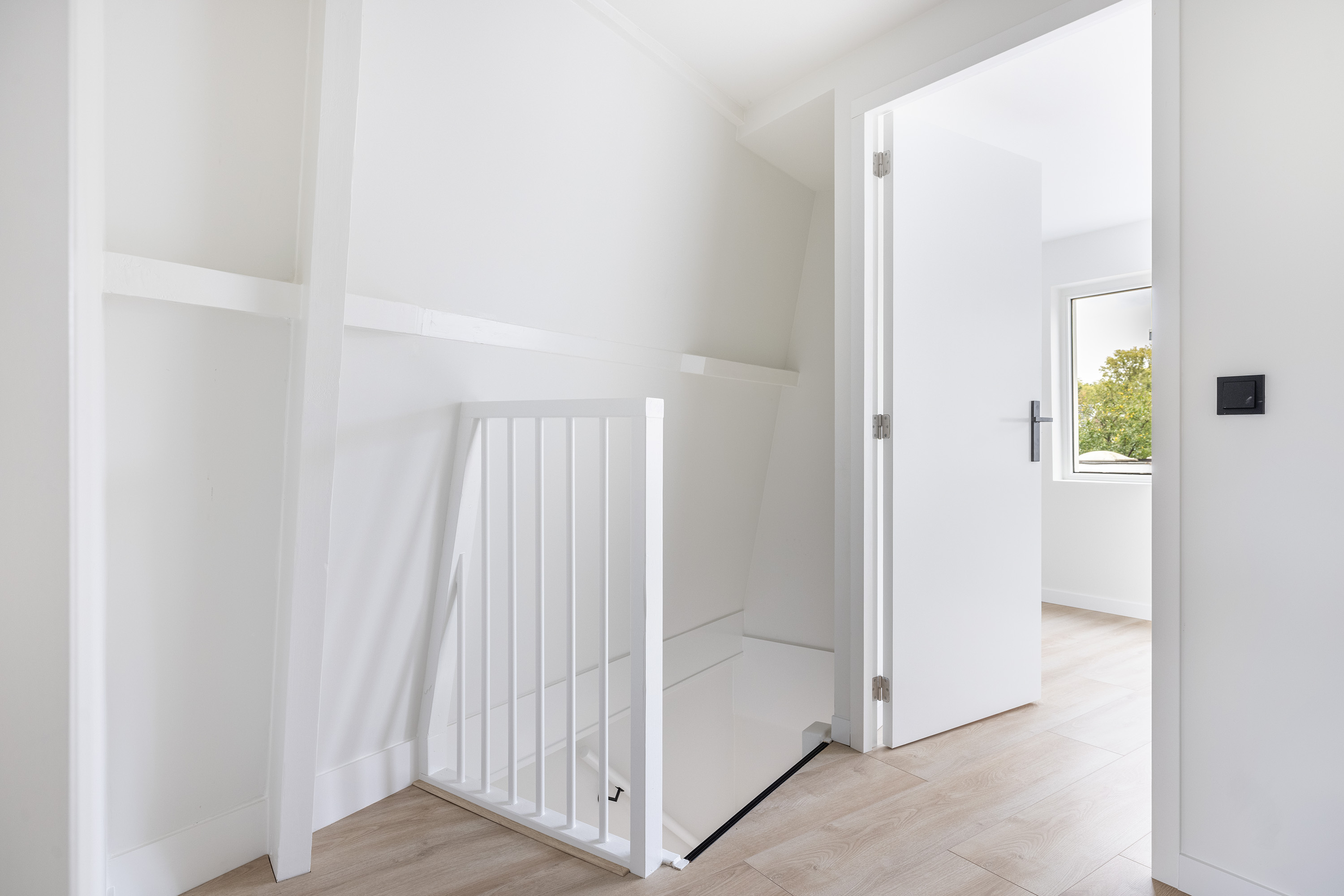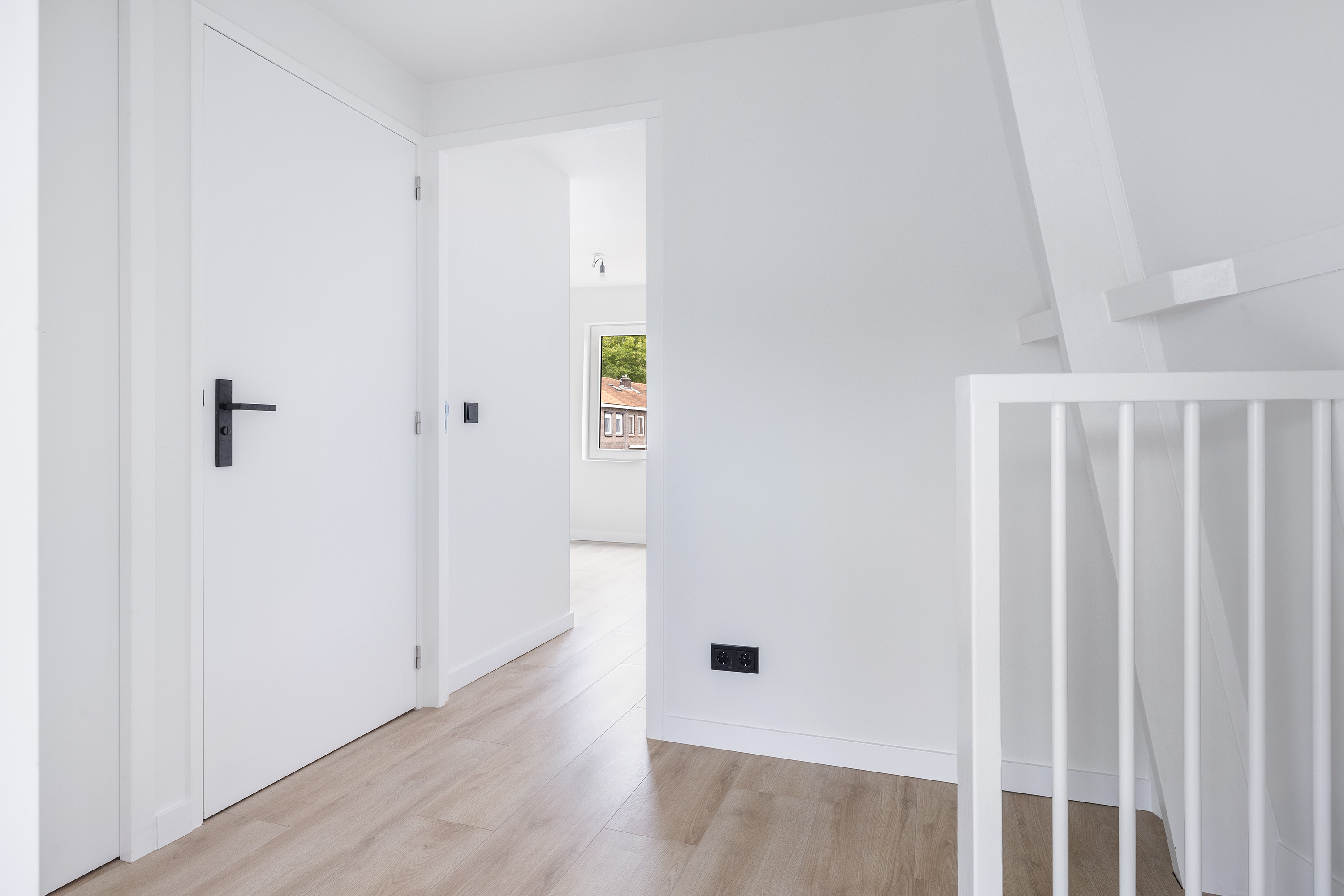 - Verdieping: glad gestucte en wit gesausde wanden. Laminaat vloerafwerking.