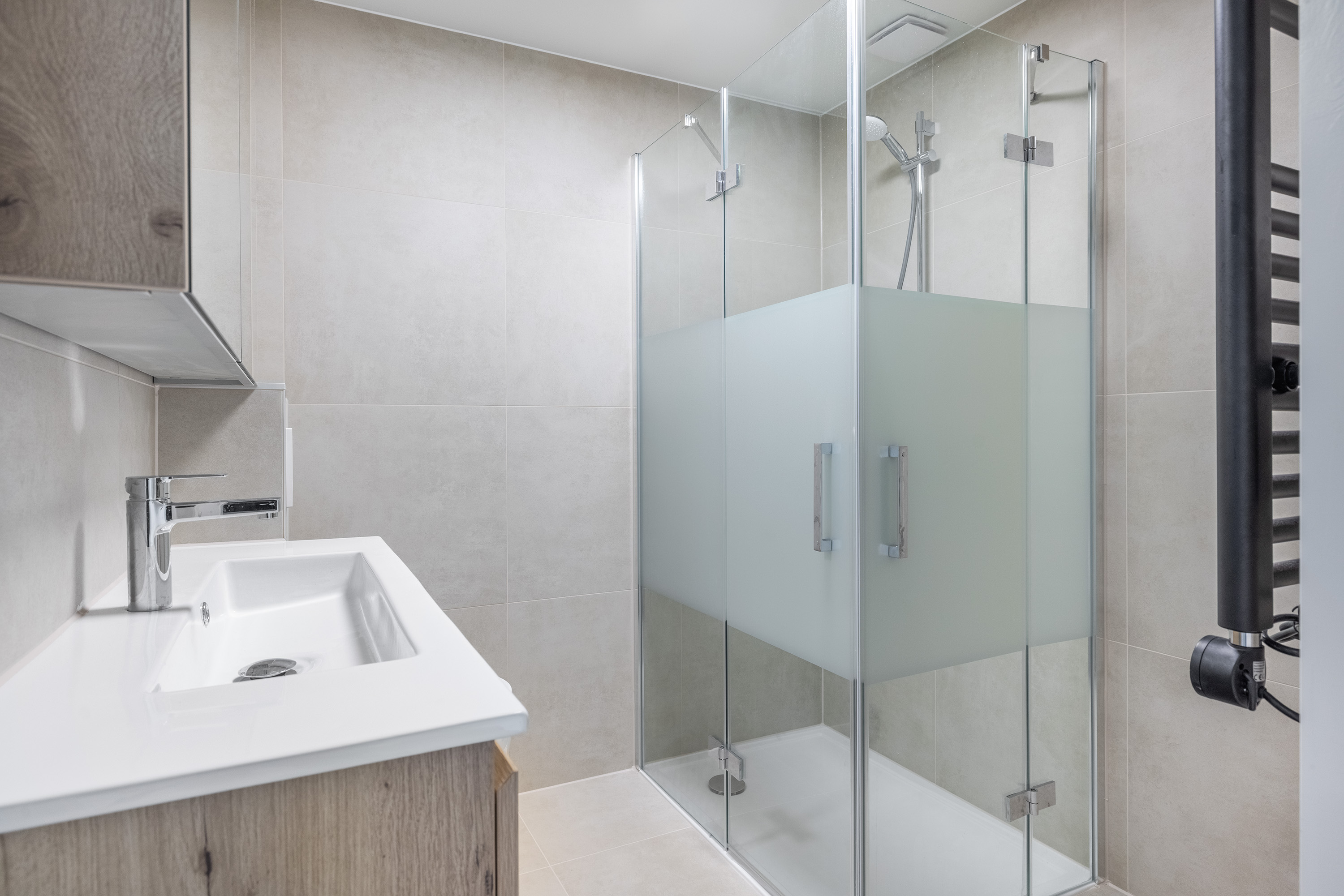 - Moderne badkamer, in het midden van de verdieping met geheel betegelde wanden, een plavuizen vloer, wit sanitair, een wastafelmeubel met spiegelkastcombinatie, een douchecabine, een hangcloset, een elektrische designradiator en de opstelplaats t.b.v. de wasmachine.