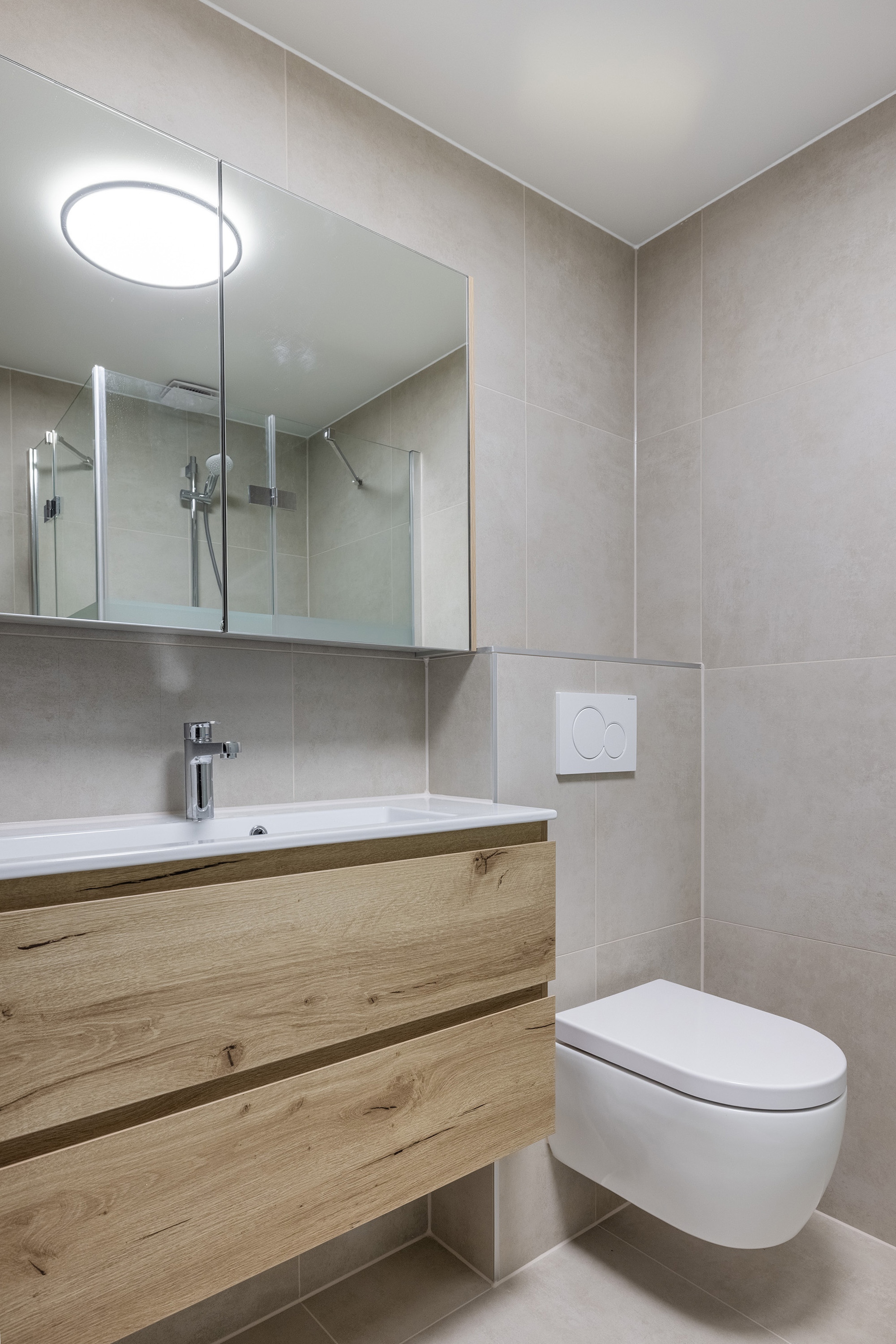 - Moderne badkamer met o.a. een wastafelmeubel met spiegelkastcombinatie, een douchecabine en een hangcloset;