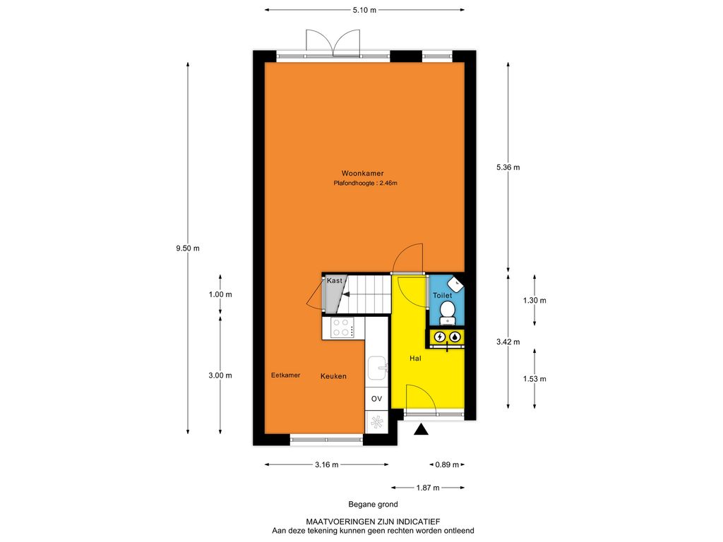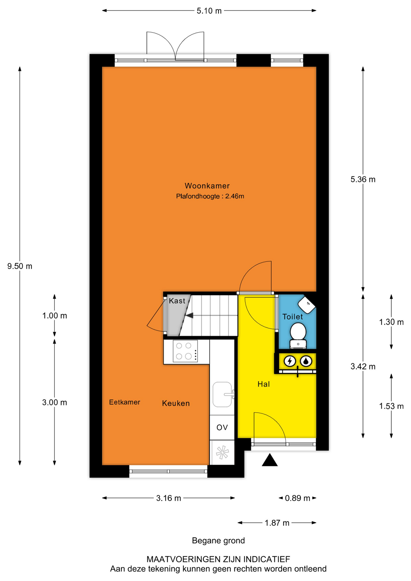 - Entree, hal, meterkast, toilet, trap naar 1e verdieping en deur naar de woonkamer;