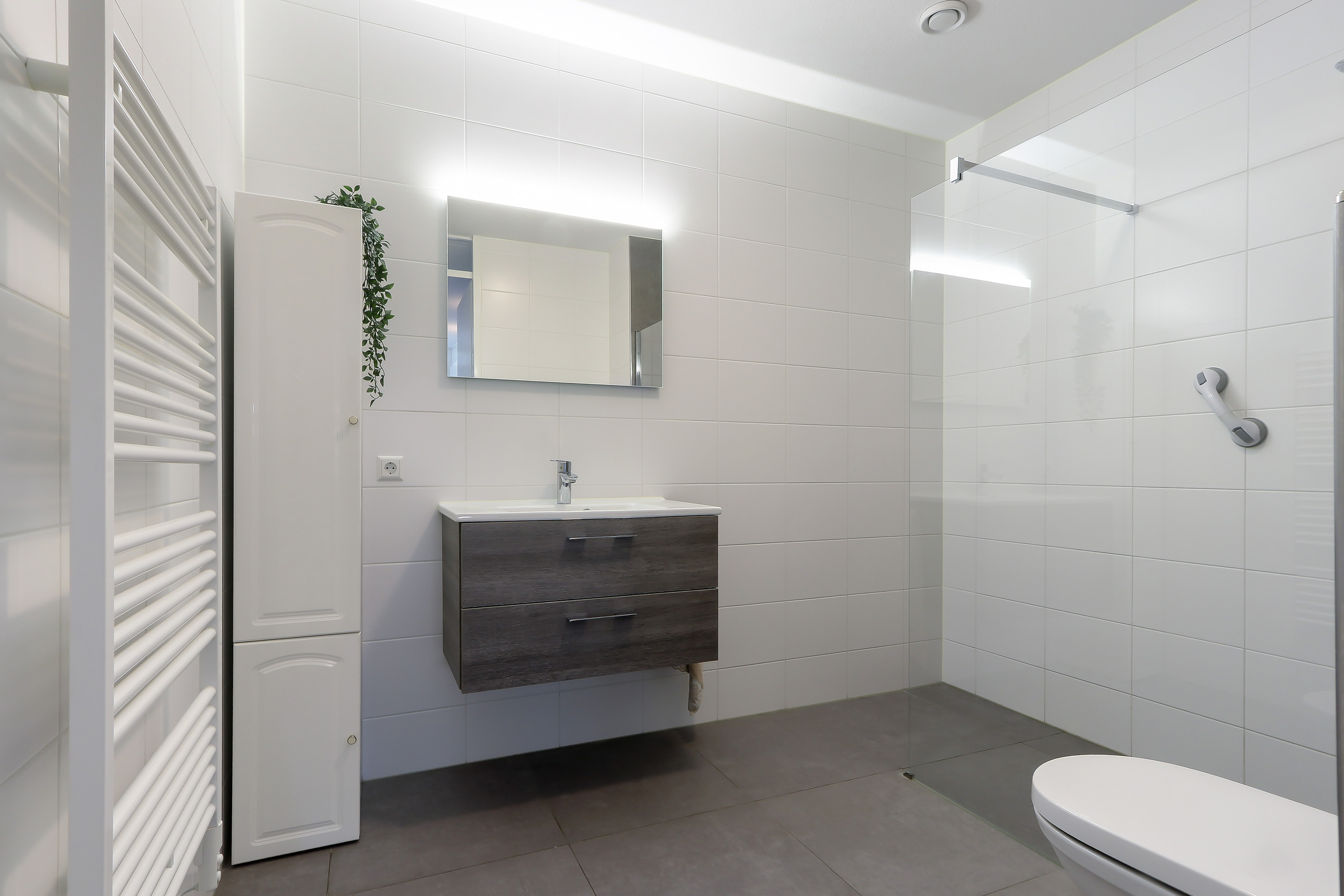 - Moderne badkamer met volledig betegelde wanden, een plavuizen vloer, wit sanitair, een wastafelmeubel met spiegelcombinatie (met verlichting), een inloopdouche met hardglazen scherm, een thermostaatkraan en een drainafvoer, een hangtoilet en een elektrische design radiator;