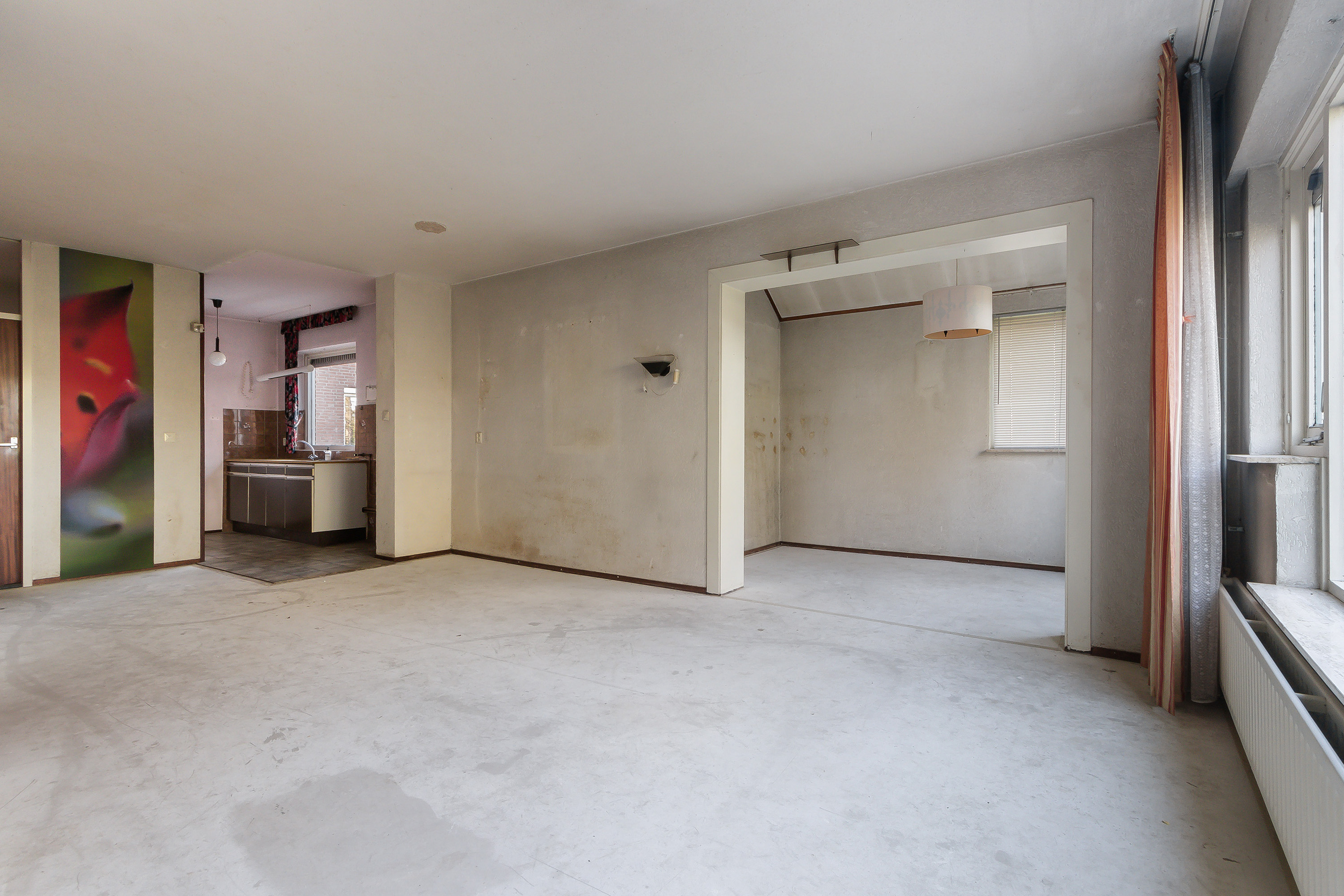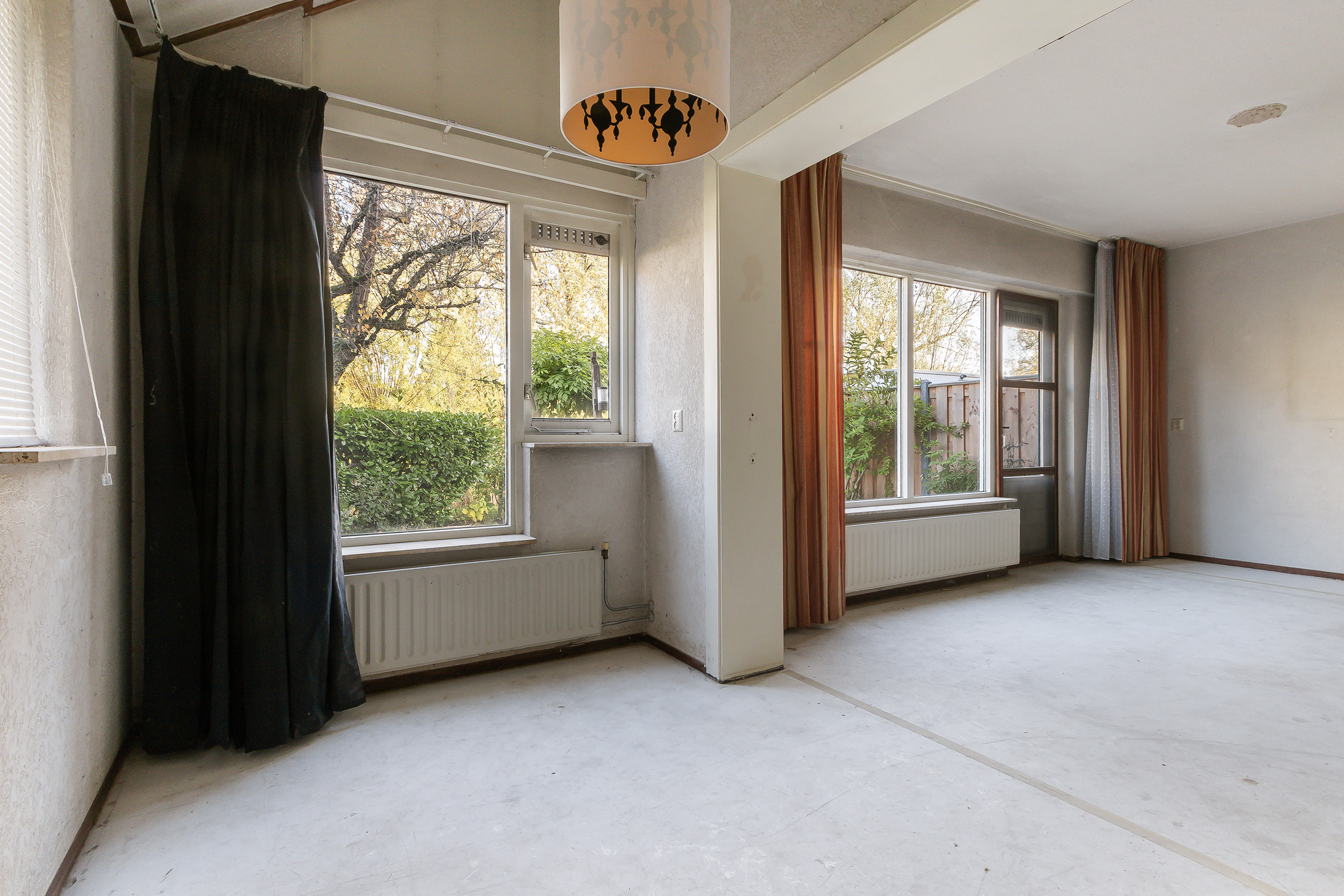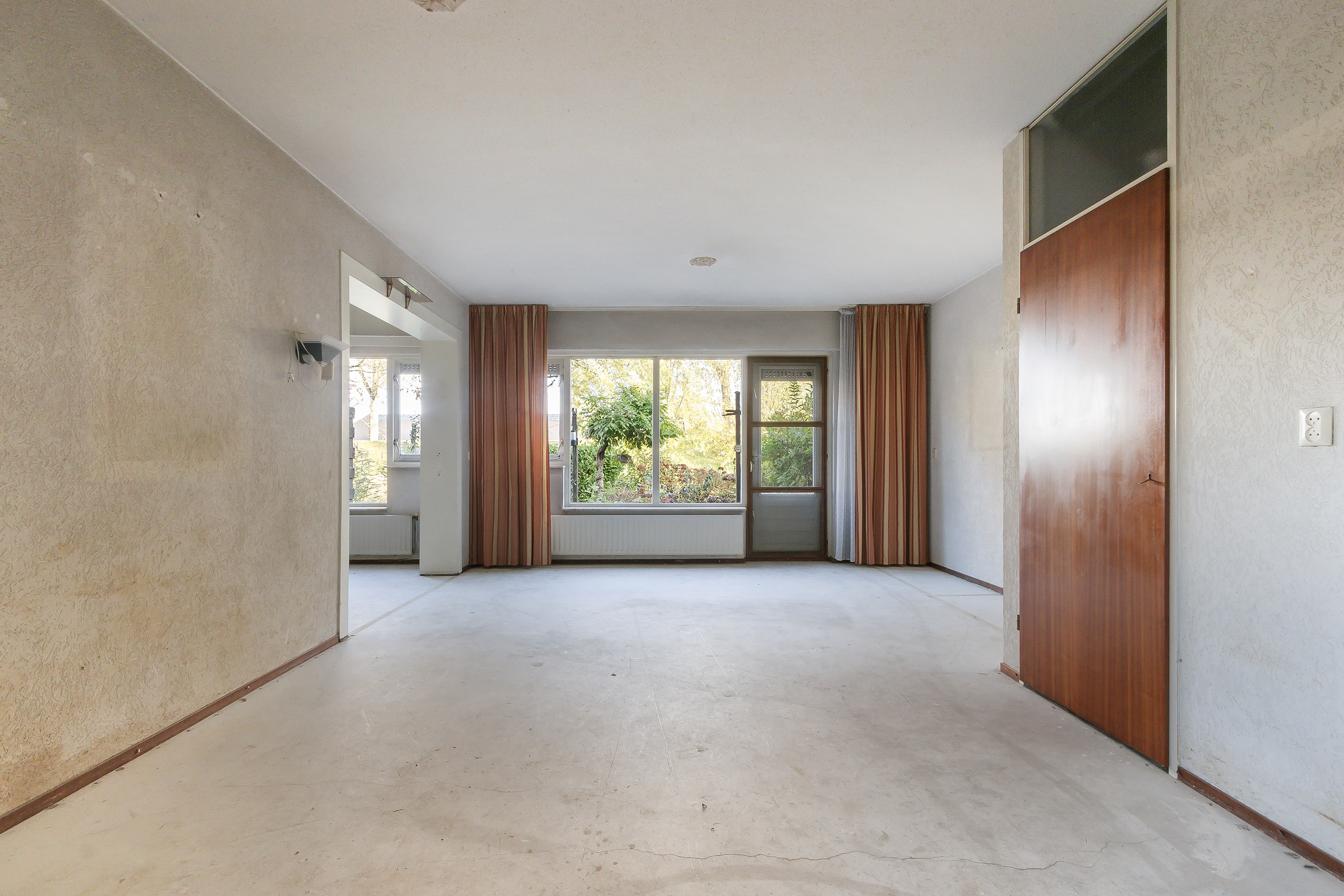 - Tuingerichte, woning brede woonkamer, extra ruim dankzij uitbouw aan de zijkant, trapkast, toegang naar de achtertuin en tot het trappenhuis;
