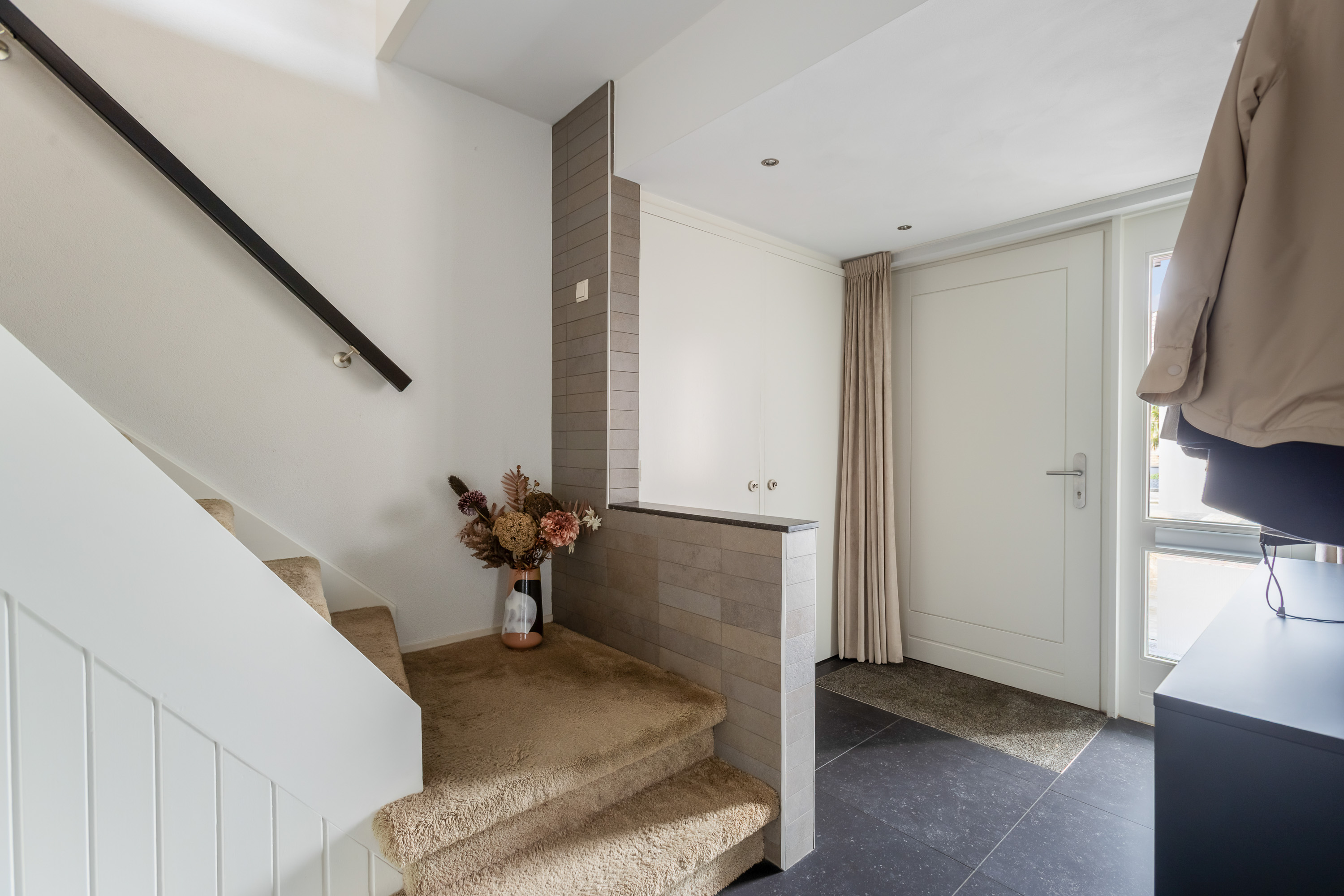 - Entree, ruime hal met meterkast, een garderobe met praktische schoenen opbergkast, een extra vaste kast, deur naar de woonkeuken, een toilet en de trap naar de 1e verdieping i.c.m. een trapkast;