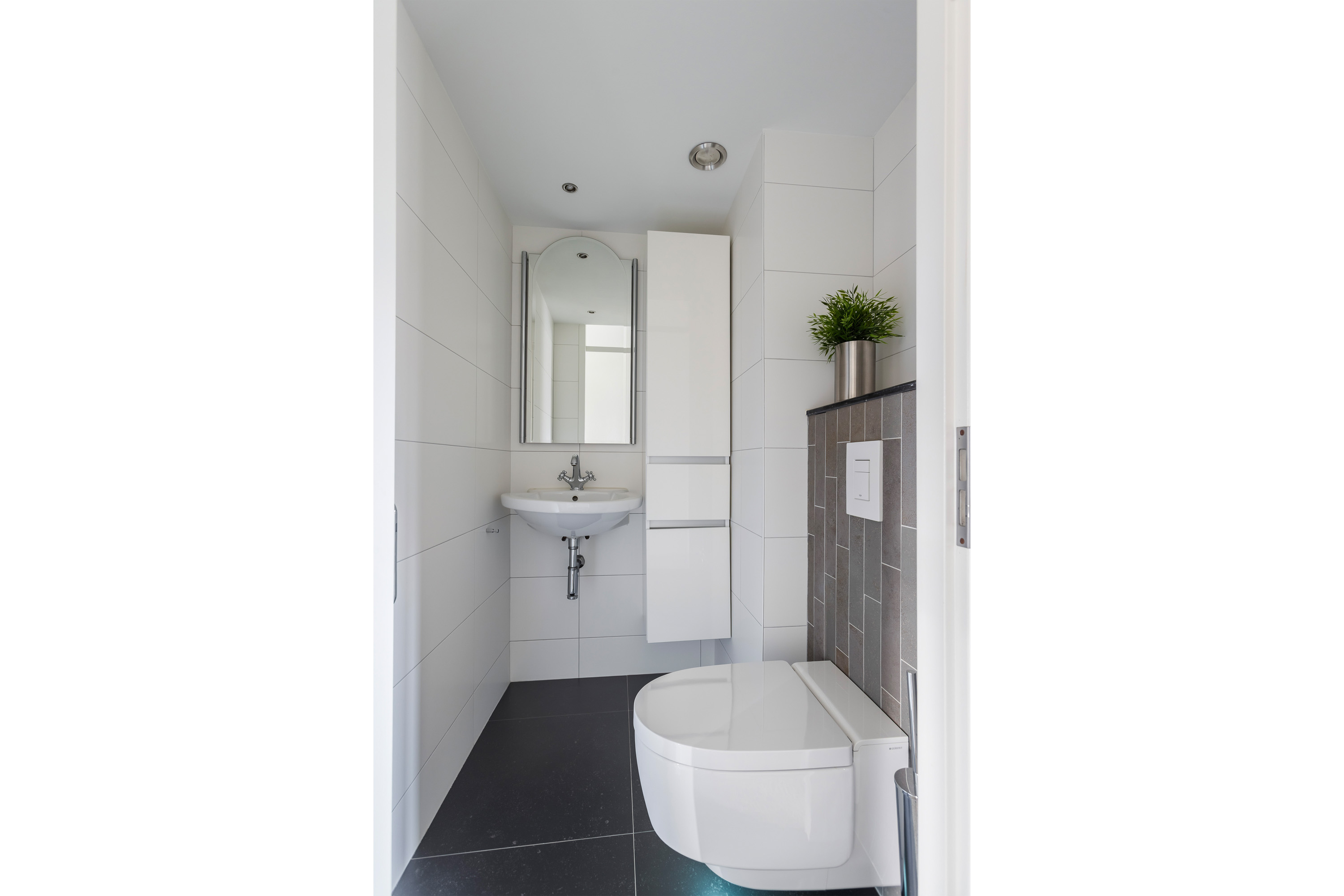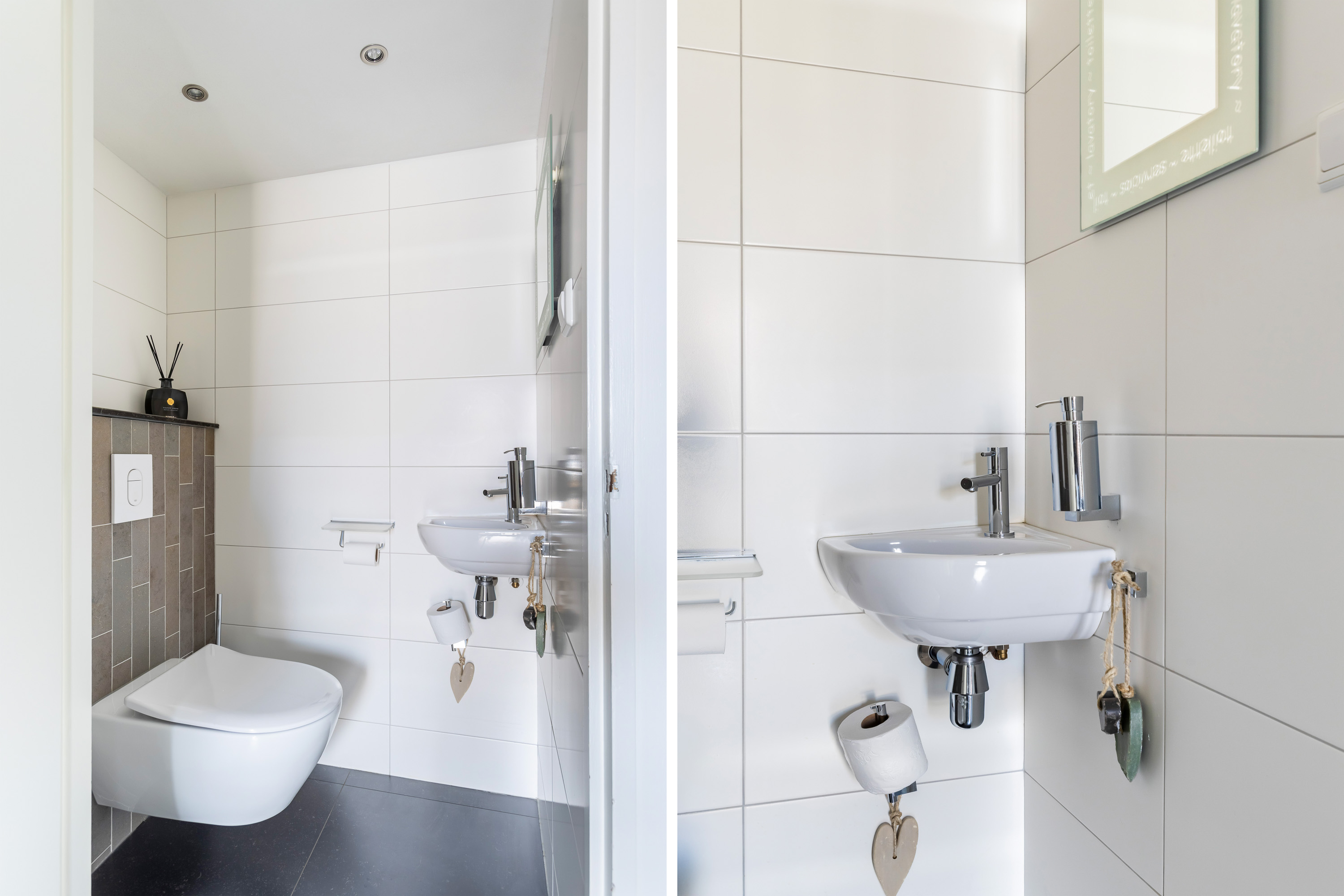 - Separaat modern toilet met geheel betegelde wanden, wit sanitair, een hangtoilet en een fontein;