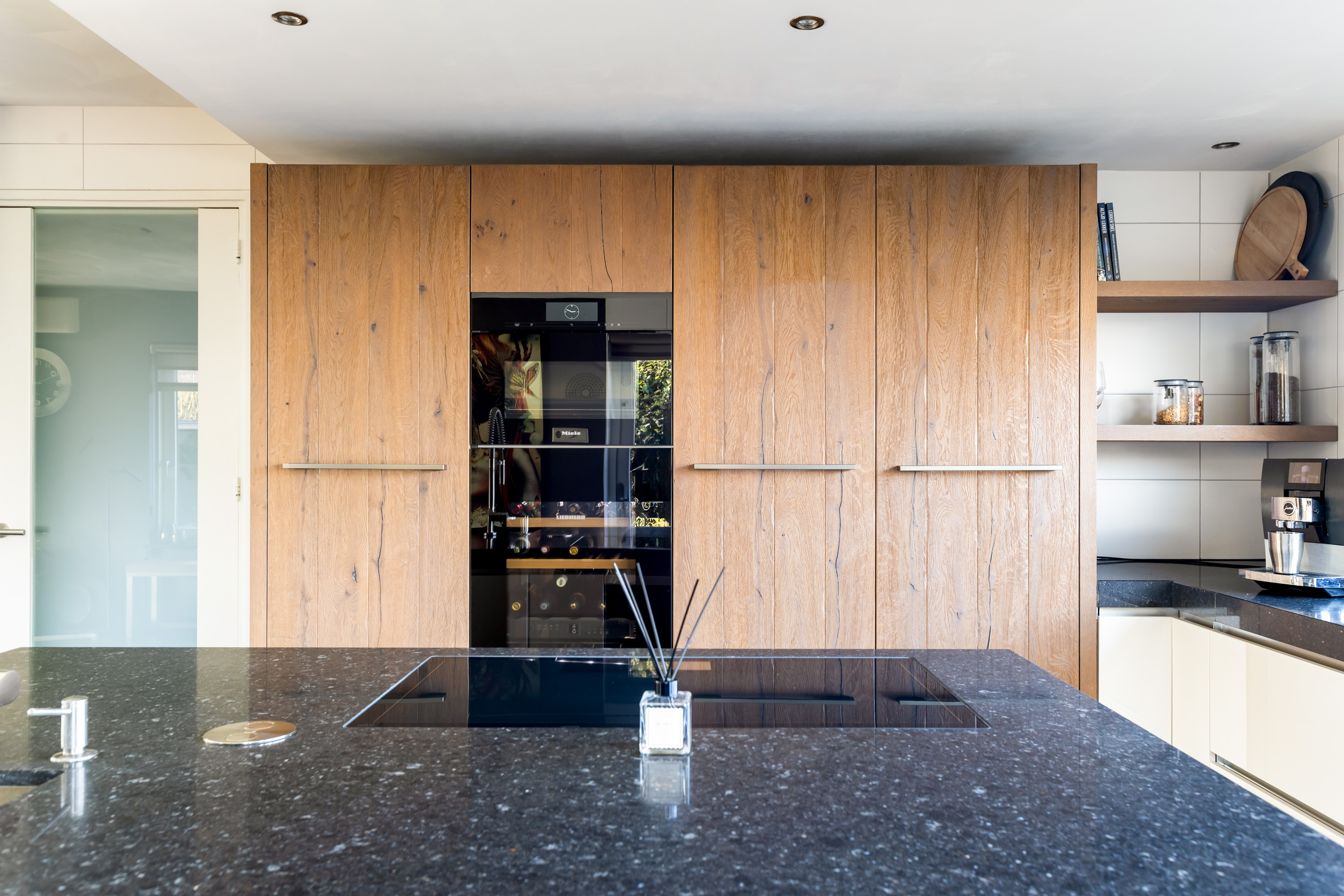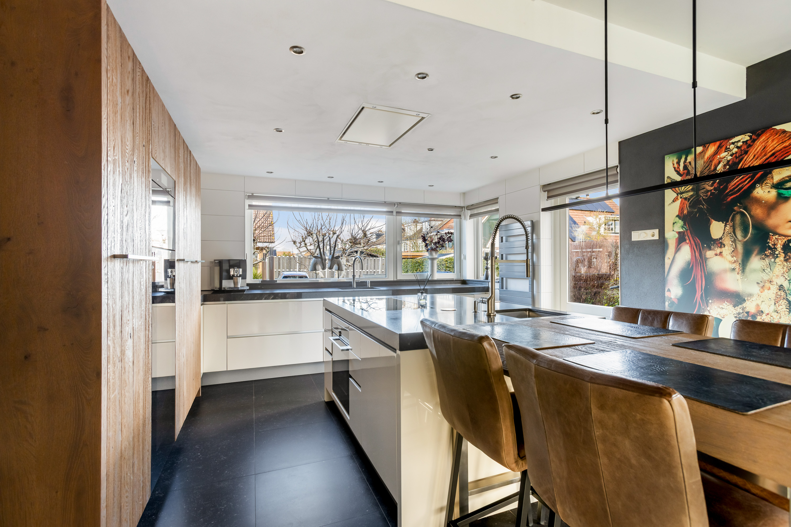 - Magnifieke open woonkeuken van Belmar in riante hoekopstelling met een spoel-/ kookeiland met composiet hardsteenlook werkblad met 2 spoelbakken, veel kastruimte (o.a. een carrouselkast) en laden met hoogwaardige houtfineer fronten en topapparatuur, waaronder een Novy in het plafond geïntegreerde afzuigunit, een Siemens flexinductie-kookplaat, een XXL-oven, 2 vaatwassers, een Liebherr wijnklimaatkast XXL, een koel-/vriescombinatie (Miele) en een combi-steamer (stoomoven, Miele). Extra praktische spoelbak. Kortom een droomkeuken voor iedere sterren chef! De keuken is uitgebouwd aan de voorzijde vanuit de bouw en voorziet in een praktische zijdeur, handig om de boodschappen gelijk binnen te zetten.