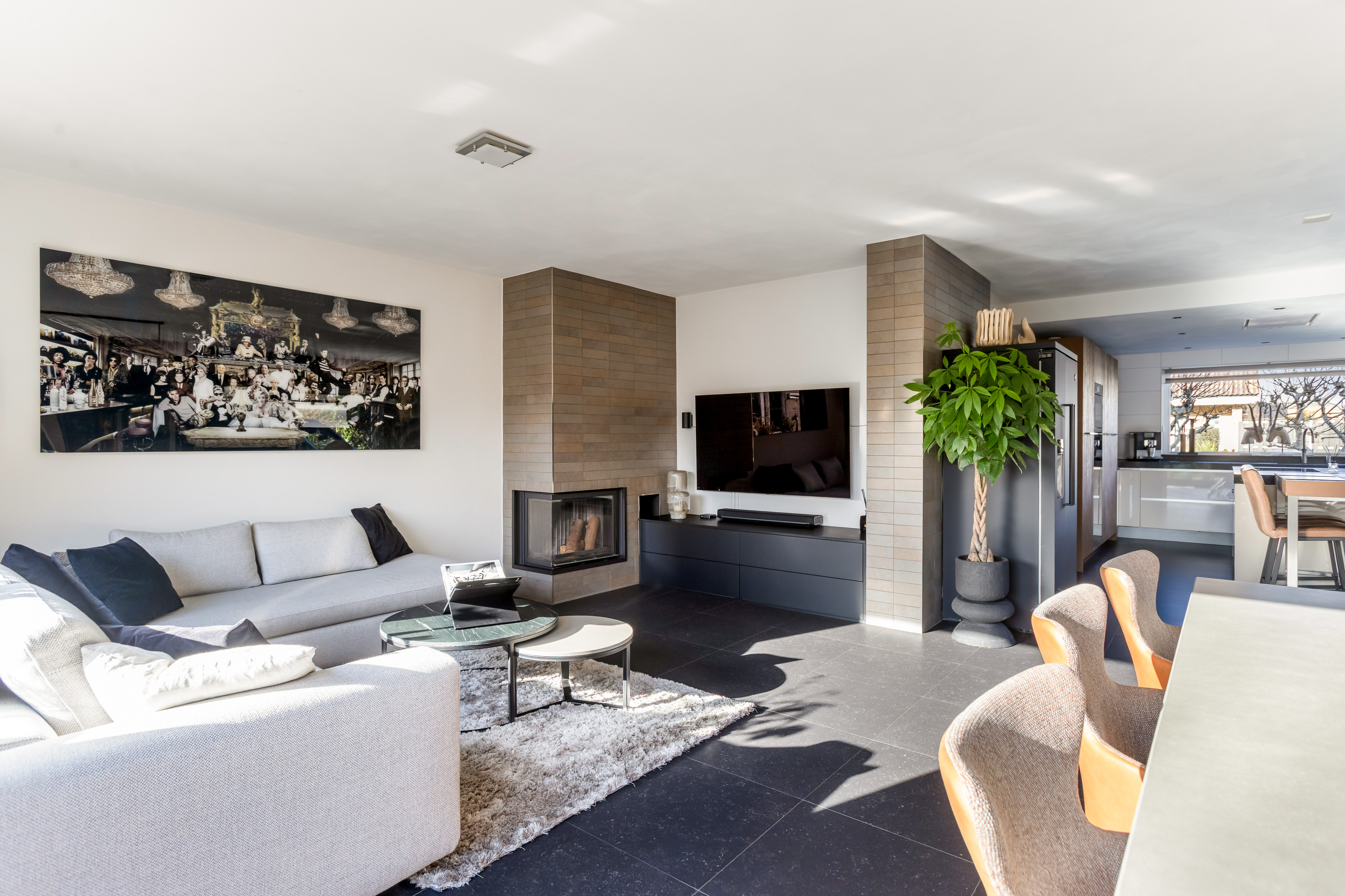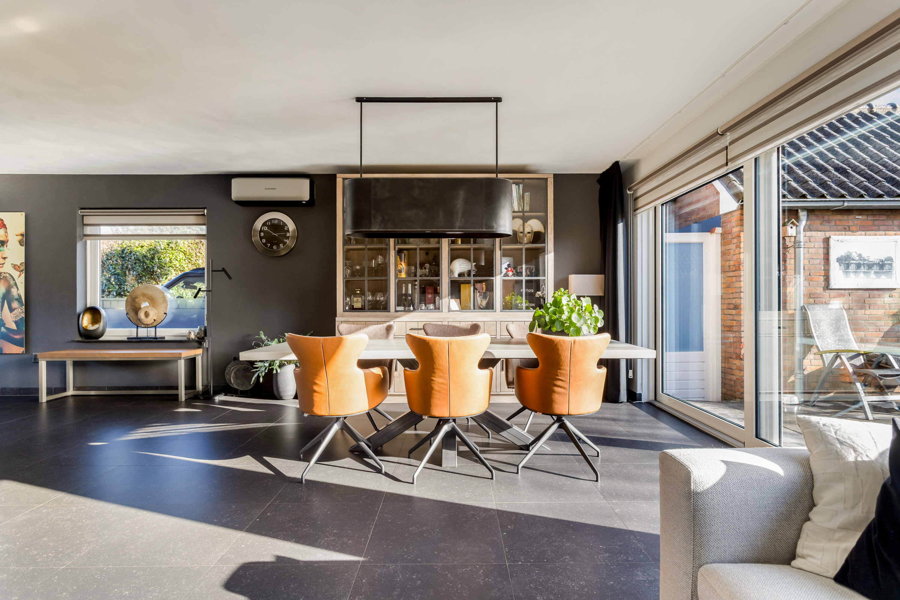 - Ruime en gezellige tuingerichte woonkamer met strakke moderne open haard, een zeer recent geplaatste aluminium schuifpui (2025) en een elektrisch zonnescherm over de volledige breedte van de woning. De chique Belgisch hardsteen look keramische tegelvloer loopt hier vanuit de woonkeuken door. De woonkamer biedt genoeg ruimte voor diverse inrichting ideeën. Boven de huidige eettafelopstelling hangt een luxe en decoratieve Wave design afzuigkap, een leuke eye-catcher. De woonkamer is ge-airconditioneerd.