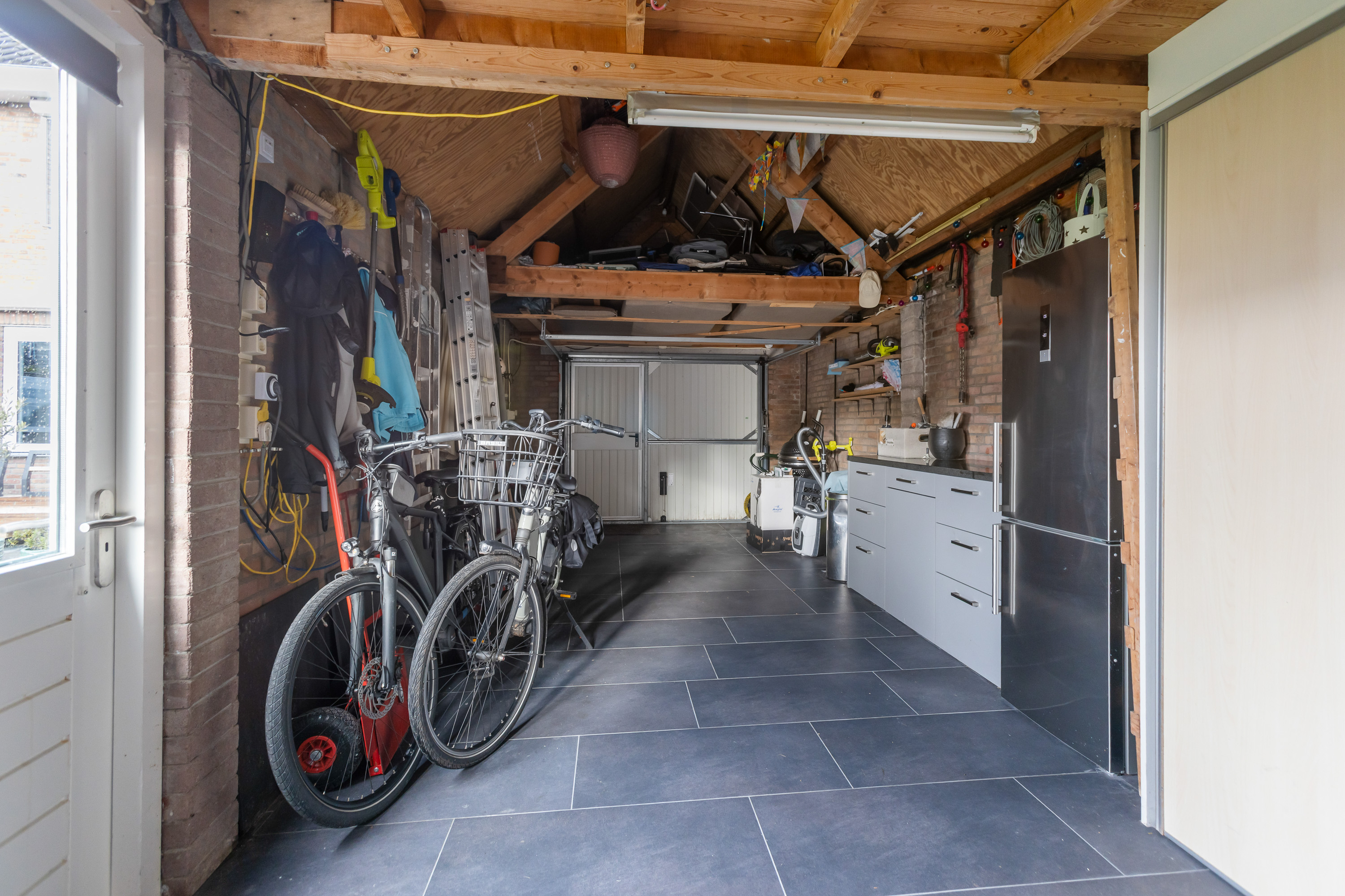 - Zeer ruime, onderheide gemetselde garage met pannendak van ca. 8,83 x 3,45 meter met een nokhoogte van maar liefst 3,78 meter. De garage is voorzien van een mooie plavuizen vloer, een stalen kanteldeur met geïntegreerde loopdeur, een bergvliering, een pantry met o.a. een grote koelkast en een vriezer, een royale schuifdeurkast en water- en elektravoorziening.
