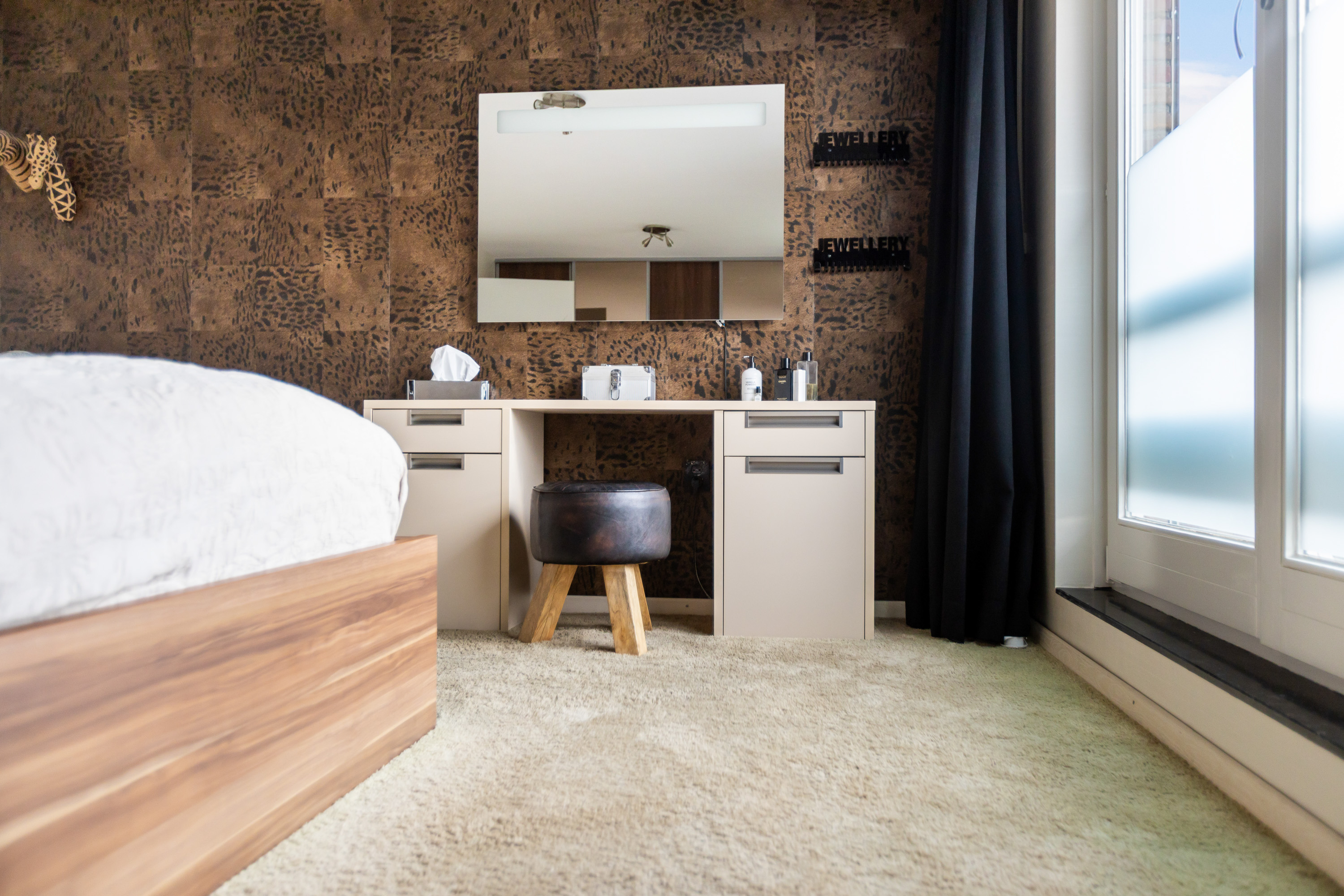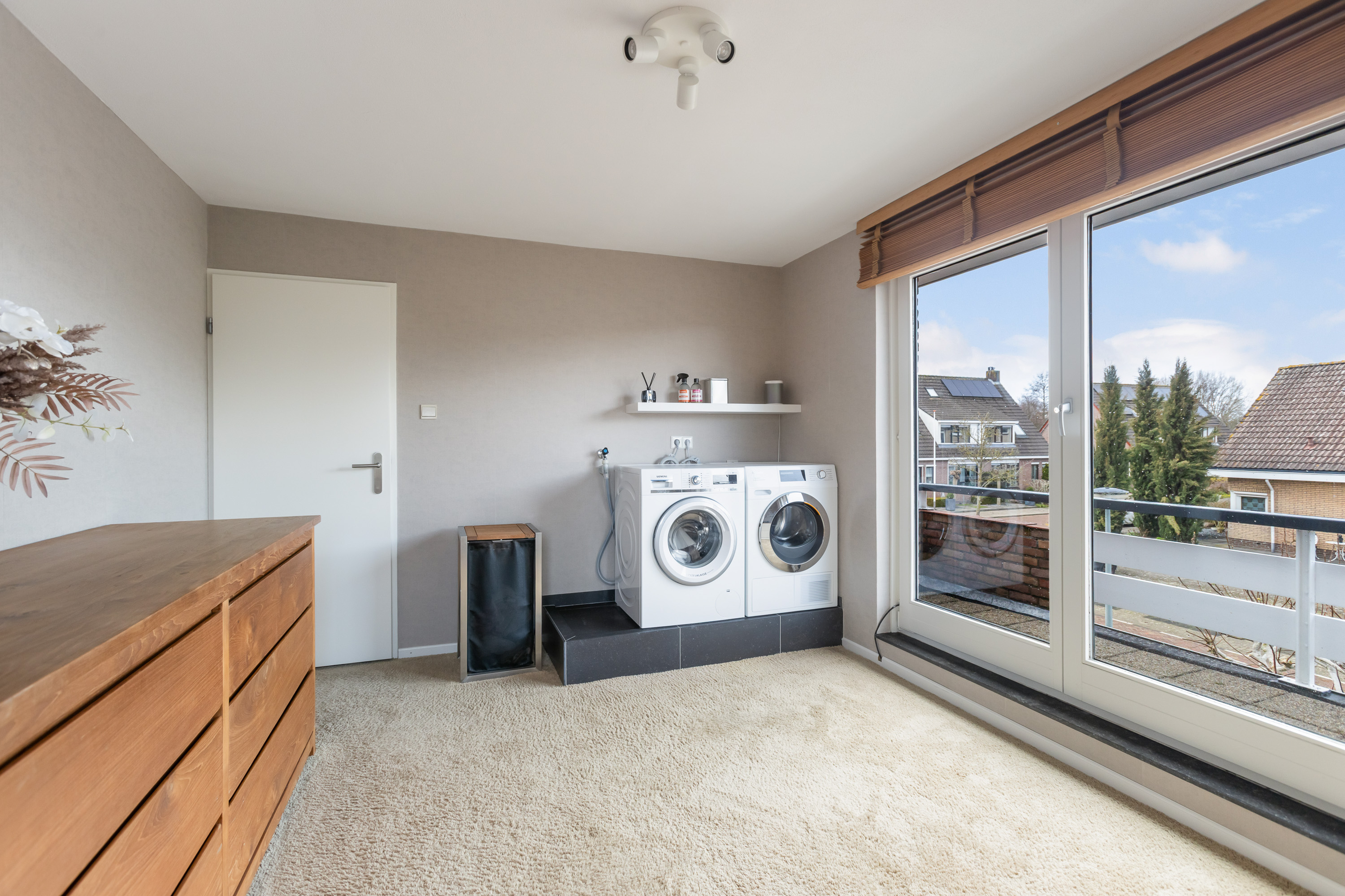 - Slaapkamer 2, gelegen aan de voorzijde met zijraam en dubbele deur naar balkon. Deze slaapkamer doet nu dienst als luxe was-/ werkruimte (ca. 4.10 m. x 3.27 m.);