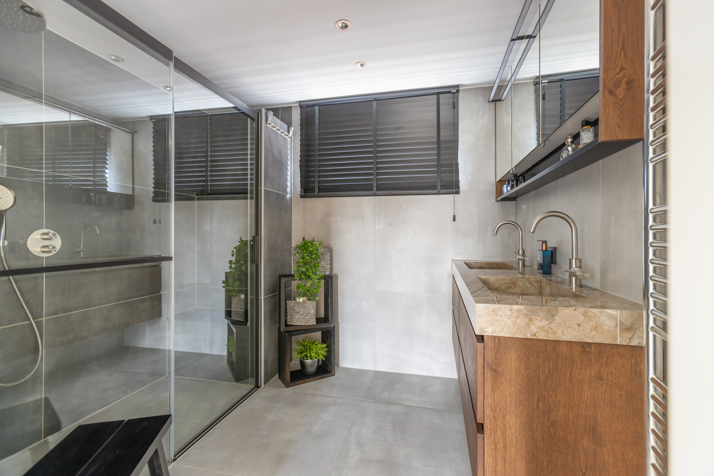 - Moderne badkamer 2, gelegen aan de achterzijde met geheel betegelde wanden, een tegelvloer, wit sanitair, een wastafelmeubel met RVS look kranen en een spiegelkast, een douchecabine met een Sunshower en een designradiator.