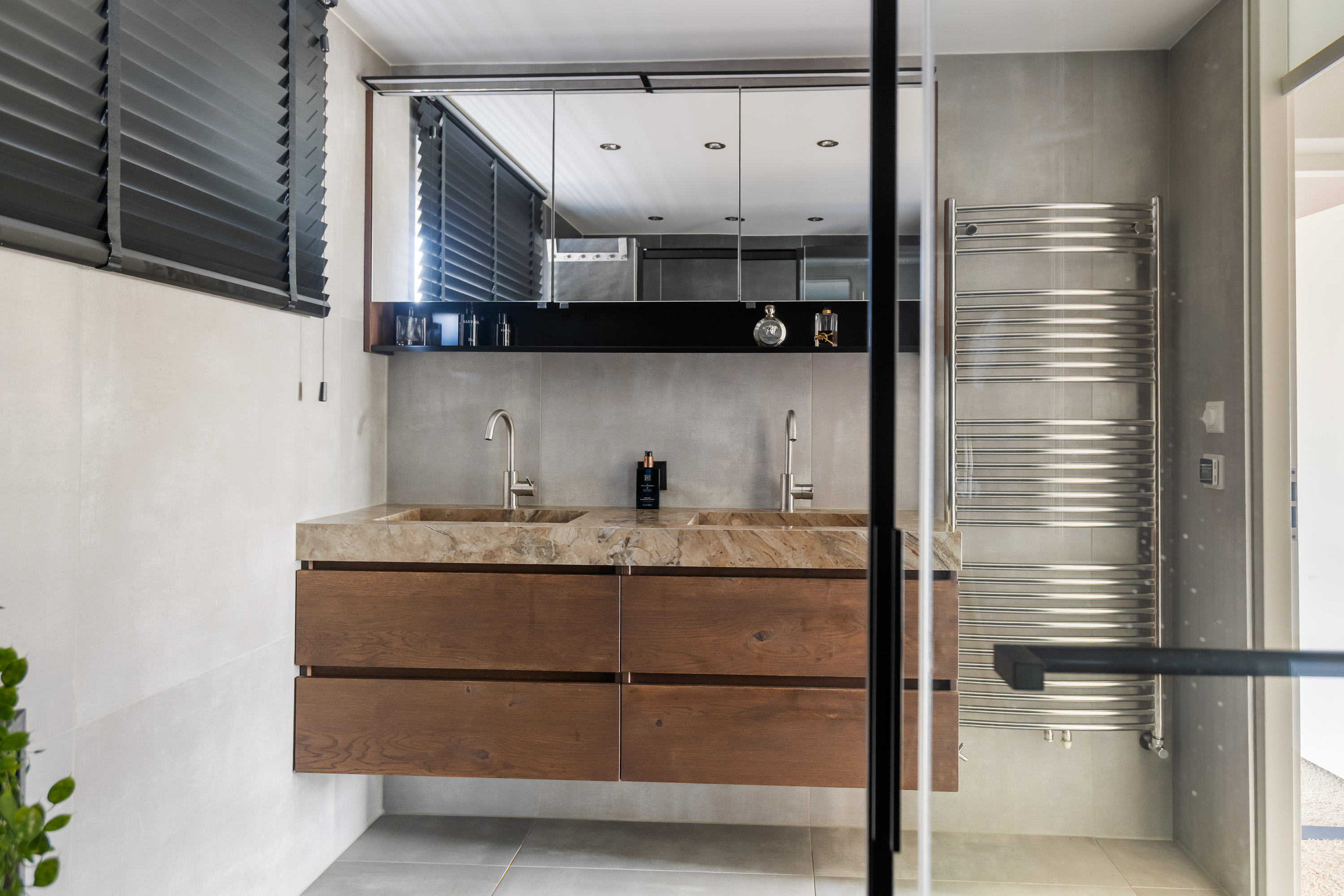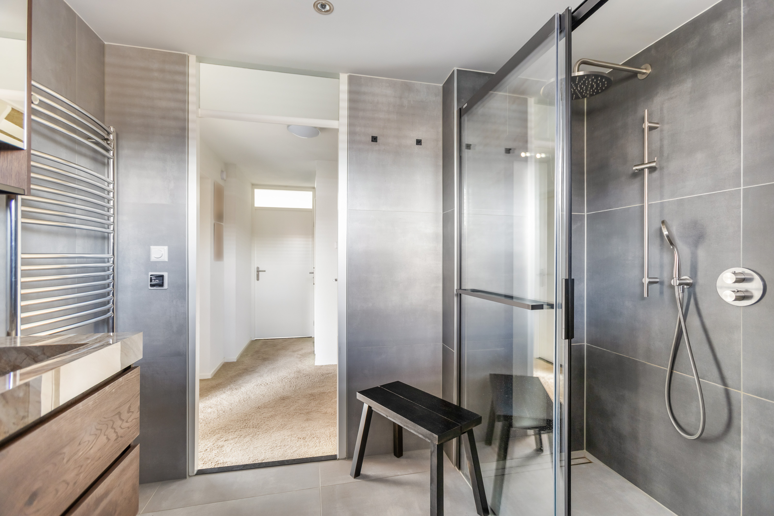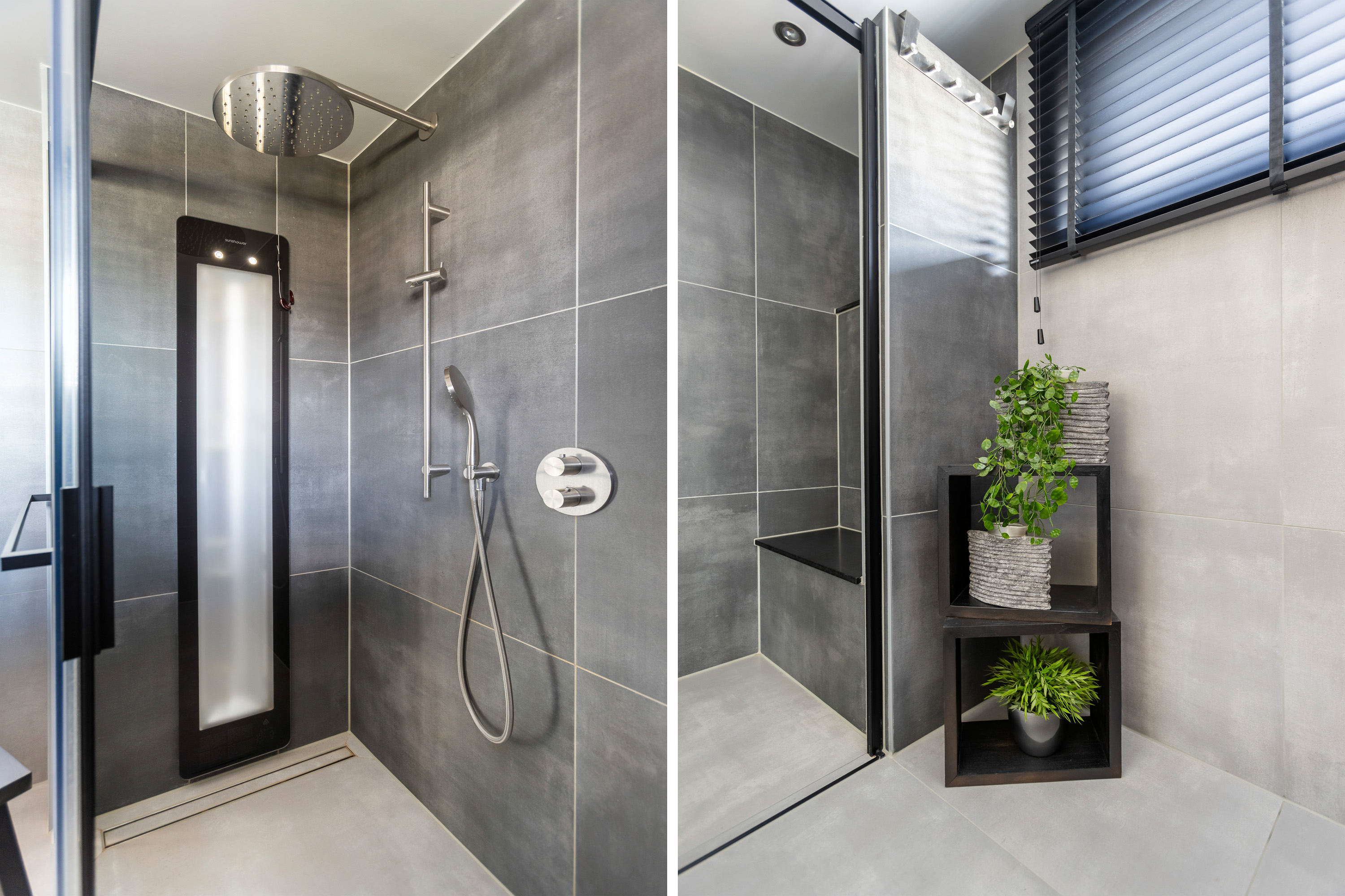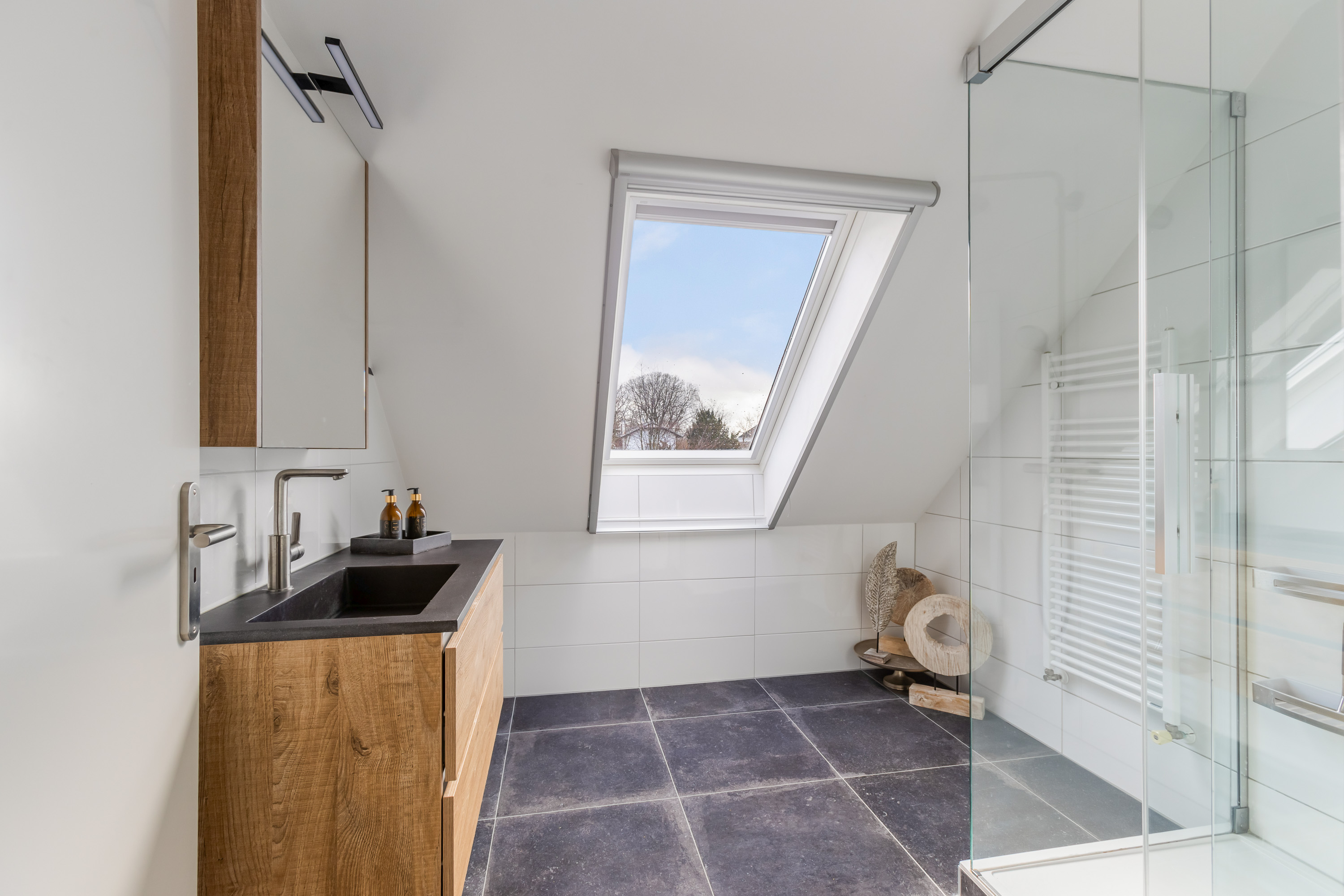 - Luxe badkamer 1 (2024), gelegen aan de voorzijde, volledig gerenoveerd en uitgevoerd in een stijl die doet denken aan een vijfsterrenhotel. Geheel betegelde wanden en een 80 x 80 cm tegelvloer met elektrische vloerverwarming. Voorzien van een houtfineer wastafelmeubel met dubbele waskom, RVS 316 (inbouw)kranen en een spiegelkastcombinatie met dim bare verlichting, een heerlijk royale inloopdouche met hoofd- en handdouche (RVS 316), een XXL Sunshower om te ontspannen en een designradiator.