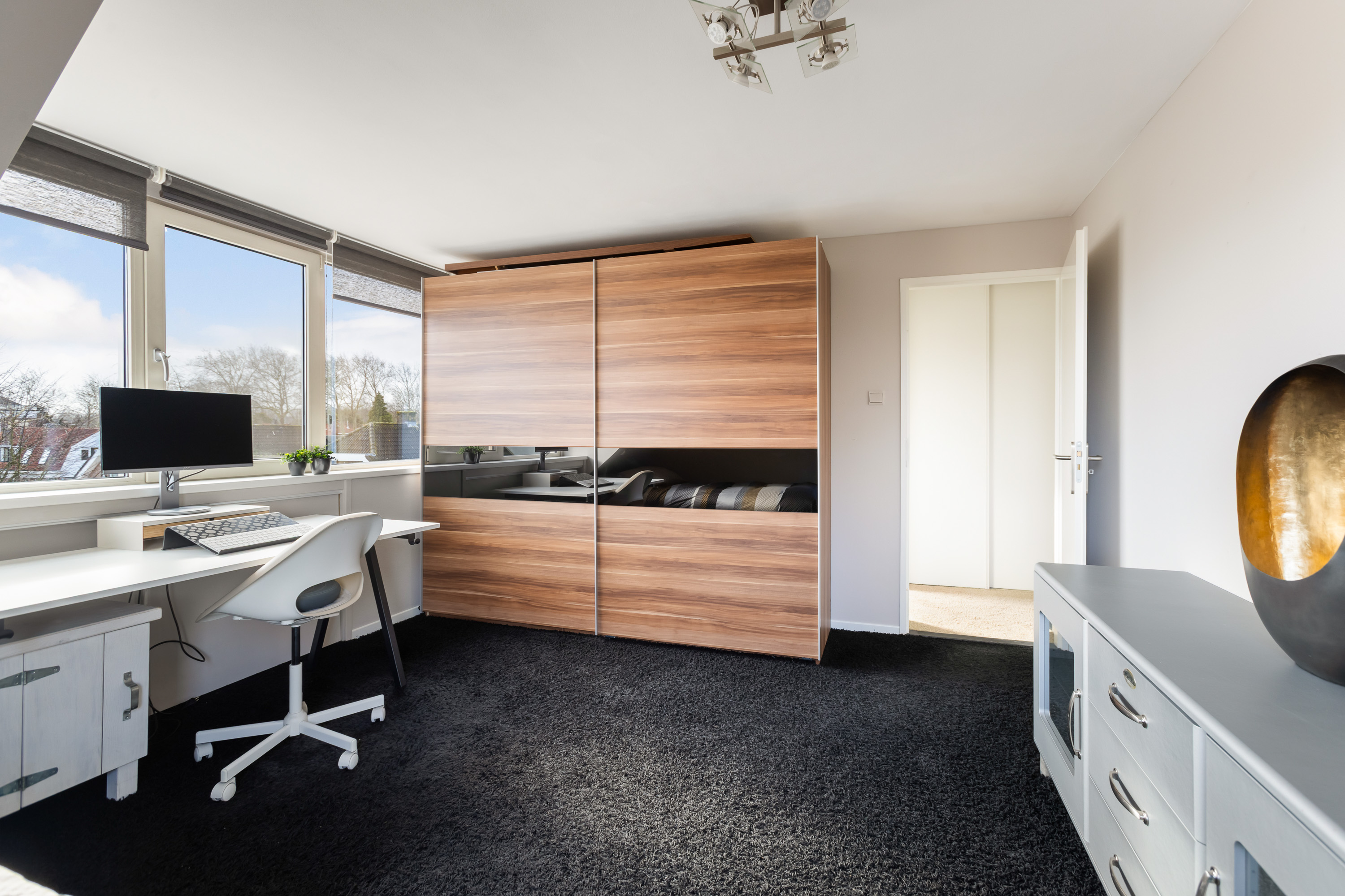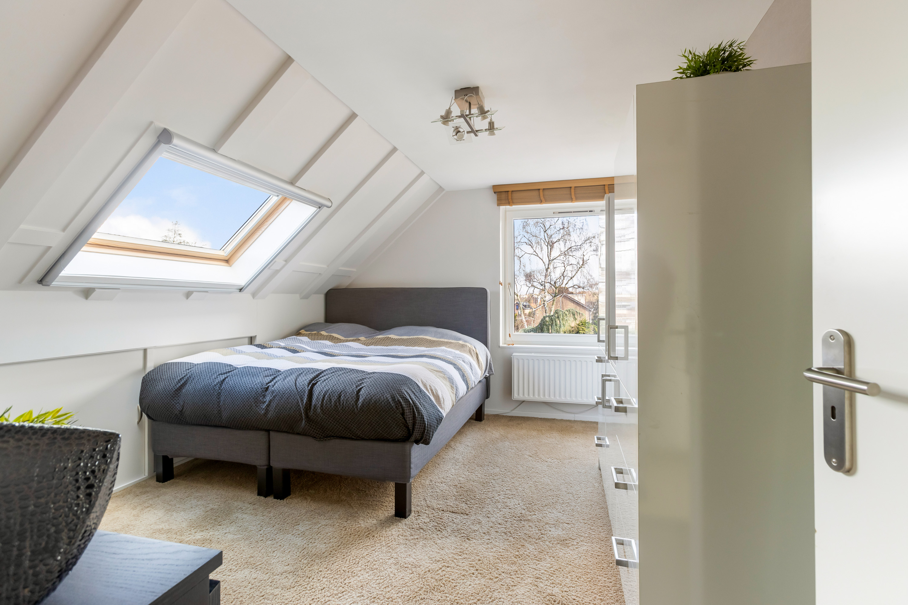 - Slaapkamer 4, gelegen aan de achterzijde, voorzien van een grote dakkapel met rolluiken, knieschotten voor extra bergruimte en een zijraamkozijn (ca. 4.25 m. x 3.79 m.);