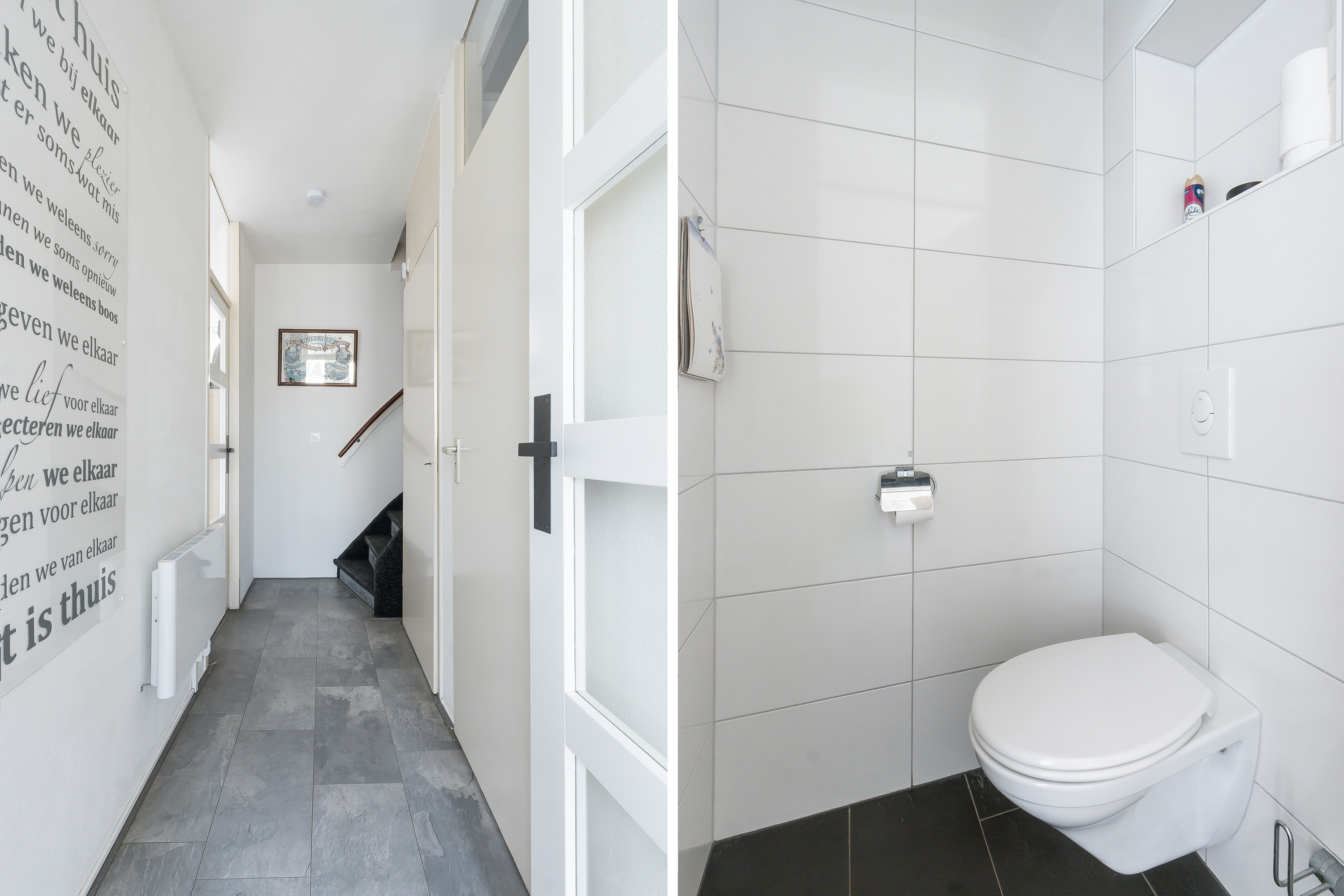 - Toiletruimte, met geheel betegelde wanden, een plavuizen vloer en wandcloset;