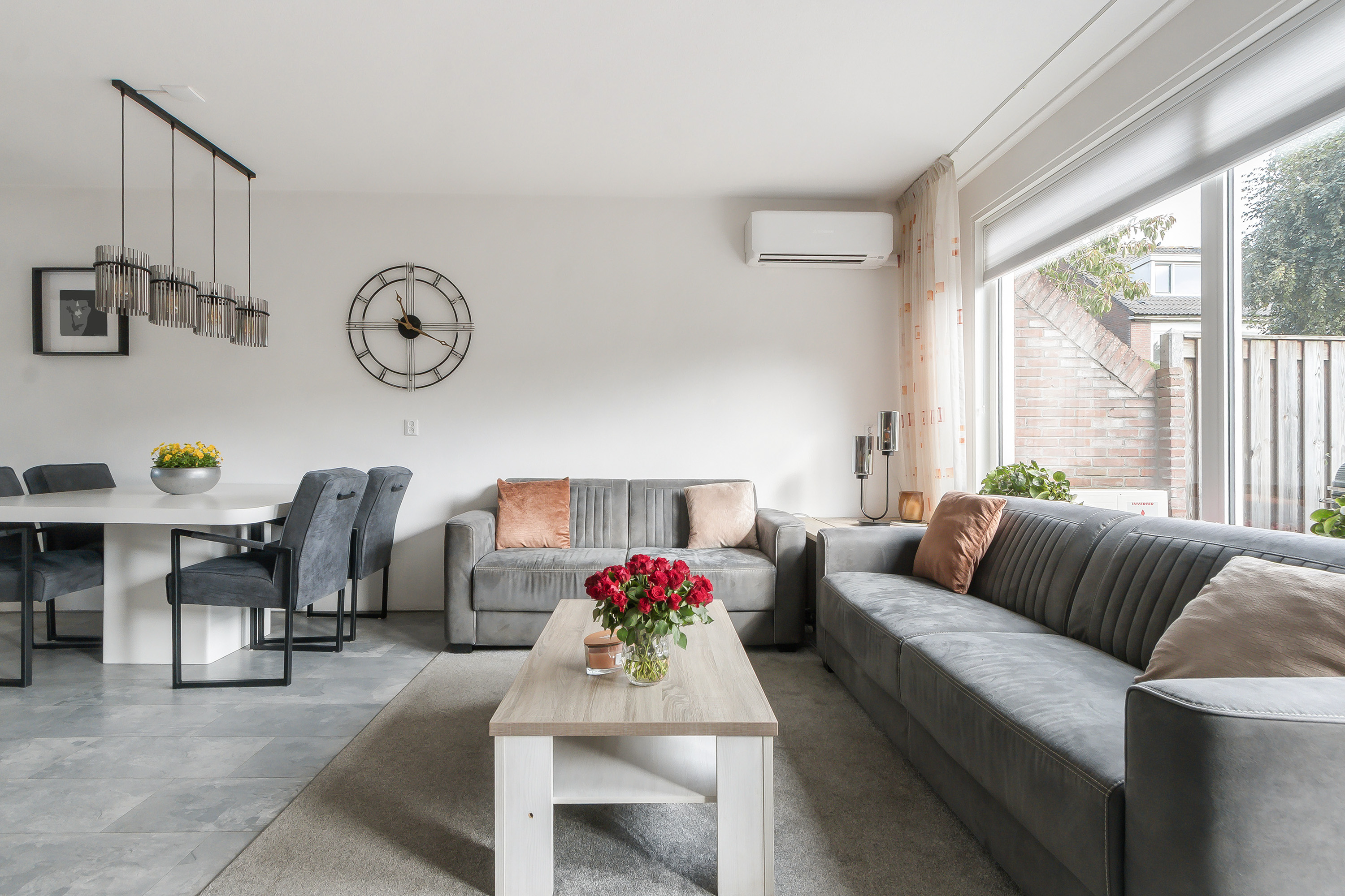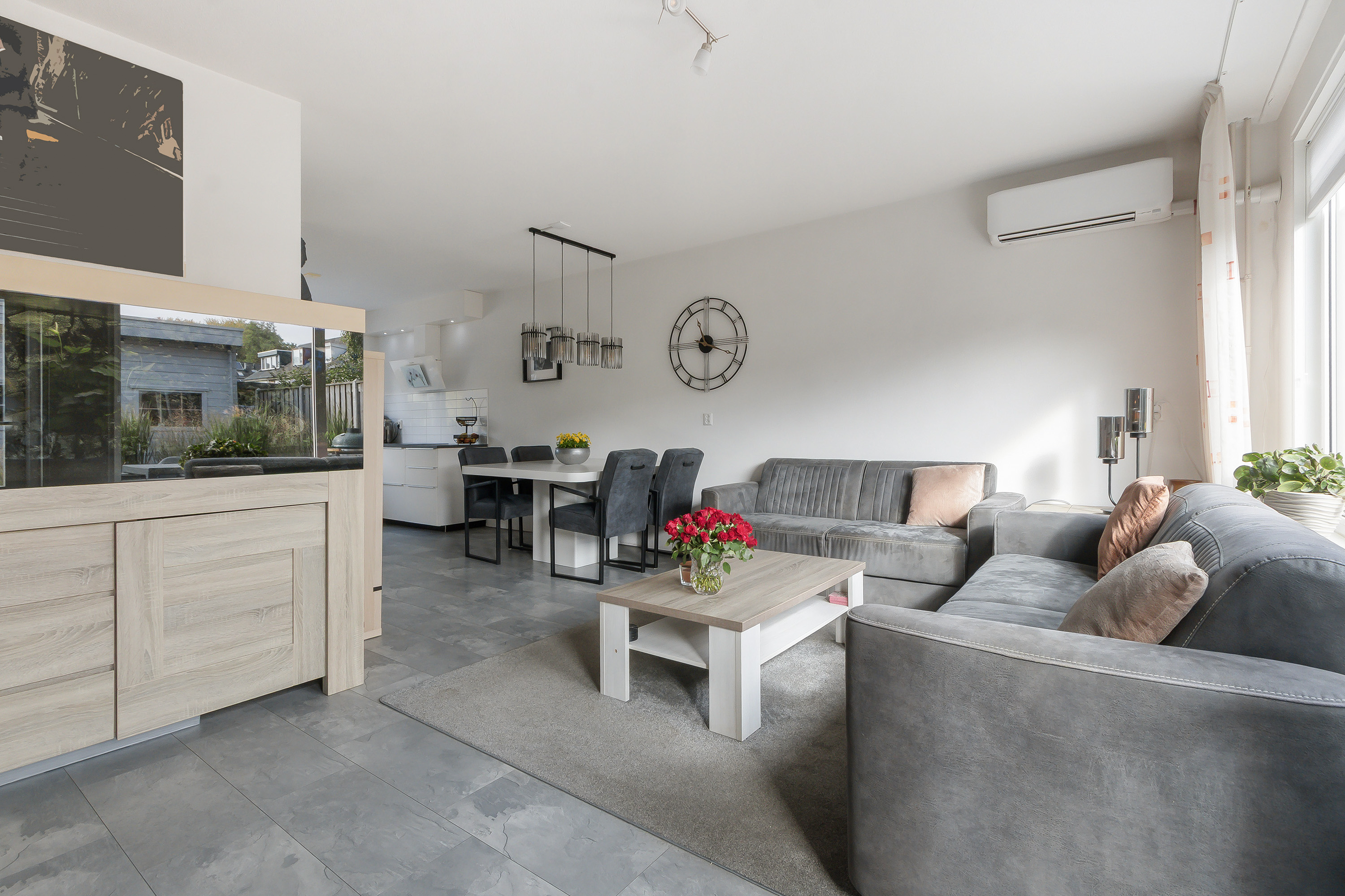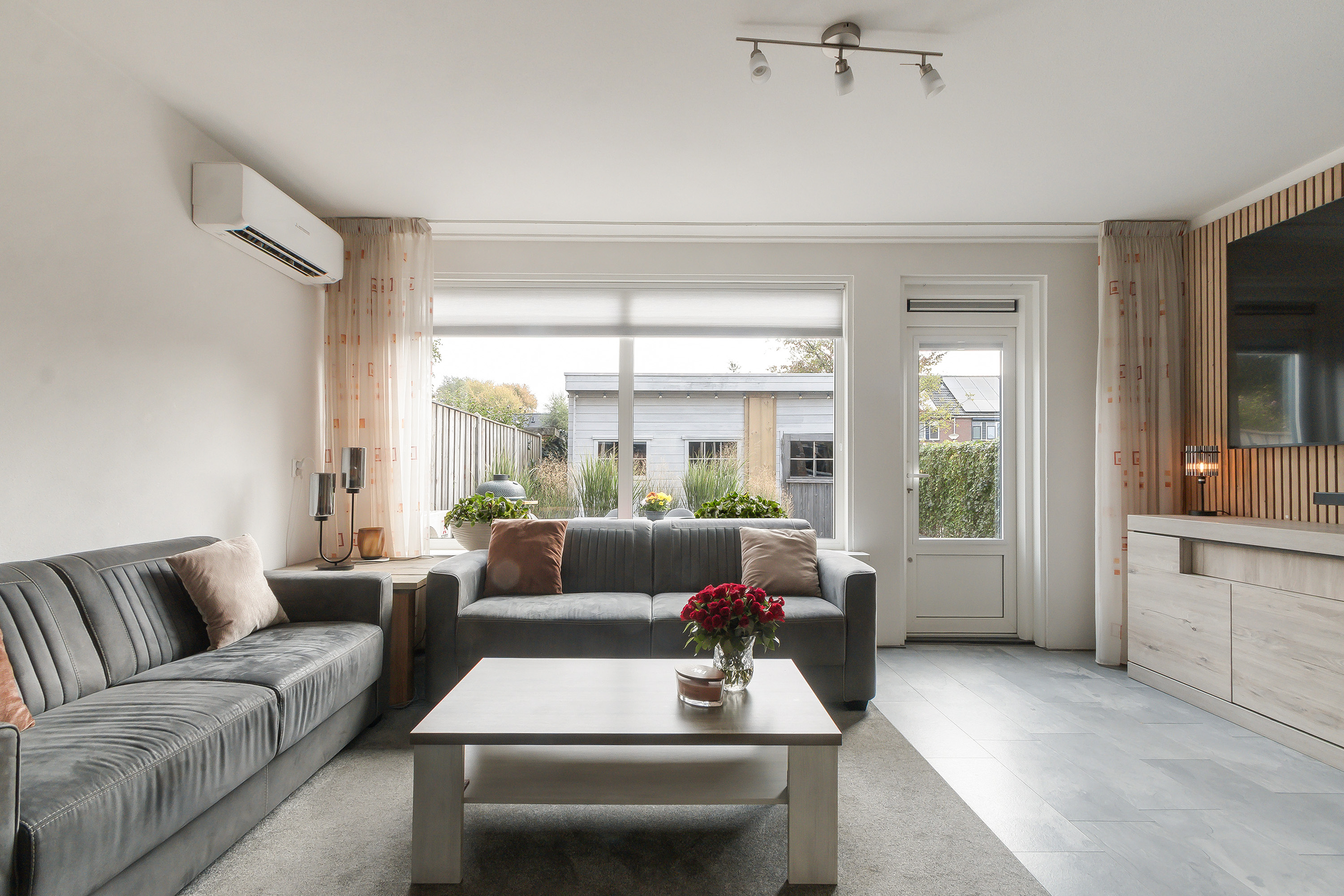 - L-vormige tuingerichte woonkamer met, een nette laminaatvloer, een airconditioning en een deur naar de achtertuin;