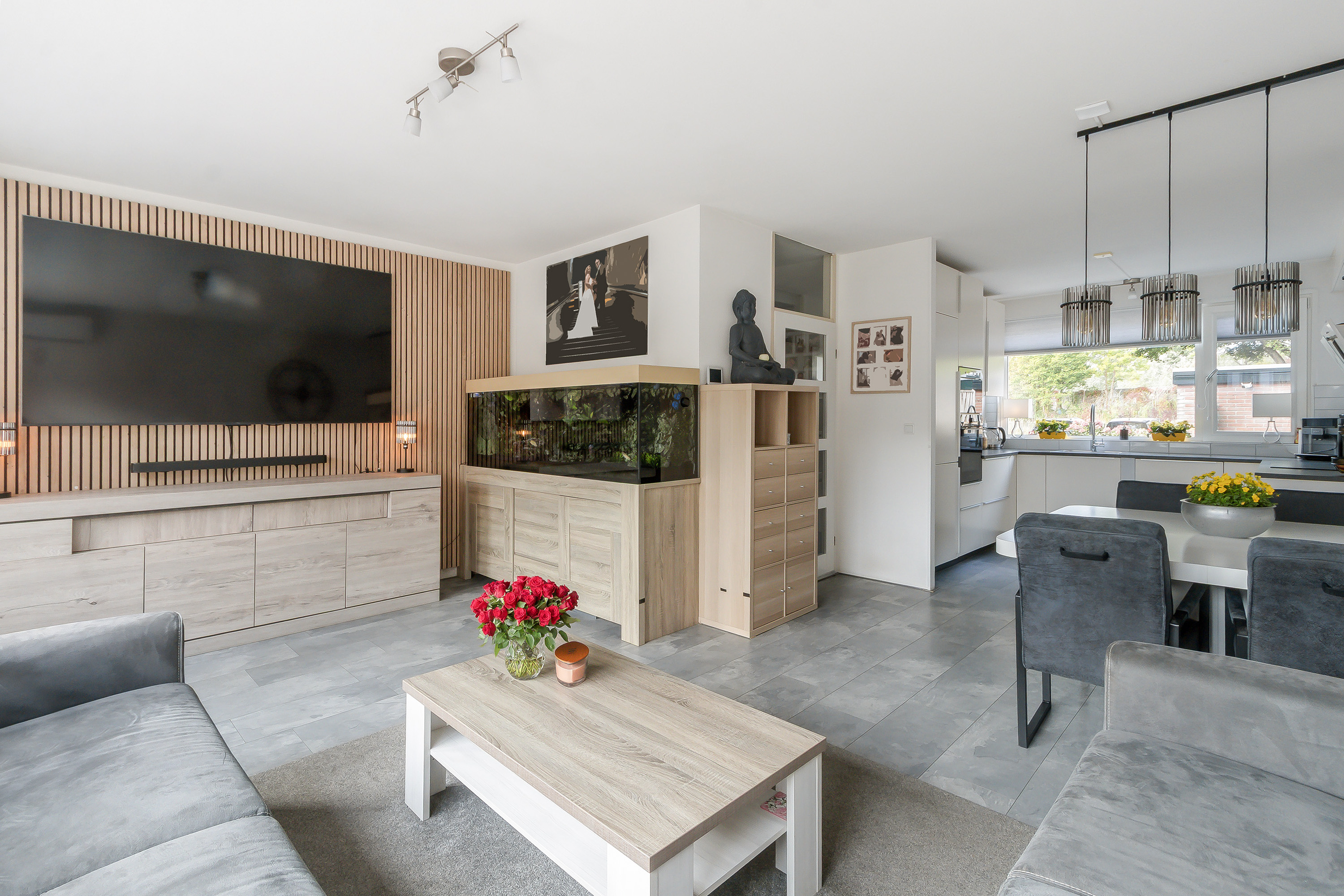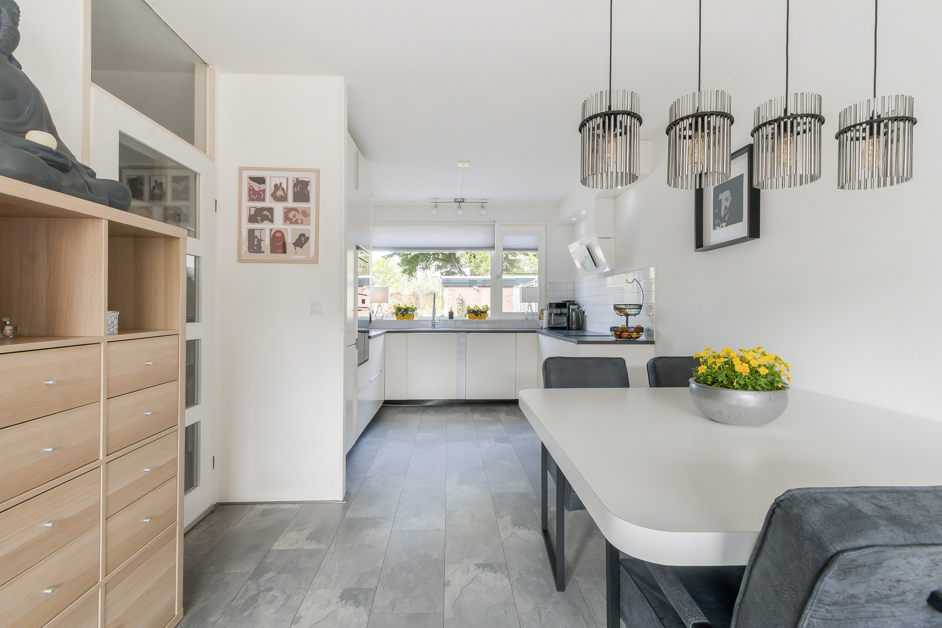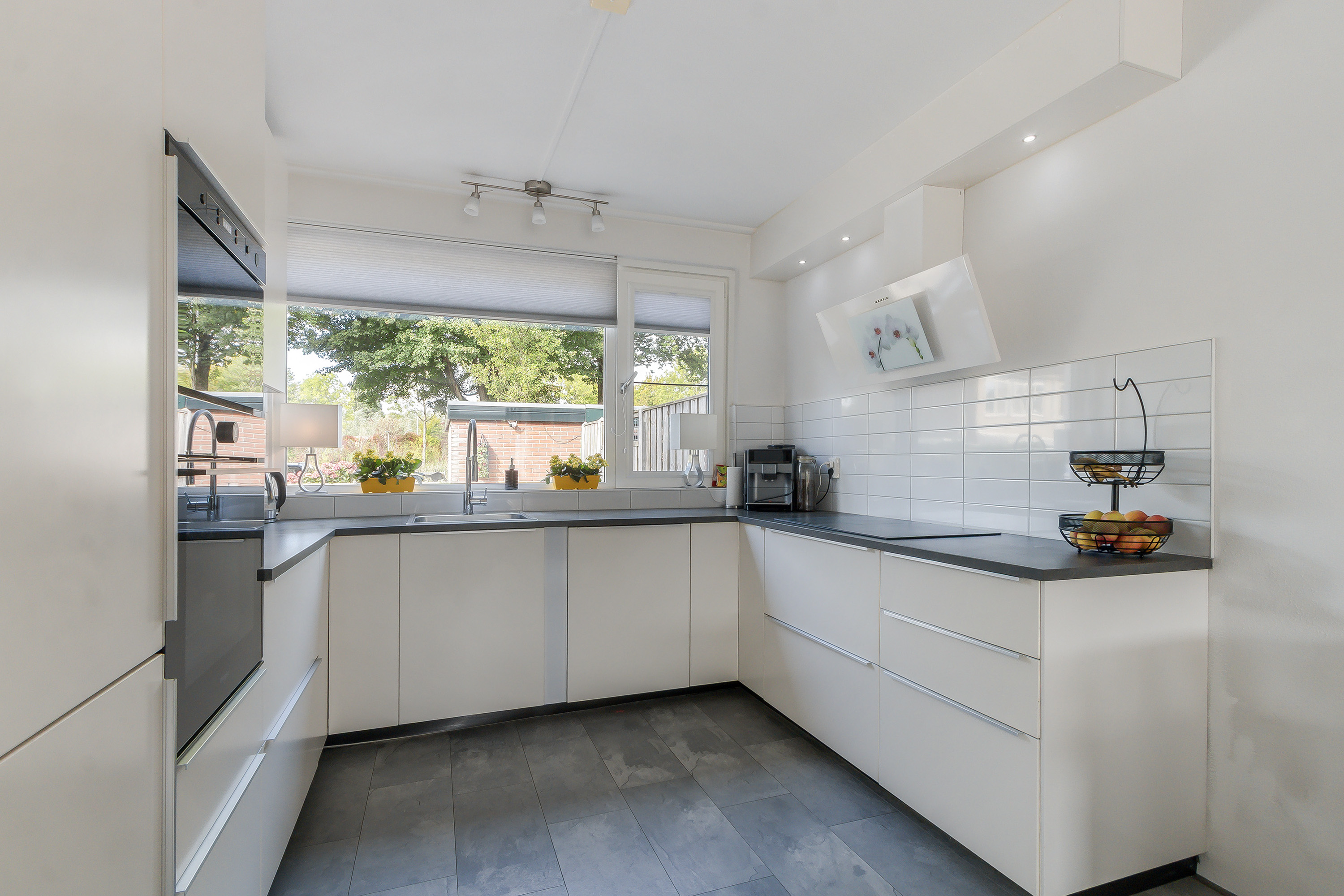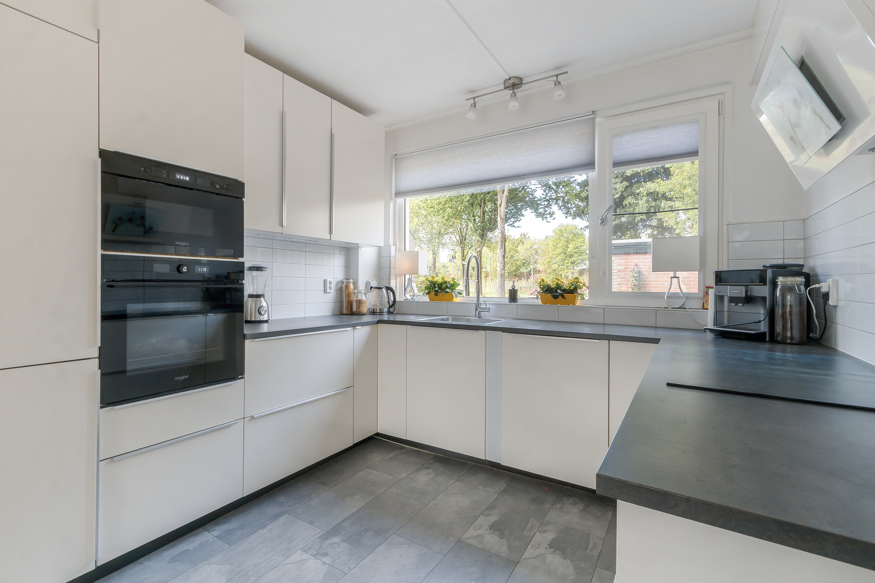 - Open keuken, gelegen aan de voorzijde, voorzien van een dubbele hoekopstelling (u-vorm) in een neutrale witte kleurstelling met diverse onderkasten, laden en een enkele rvs-spoelbak. Apparatuur: 4-pits inductiekookplaat, 10 Liter close-in boiler, witte afzuigkap, oven (2025), magnetron (2025), vaatwasser (2022) en een koel-/vriescombinatie.