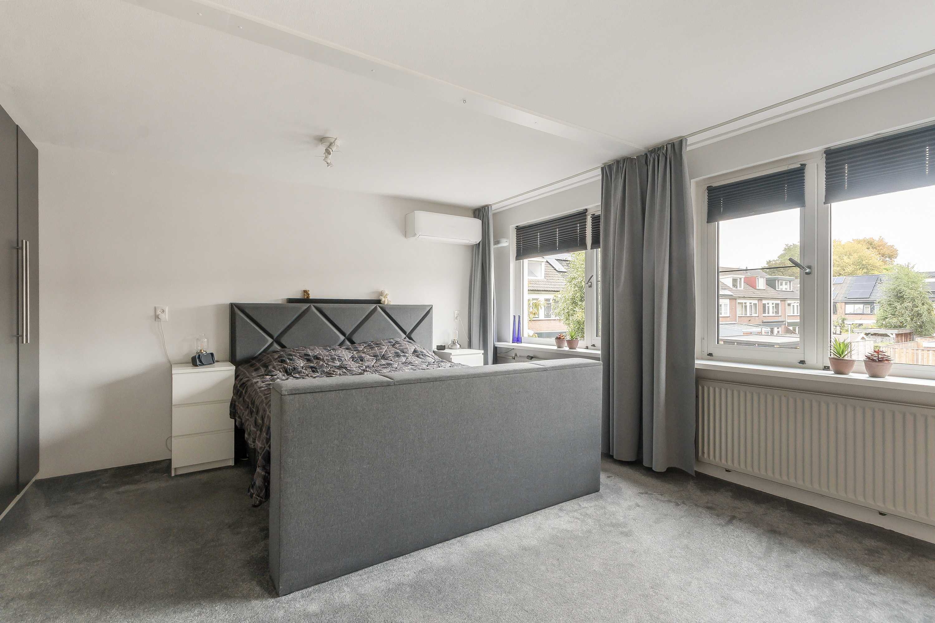 - Slaapkamer 1, gelegen aan de achterzijde, woning-brede slaapkamer (voorheen twee slaapkamers) met een airconditioning en een grote inbouwkast;
