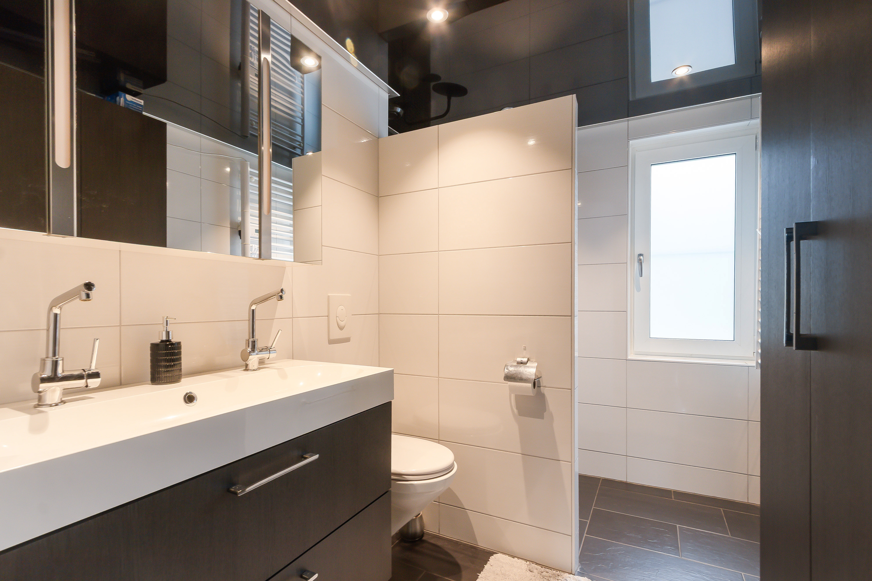 - Badkamer, gelegen aan de voorzijde, met geheel betegelde wanden, een plavuizen vloer, wastafelmeubel met 2 kranen, een inloopdouche, designradiator en een wandcloset.