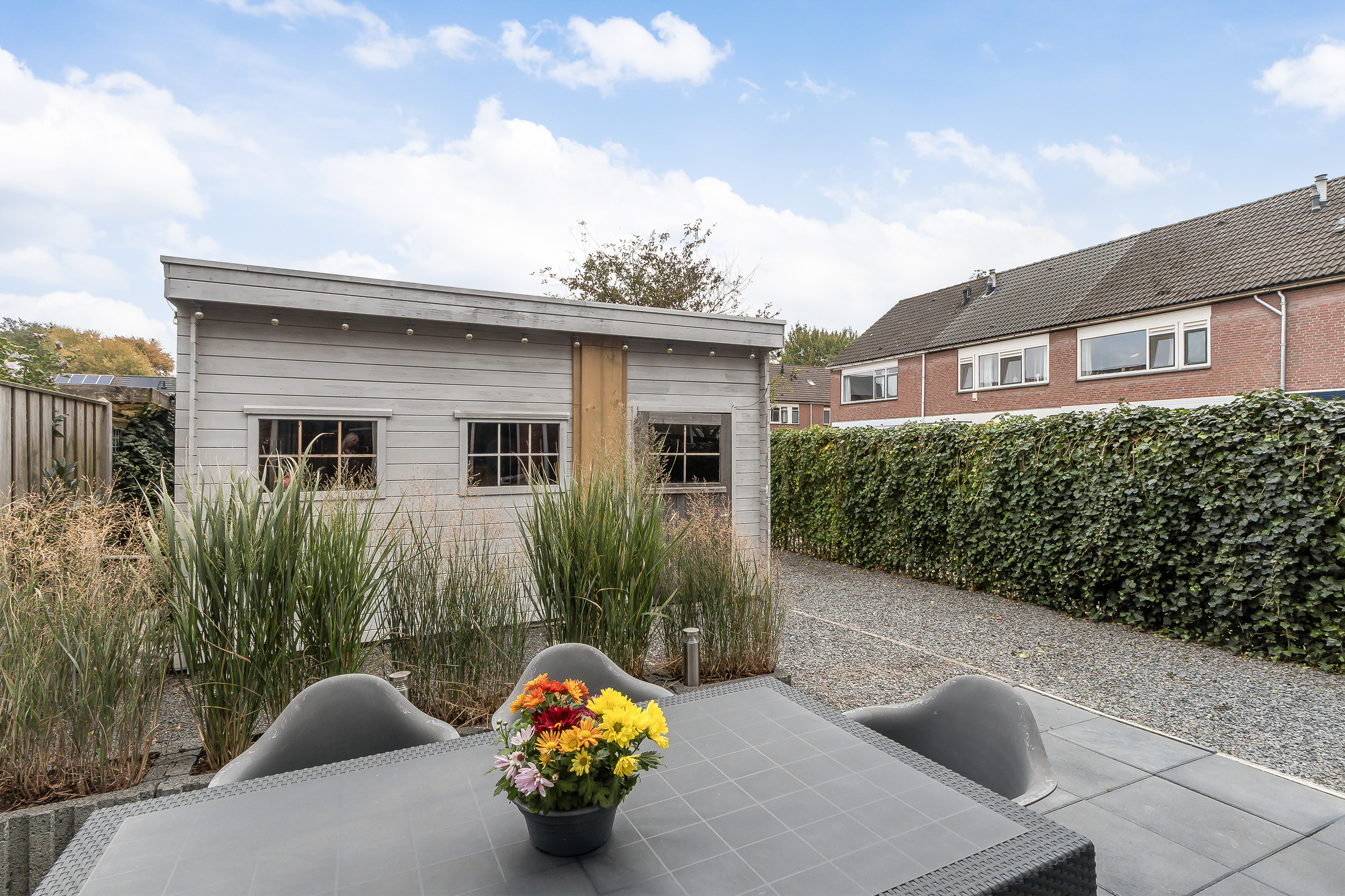 - Achtertuin, gesitueerd op het oosten en is ruim 10 meter diep. De tuin is voorzien van een terras en grind. De tuin is volledig omheind en beschikt over een hele ruime berging van ca. 21m².