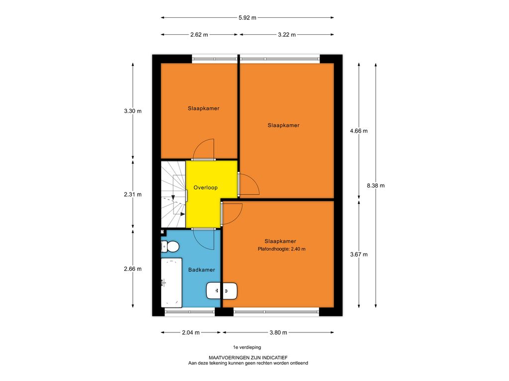 - Overloop, open trap naar 2e verdieping, deuren naar de 3 slaapkamers en de badkamer;