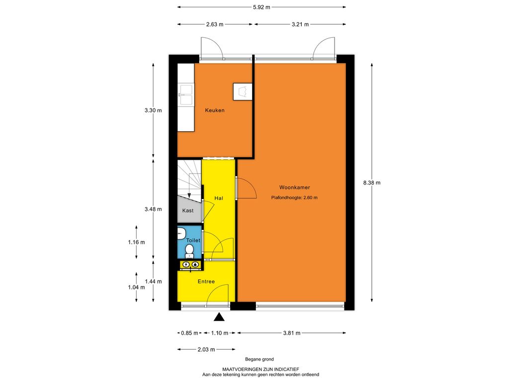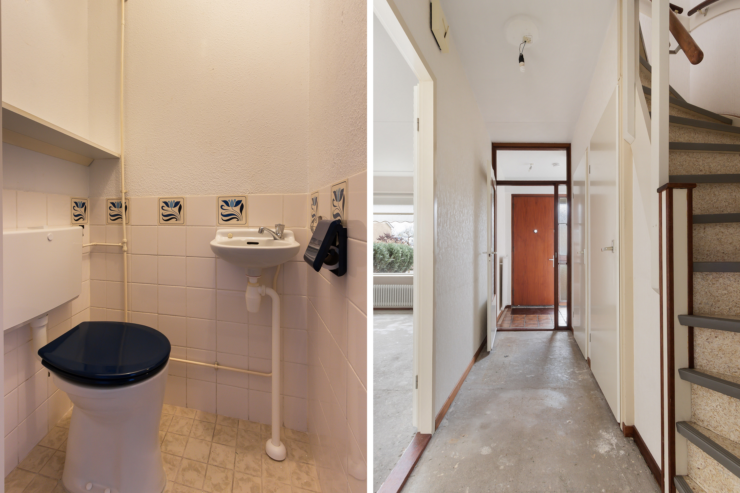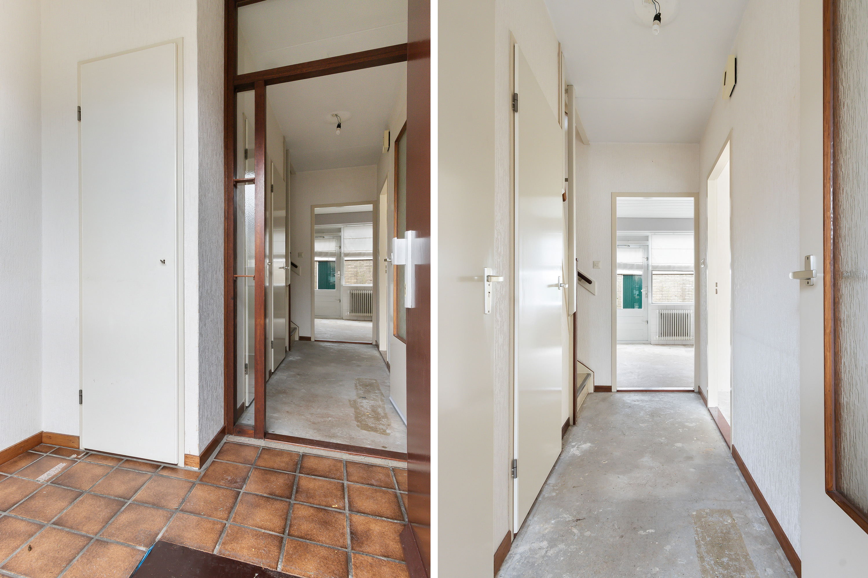 - Entree, vestibule met meterkast, hal met toilet, trap naar 1e verdieping met hieronder een trapkast, deur naar woonkamer en een deur naar de keuken;