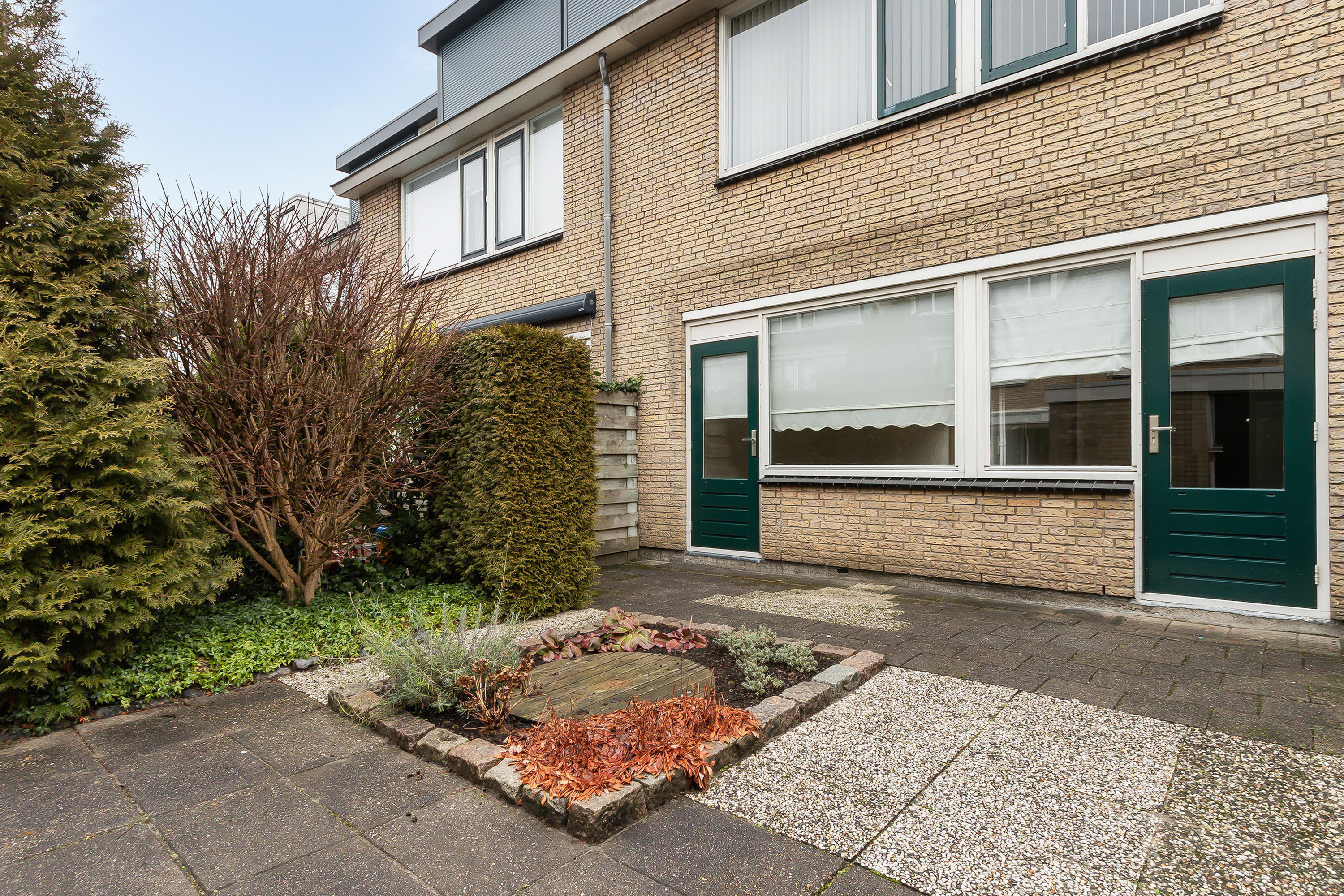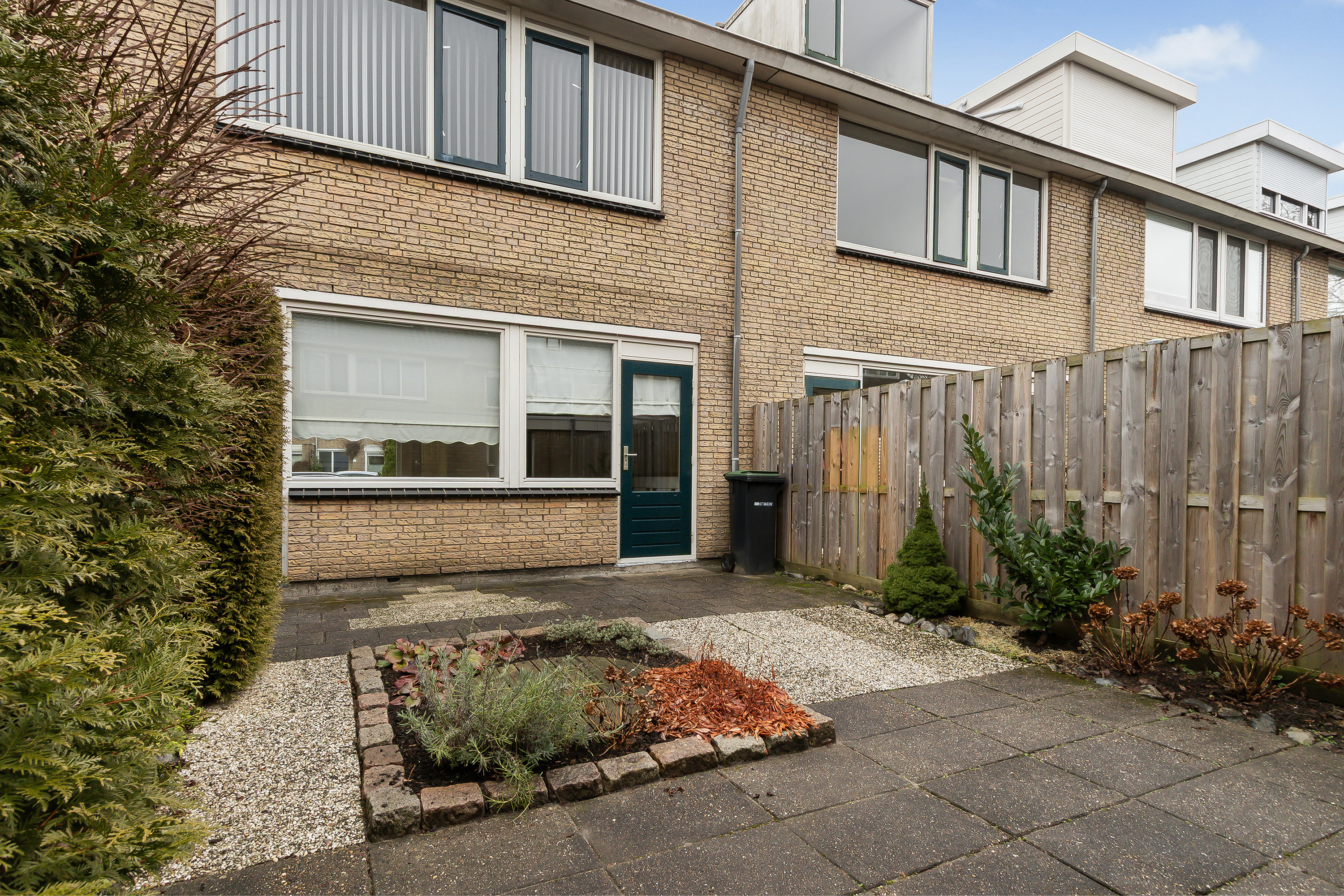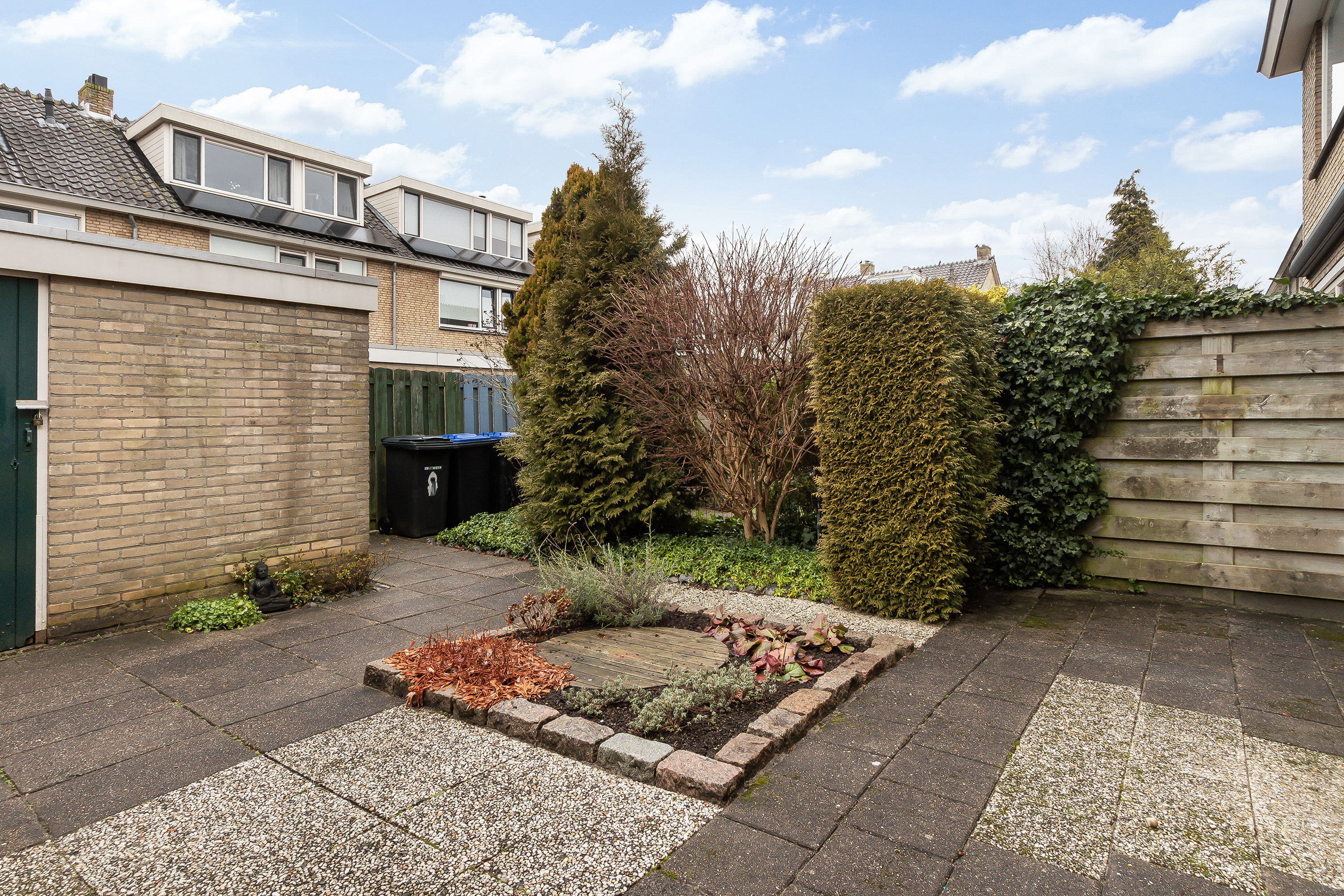 - Achtertuin: gesitueerd op het westen, omheind met achterom. Aangelegd met betonnen staptegels en borders.