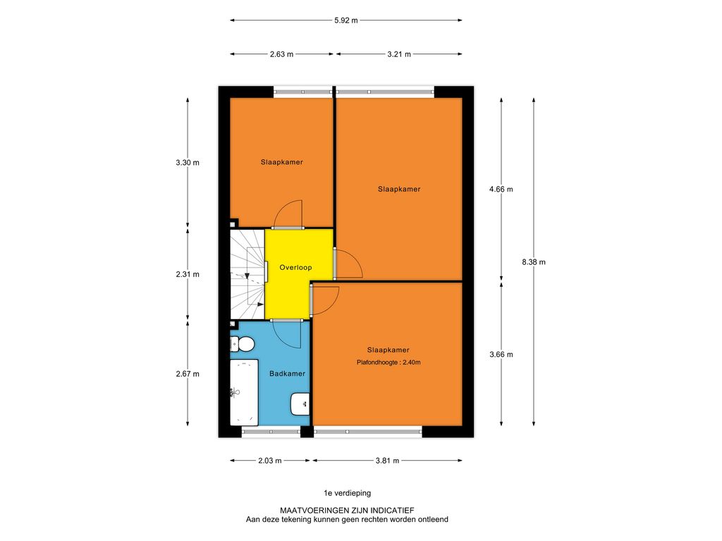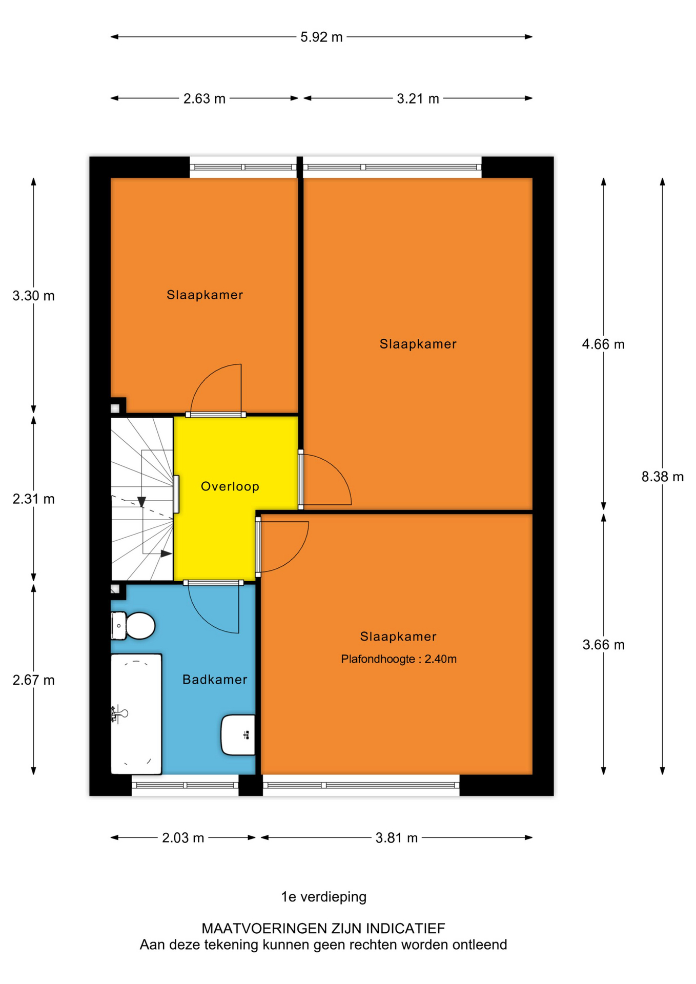 Eerste verdieping: overloop, 3 slaapkamers en een eenvoudige badkamer met o.a. ligbad en toilet.