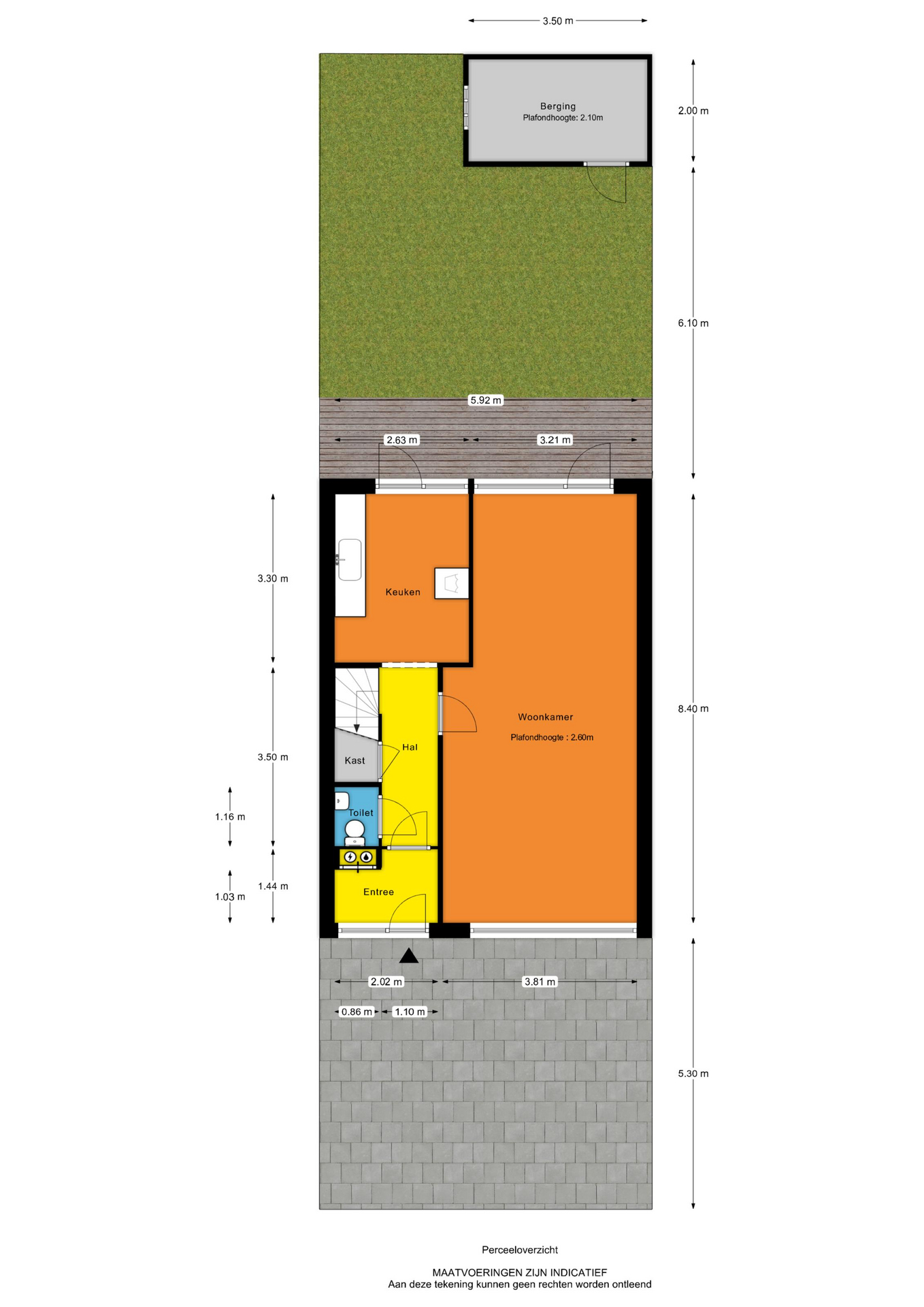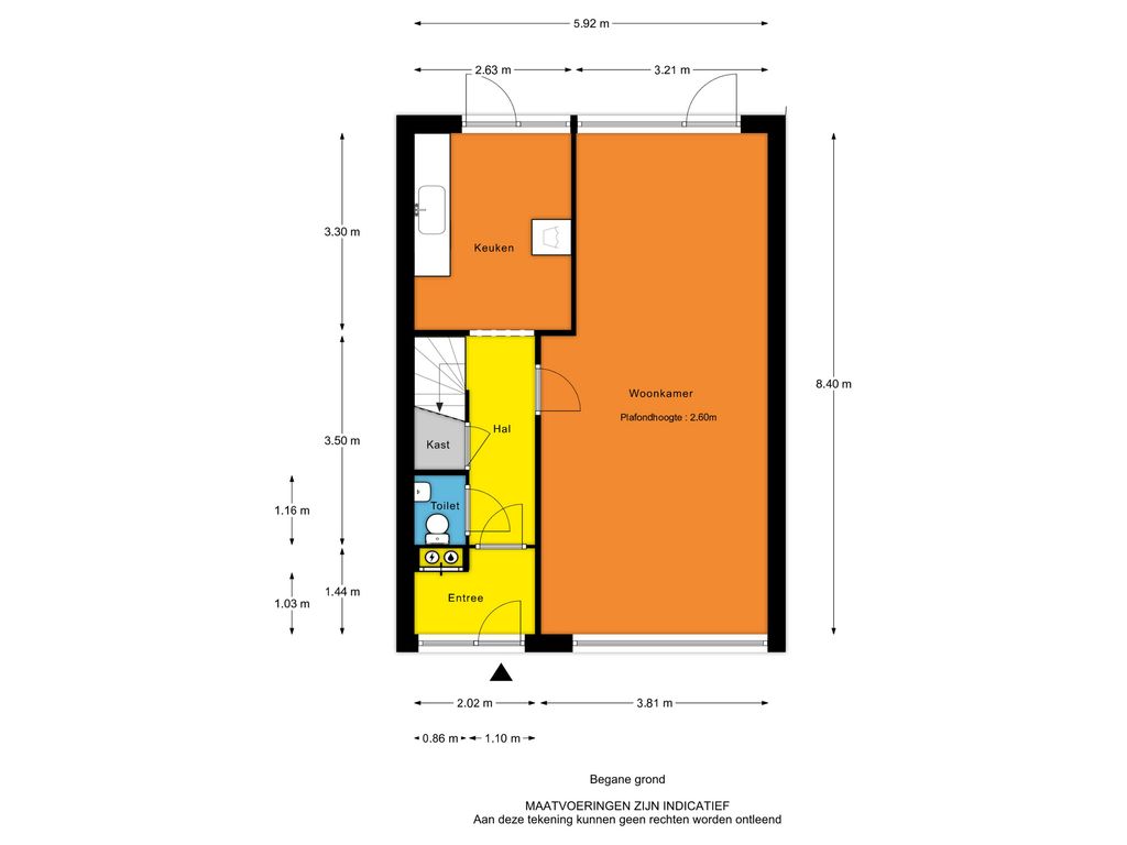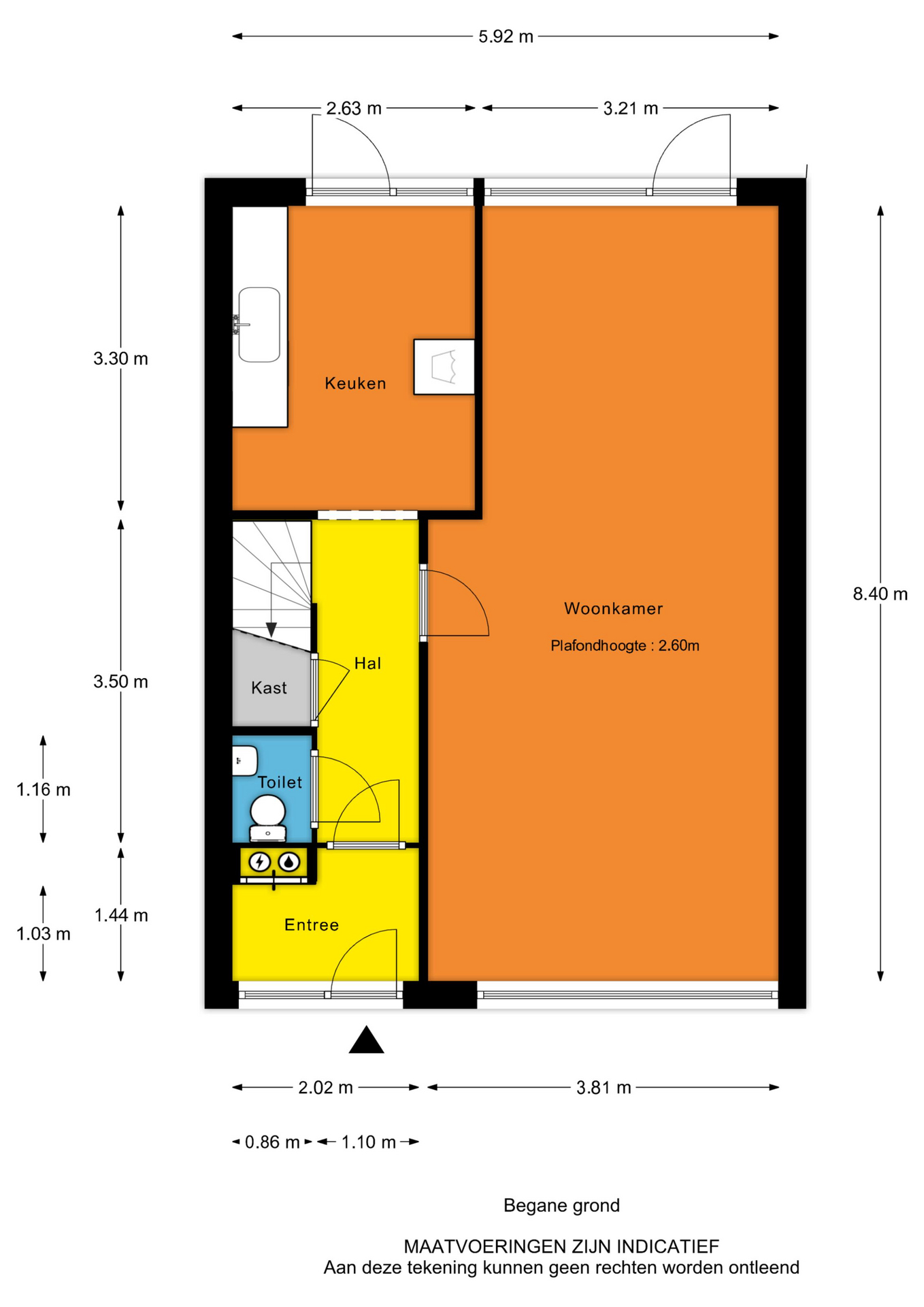 - Entree, hal, meterkast, centrale hal met toilet, trap naar 1e verdieping met hieronder een trapkast, deur naar woonkamer en een deur naar de keuken;