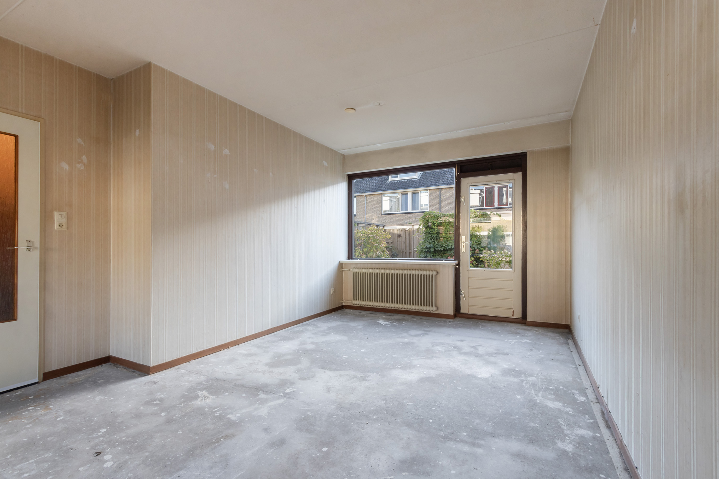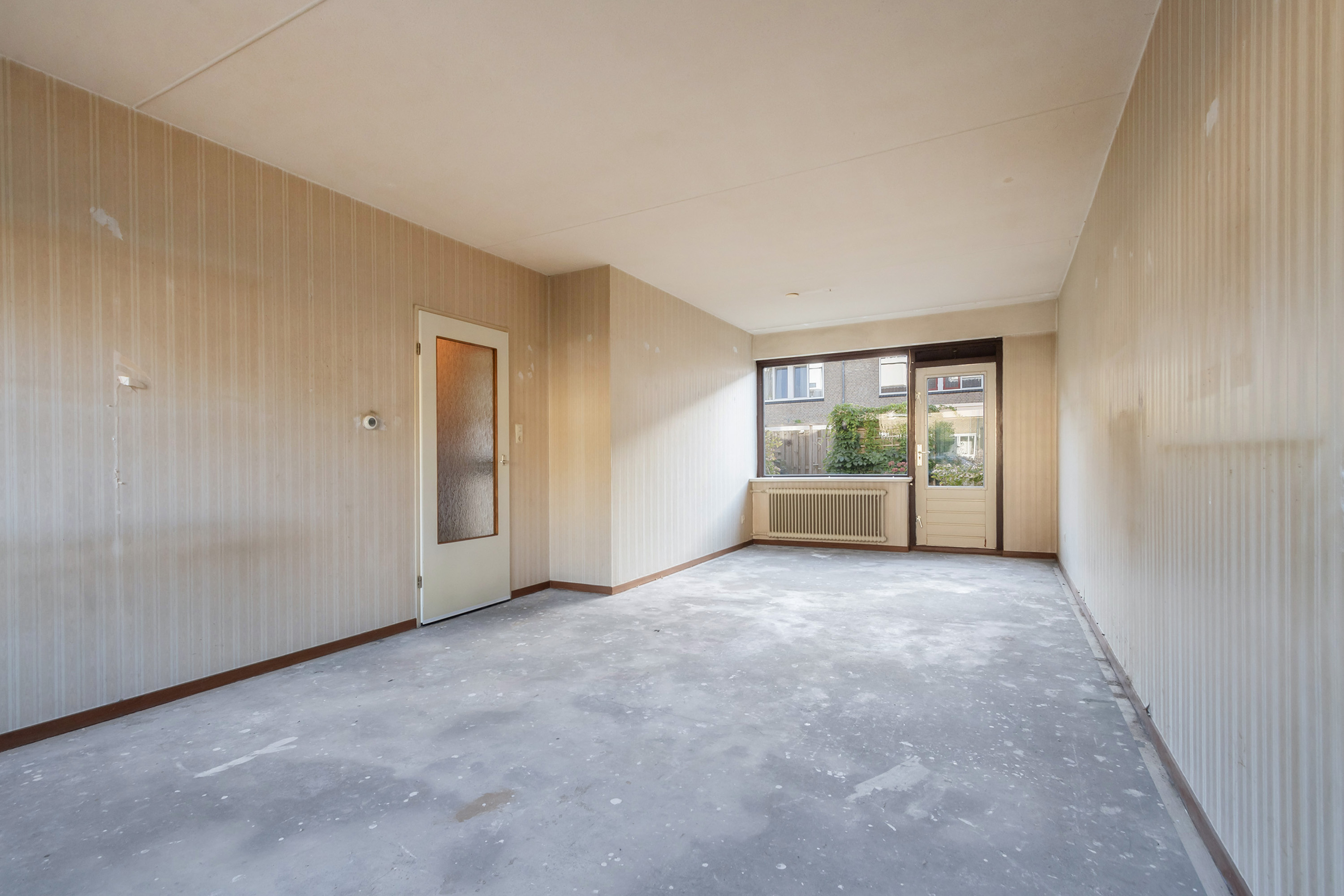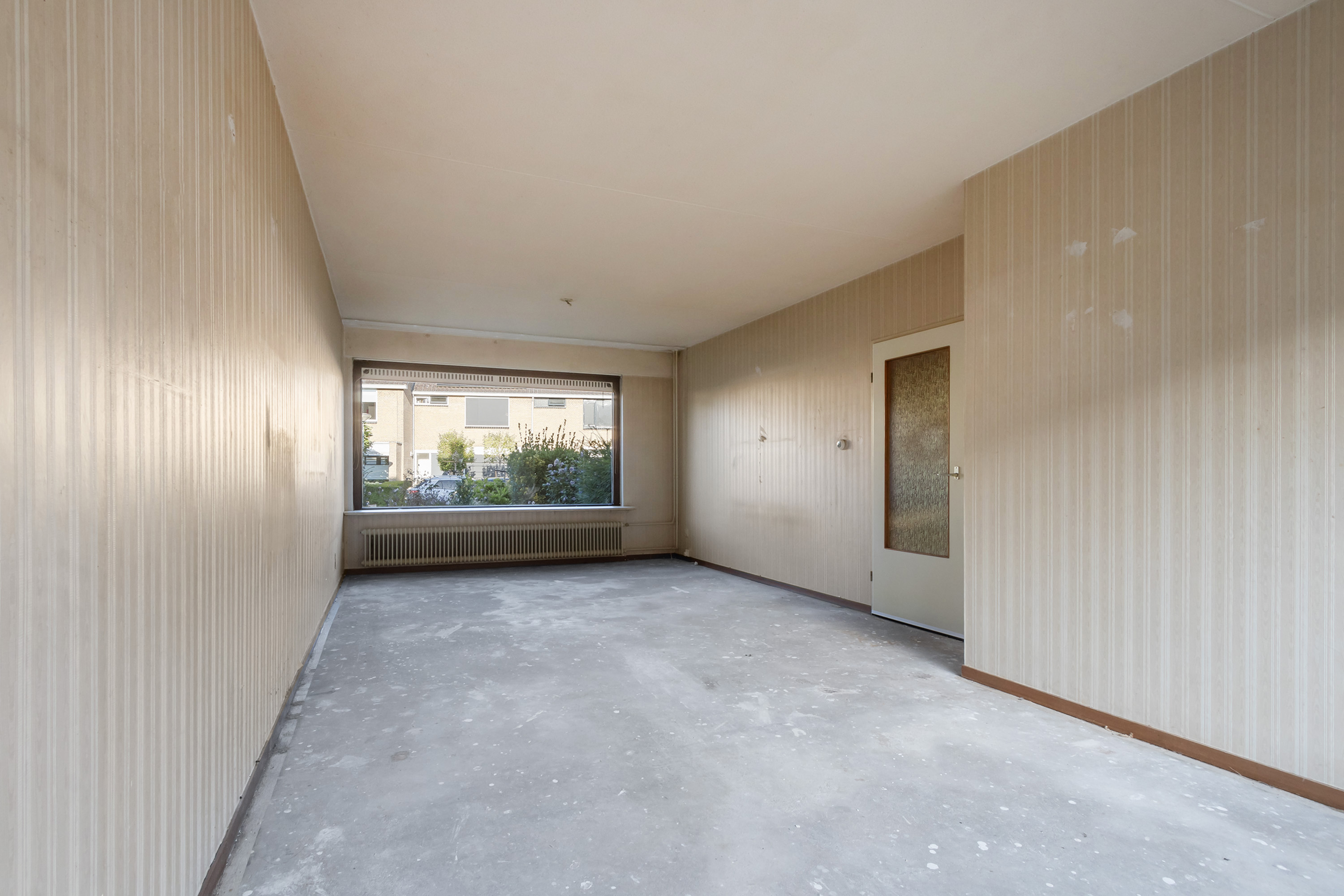 - Begane grond: behang wandafwerking. Kale betonvloer.