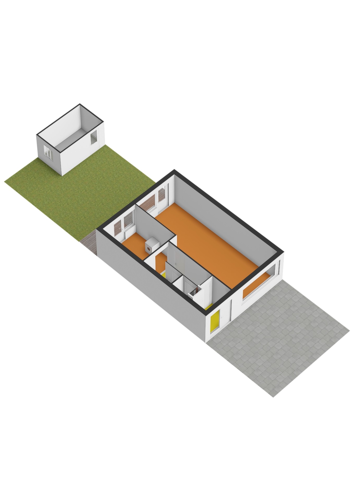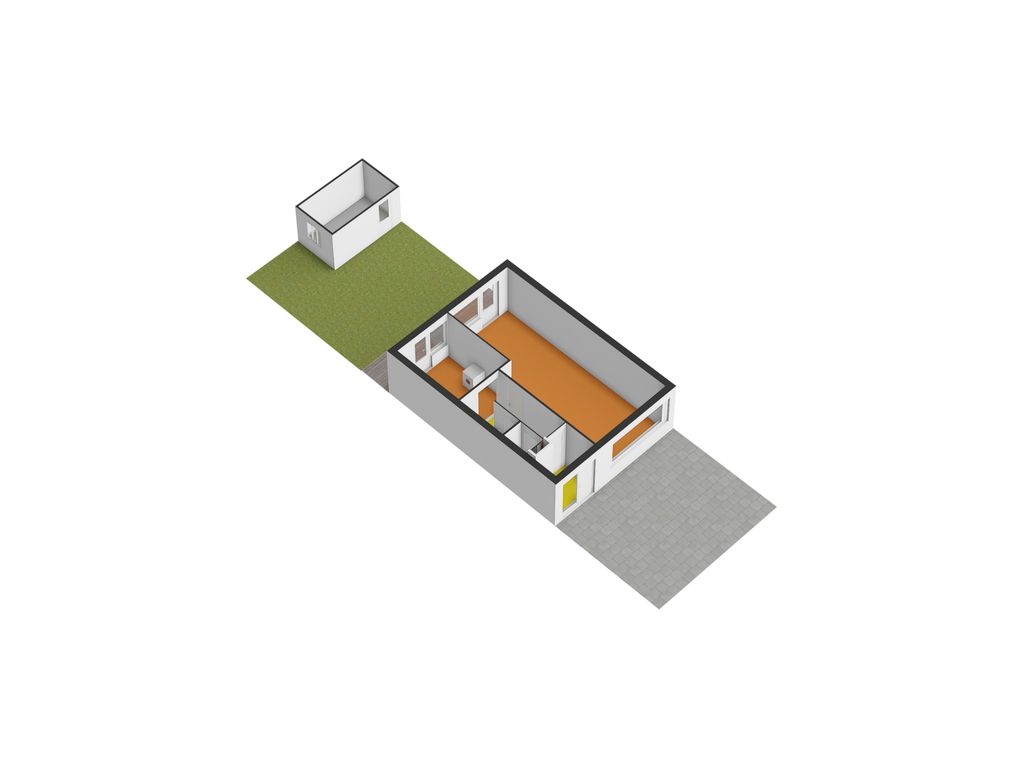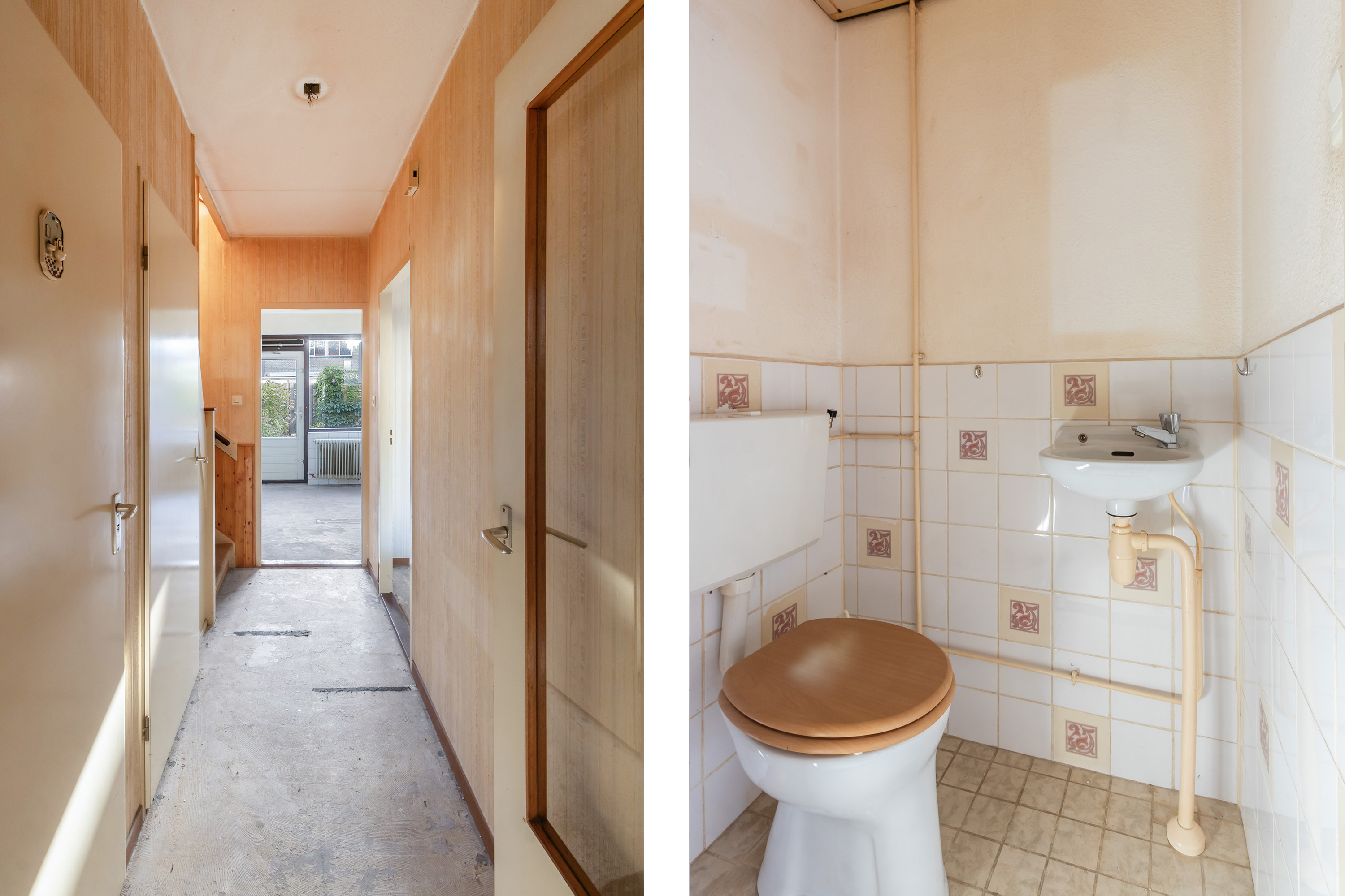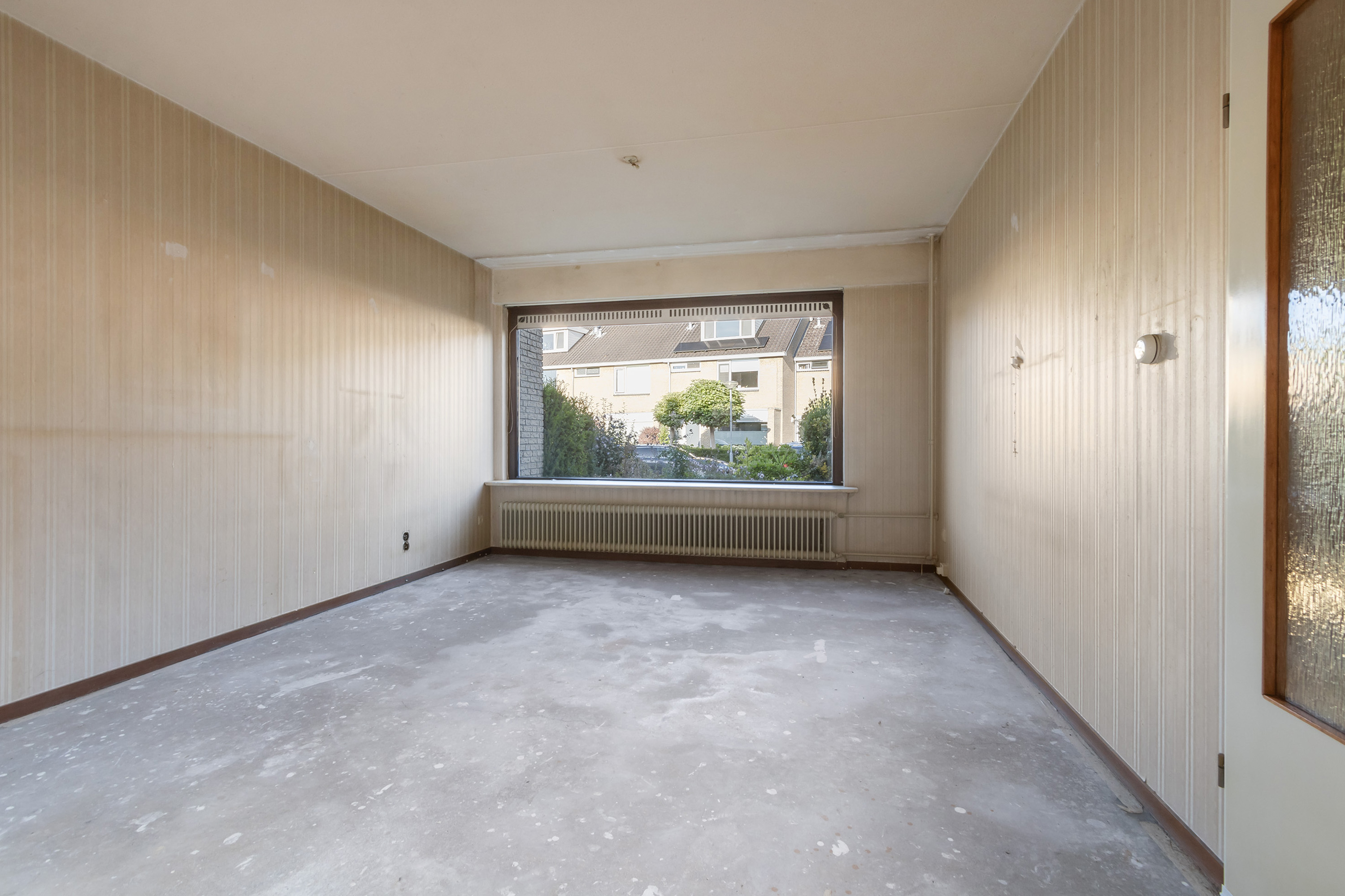 - Begane grond: behang wandafwerking. Kale betonvloer.