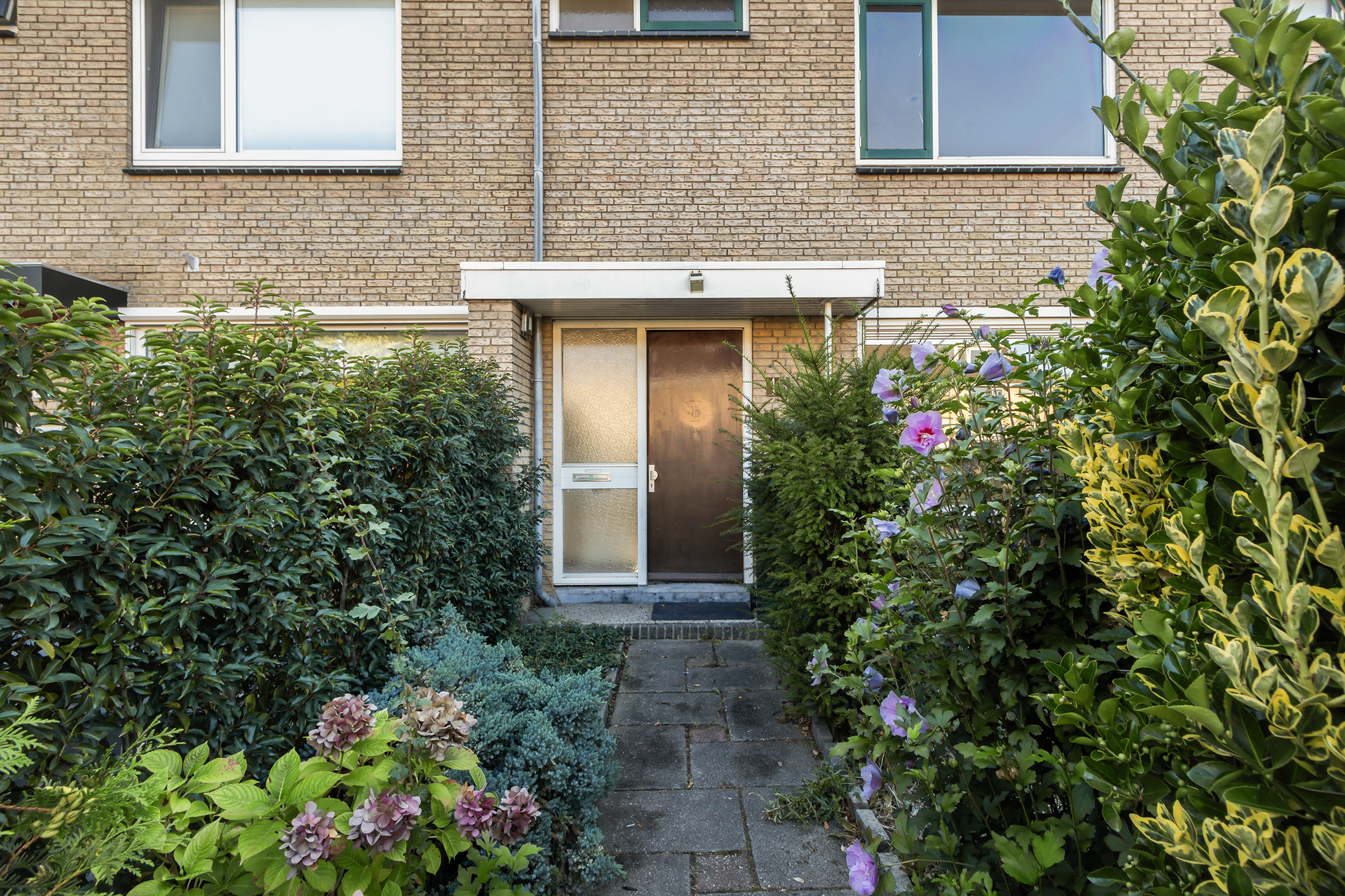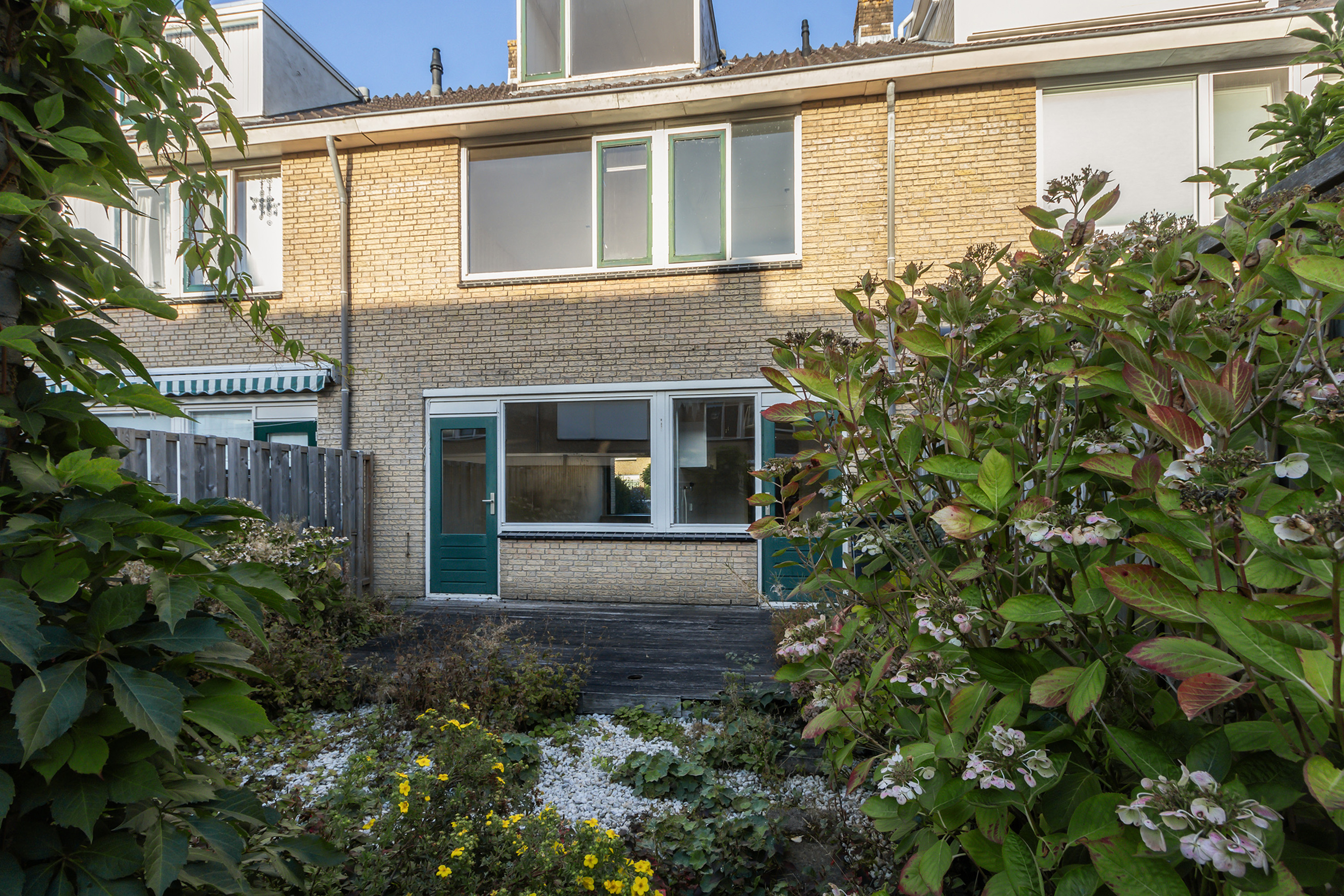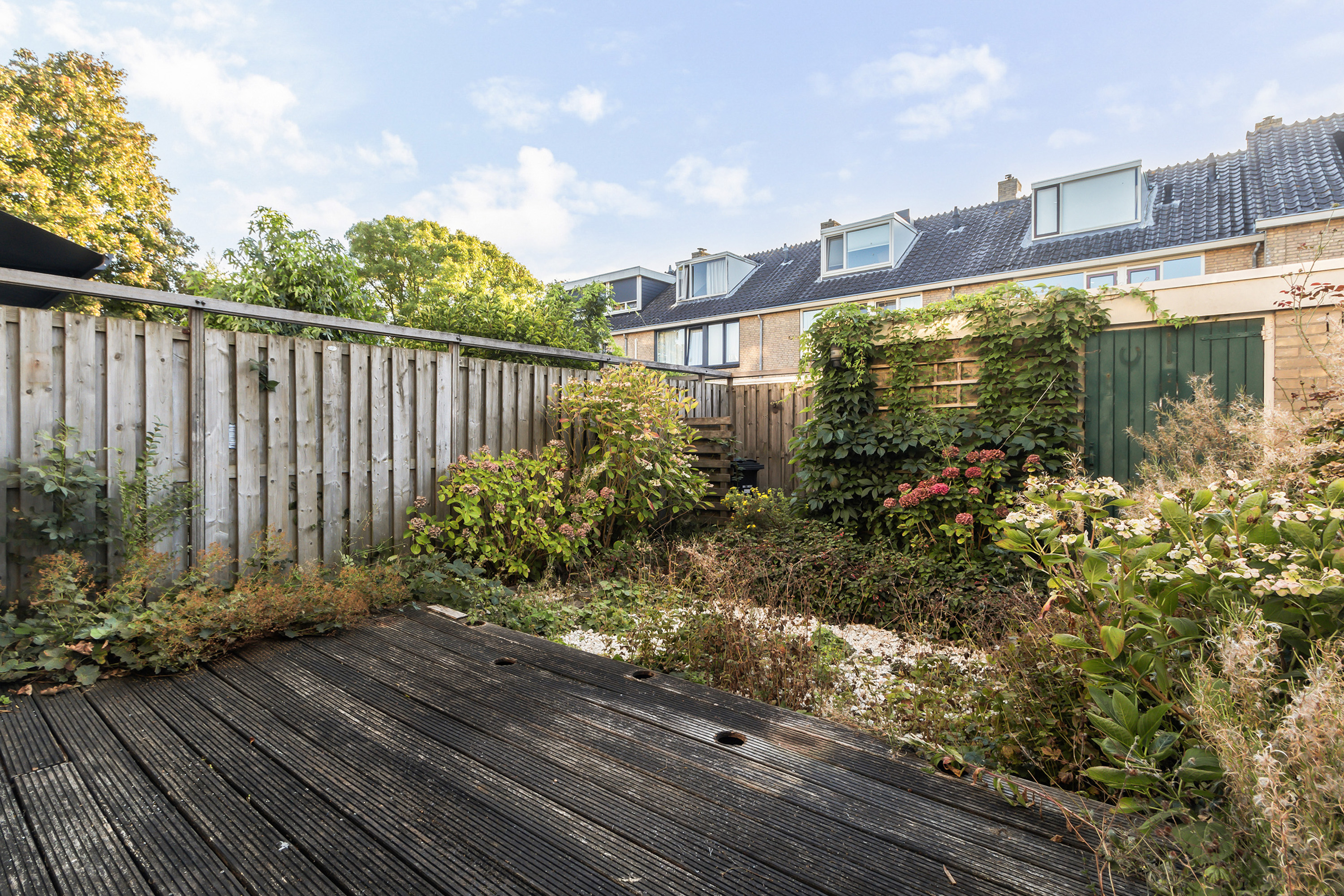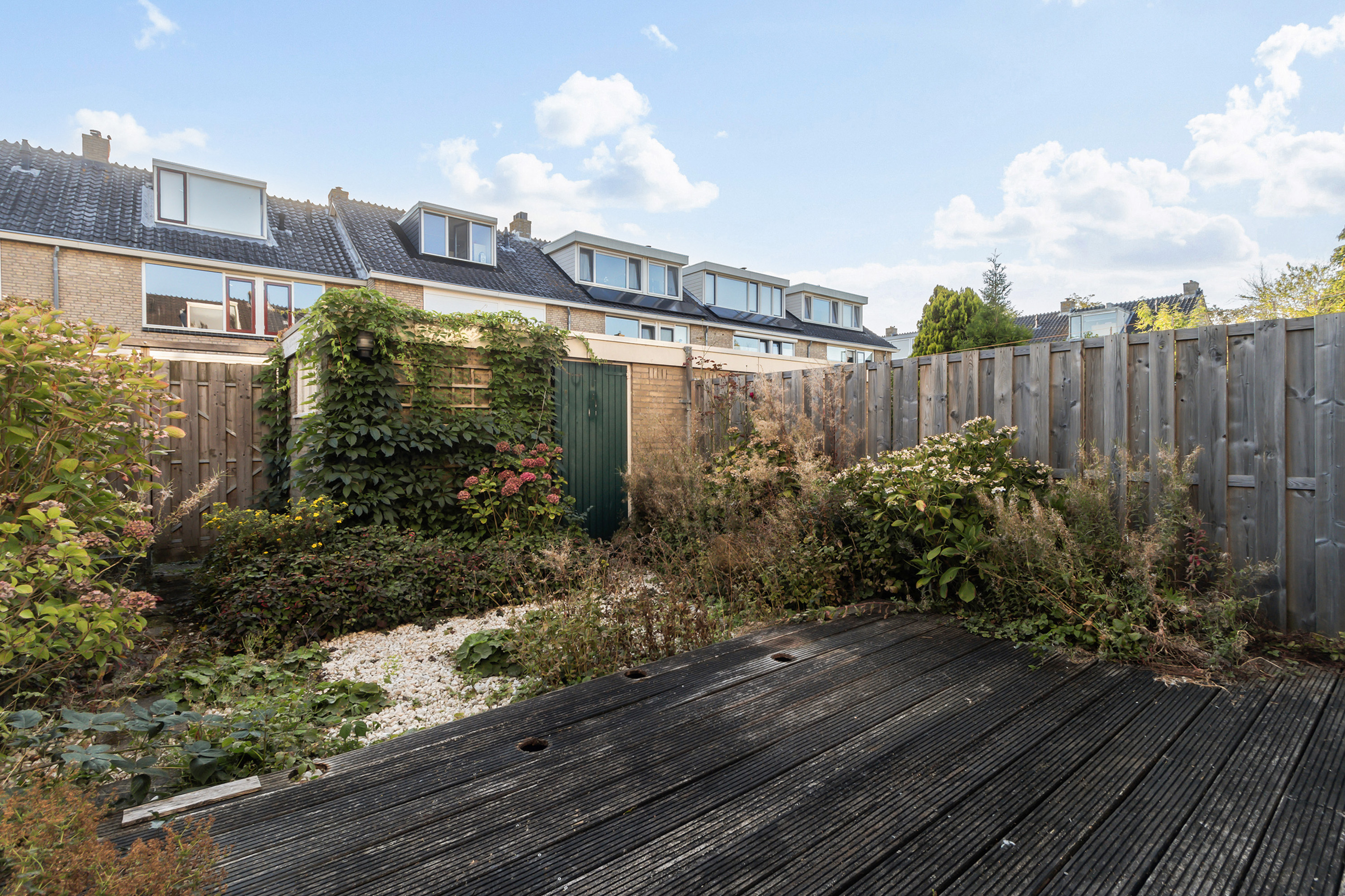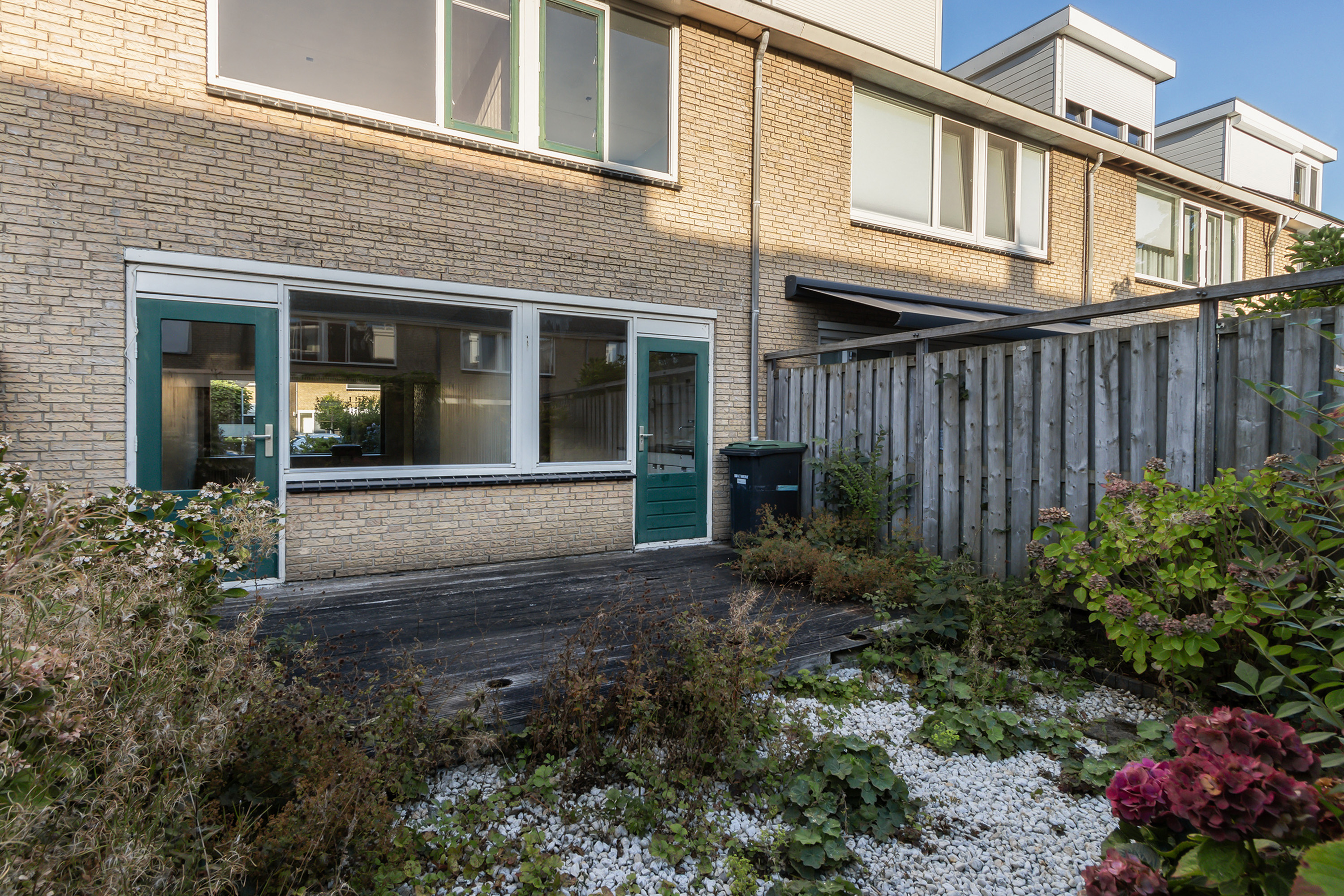 - Achtertuin: gesitueerd op het westen, omheind met achterom. Aangelegd met een houten terrasvlonder, betonnen staptegels, grind en borders.