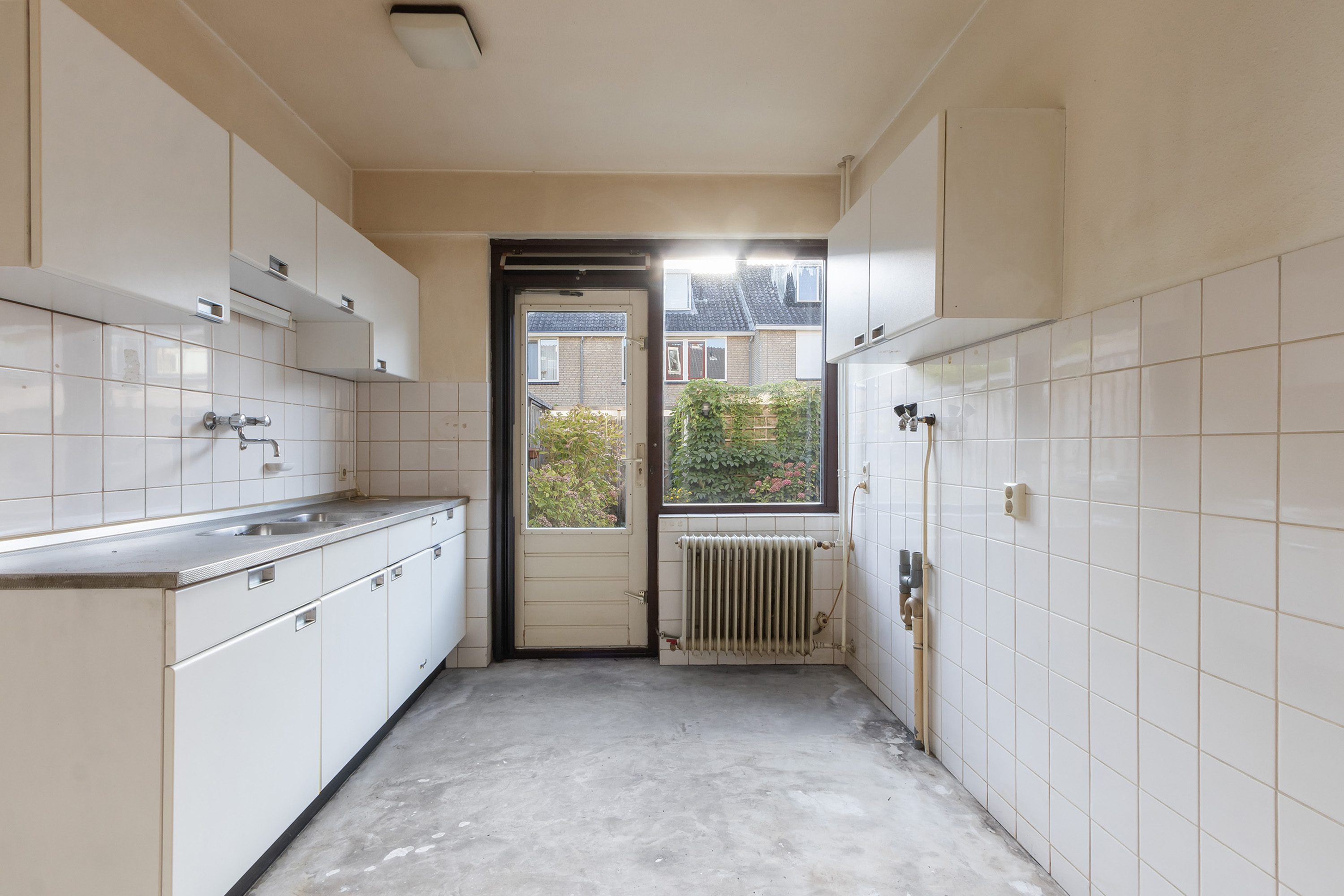 - Dichte keuken met een eenvoudige inrichting bestaande uit een wit keukenblok van Bruynzeel met rvs werkblad, dubbele spoelbak, 4 onder en 4 bovenkasten, 2 hangkasten, een gasaansluiting, opstelplaats t.b.v. de wasmachine en/ of vaatwasser. Gedeeltelijk betegelde wanden. Tuindeur.