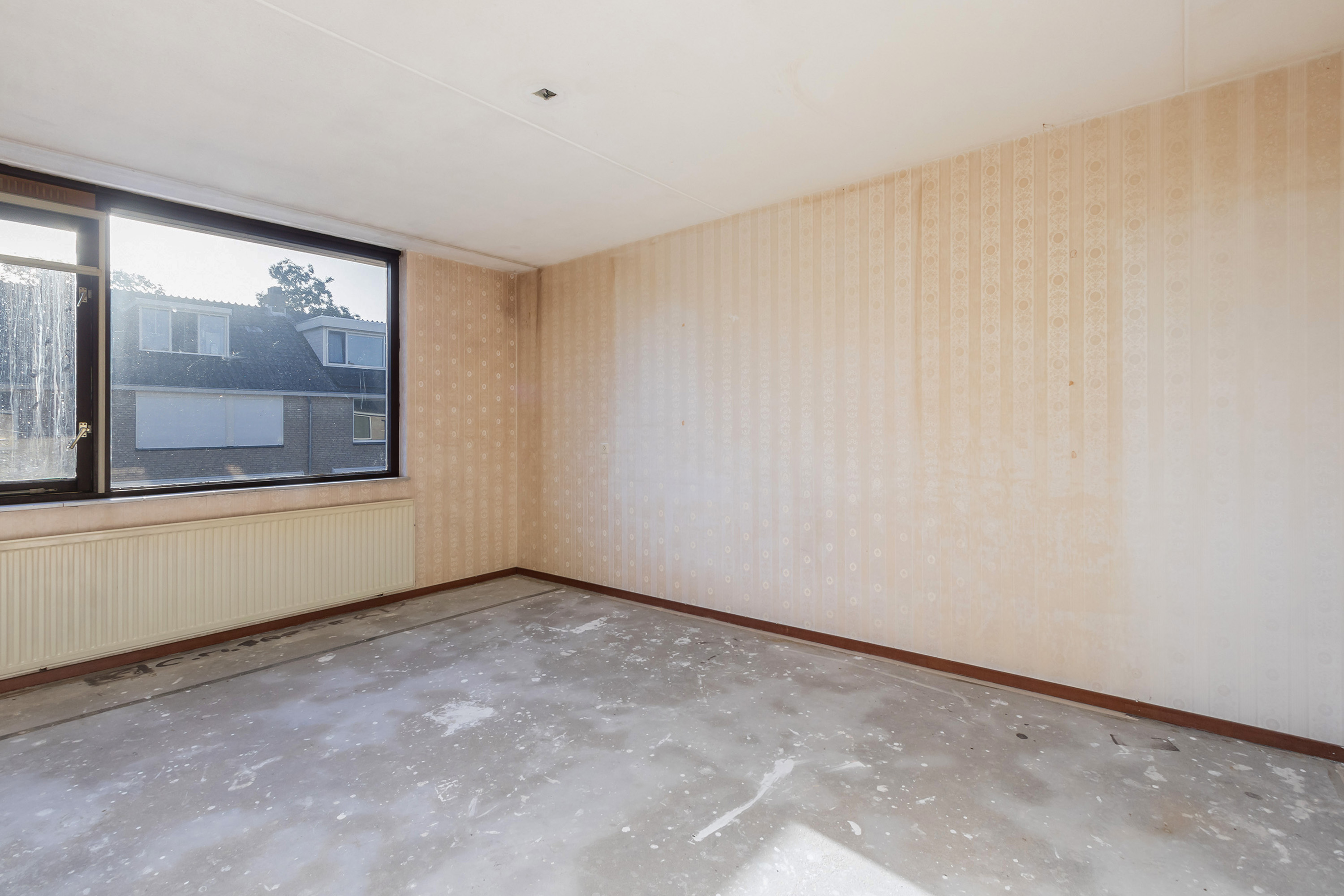 - Eerste verdieping: behang wandafwerking. Kale betonvloer.