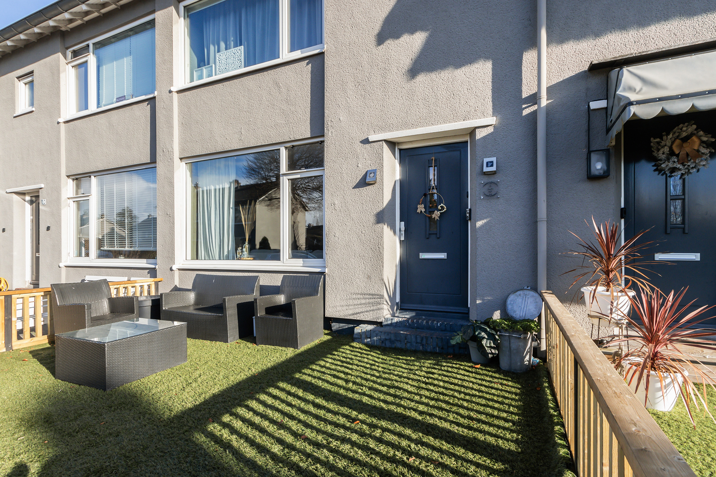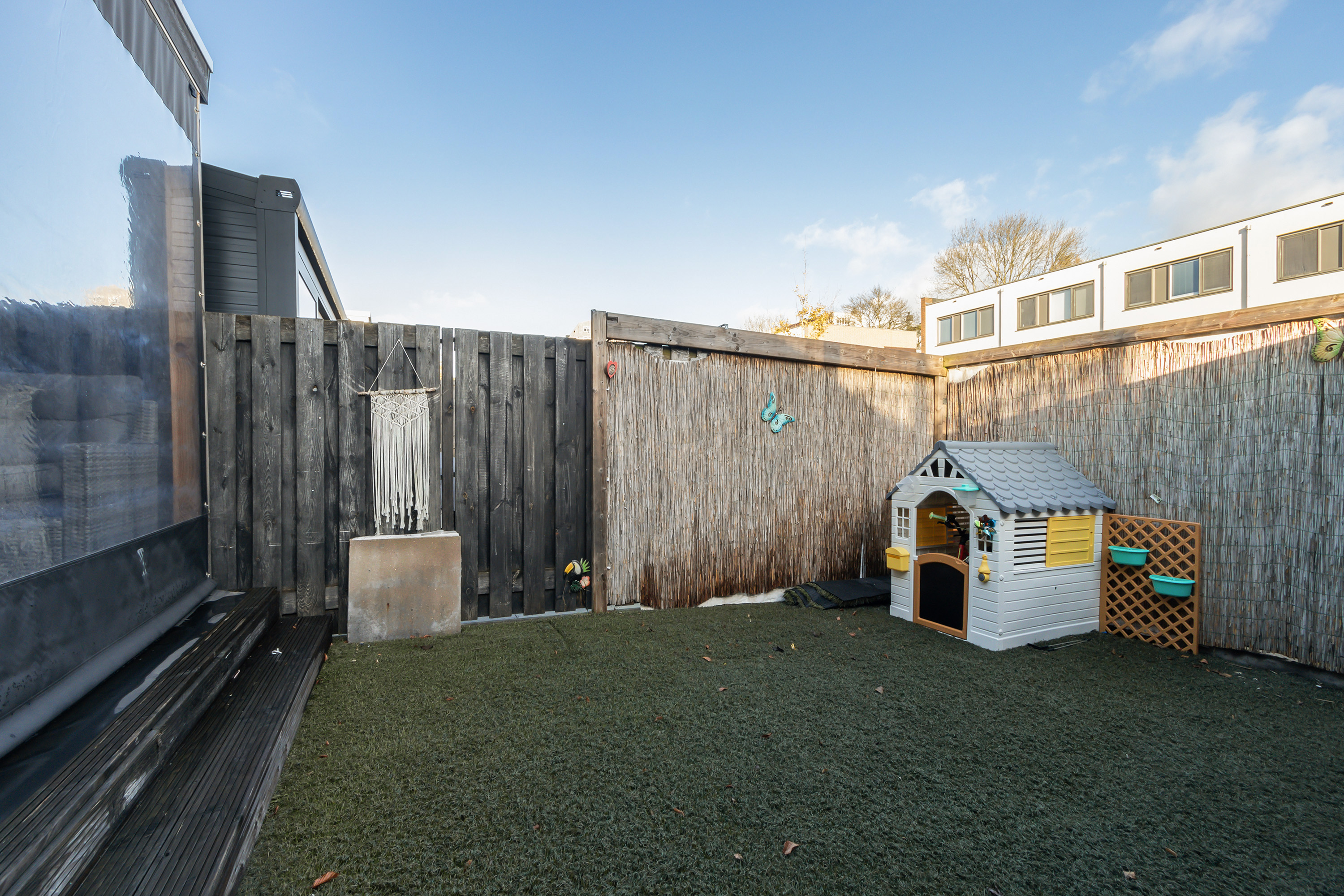 - Voortuin: ca. 3.90 m. x 5.60 m., gesitueerd op het westen. Aangelegd met kunstgras.