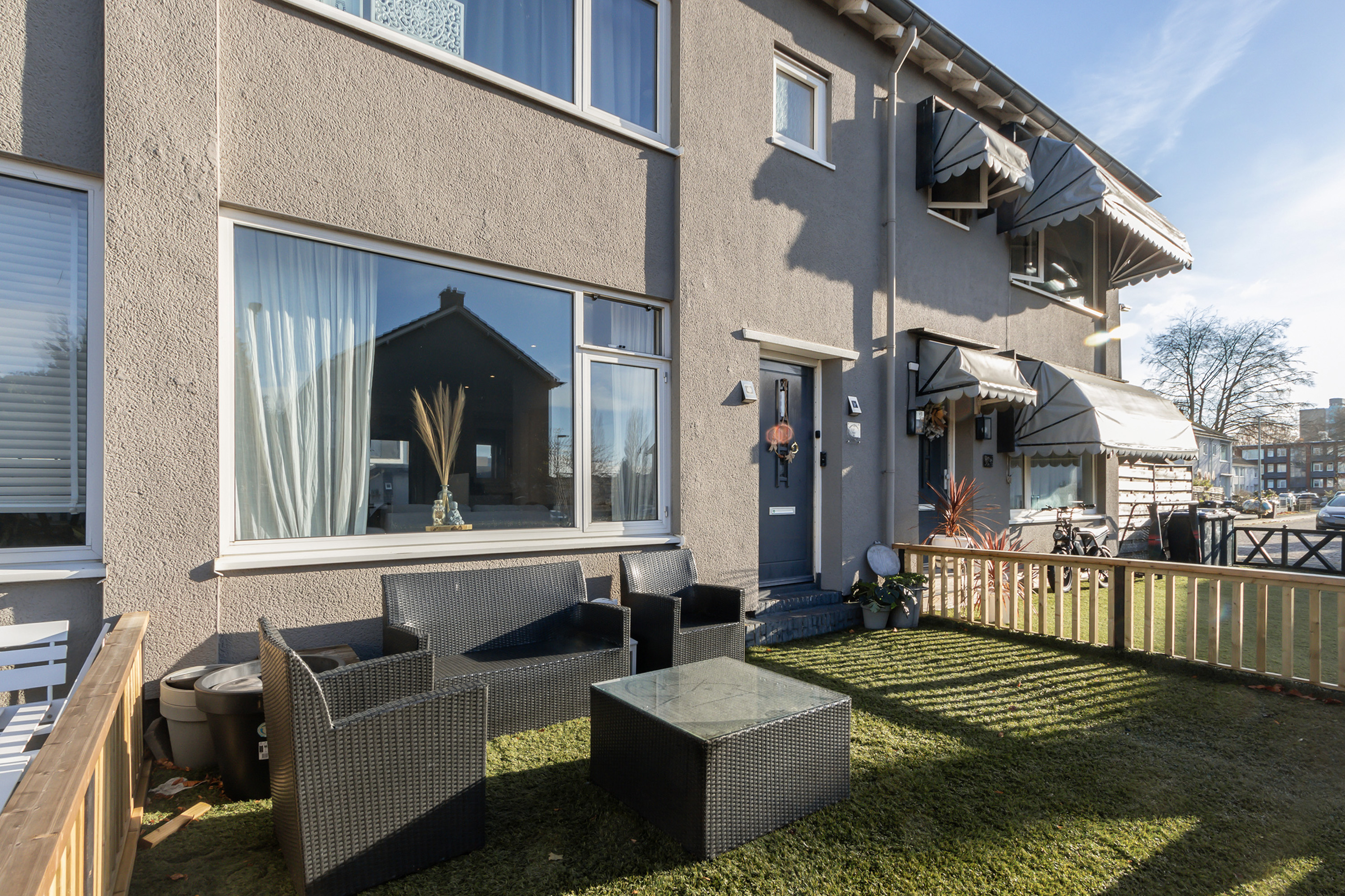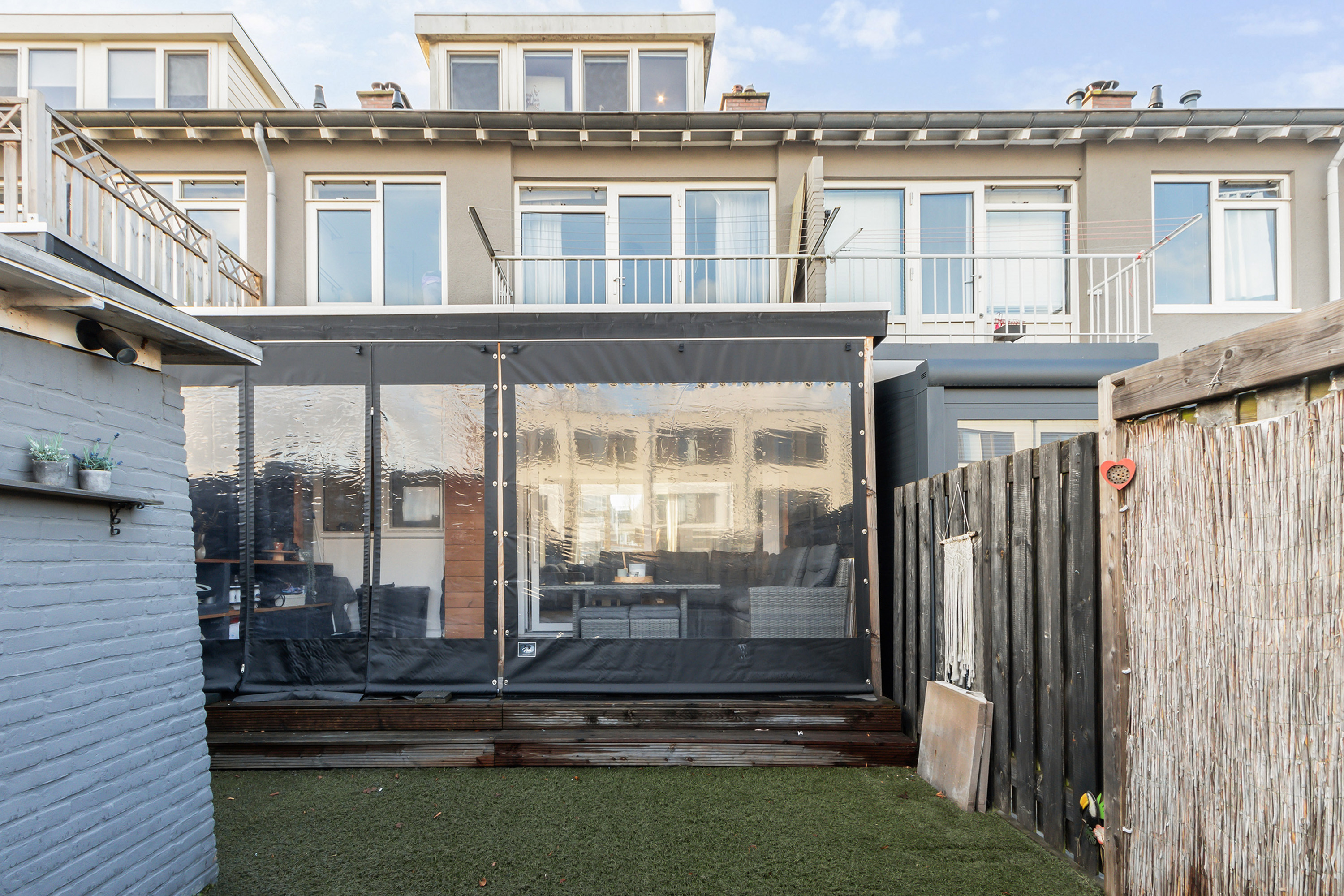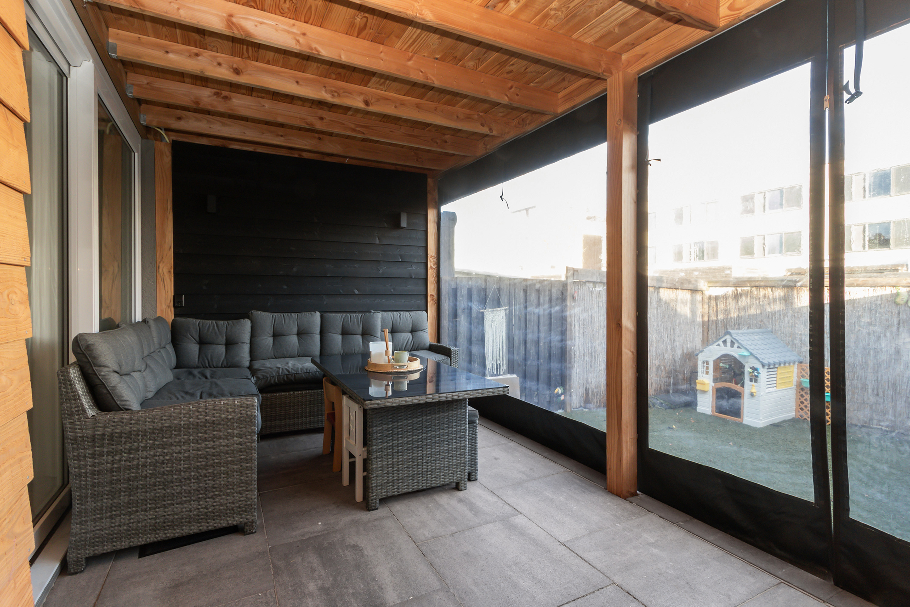 De achtertuin is gesitueerd op het oosten, is omheind en heeft een achterom. De stoere lounge-overkapping maakt de tuinbeleving compleet.
