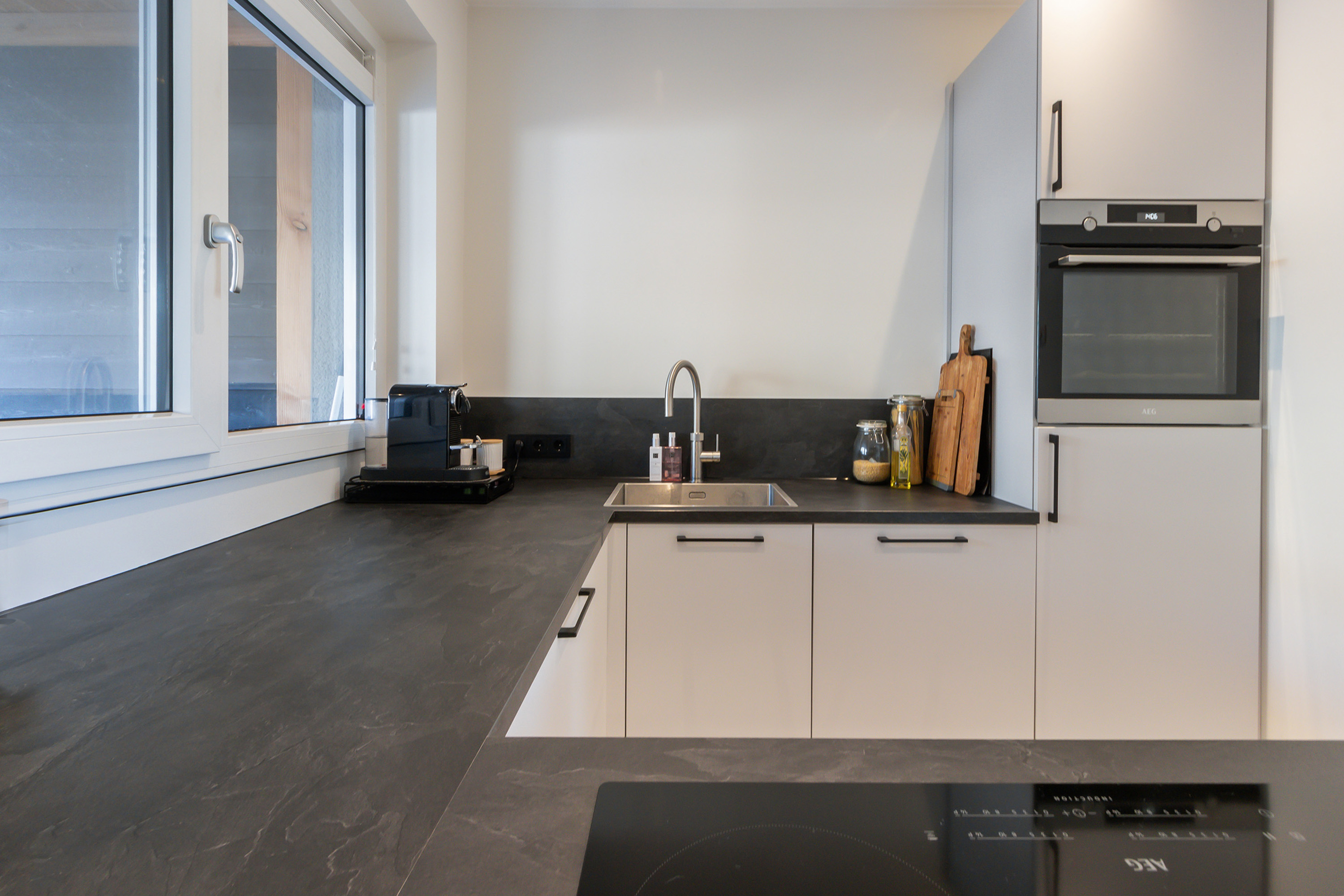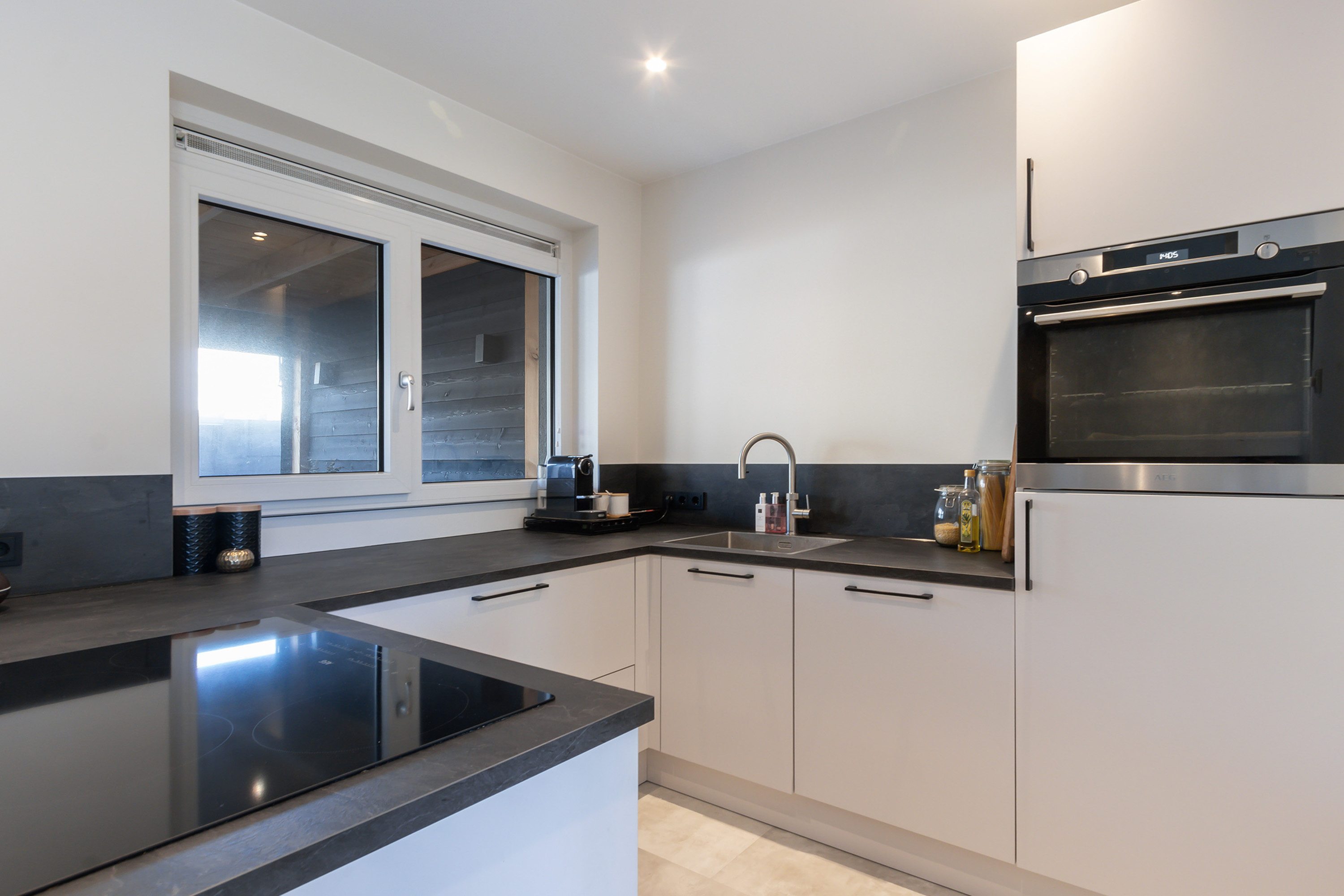 - Open keuken met inrichting in U-opstelling met enkele rvs spoelbak, Quooker kraan, diverse lichtgrijze onderkasten en lades. De keuken is voorzien van AEG-inbouwapparatuur: een 4-zone inductiekookplaat, een combimagnetron met stoomfunctie, een vaatwasser en een koelkast.