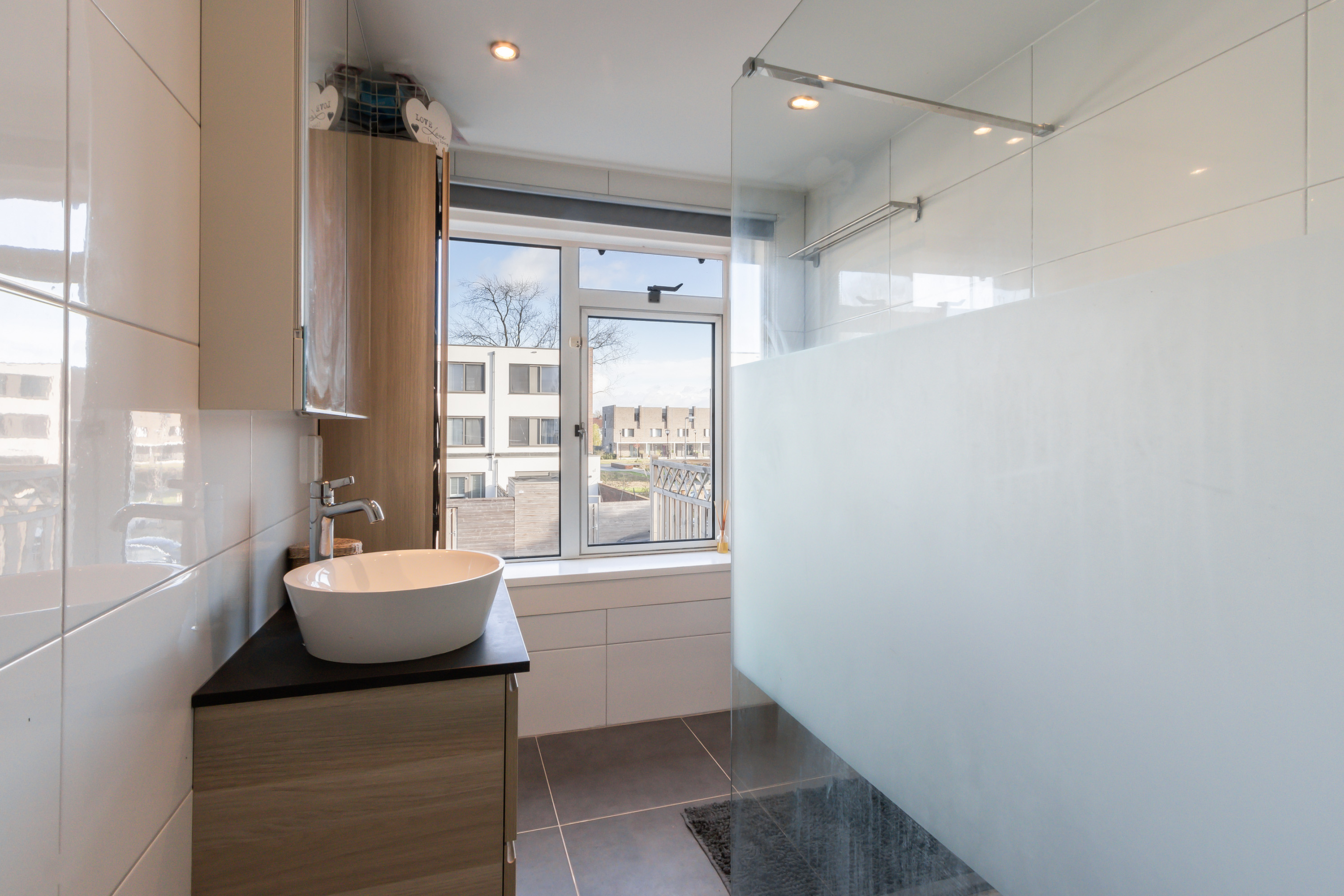 - Badkamer, gelegen aan de achterzijde met een verlaagd plafond met spotverlichting, volledig betegelde wanden, een plavuizen vloer, wit sanitair, een wastafelmeubel met spiegelkast, een inloopdouche met hardglazen scherm met thermostaatkraan, een drainafvoer, een regendouche i.c.m een handdouche.