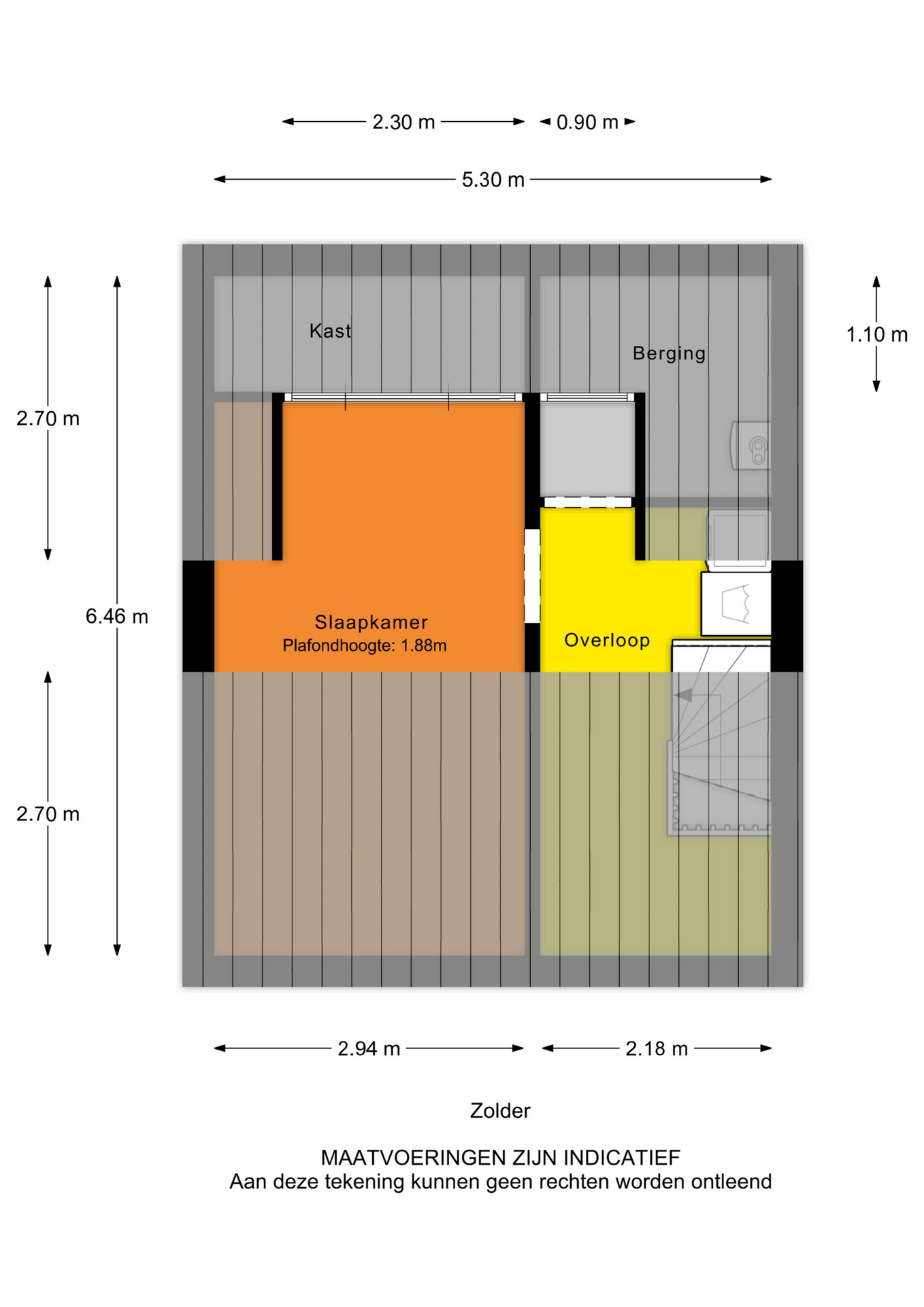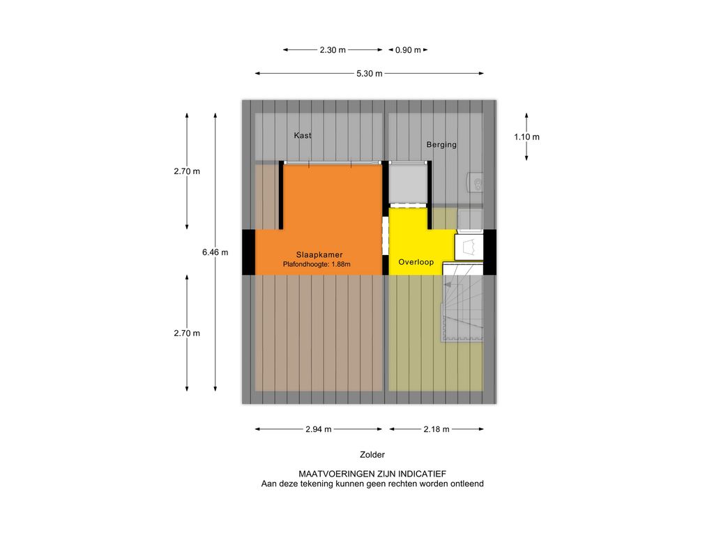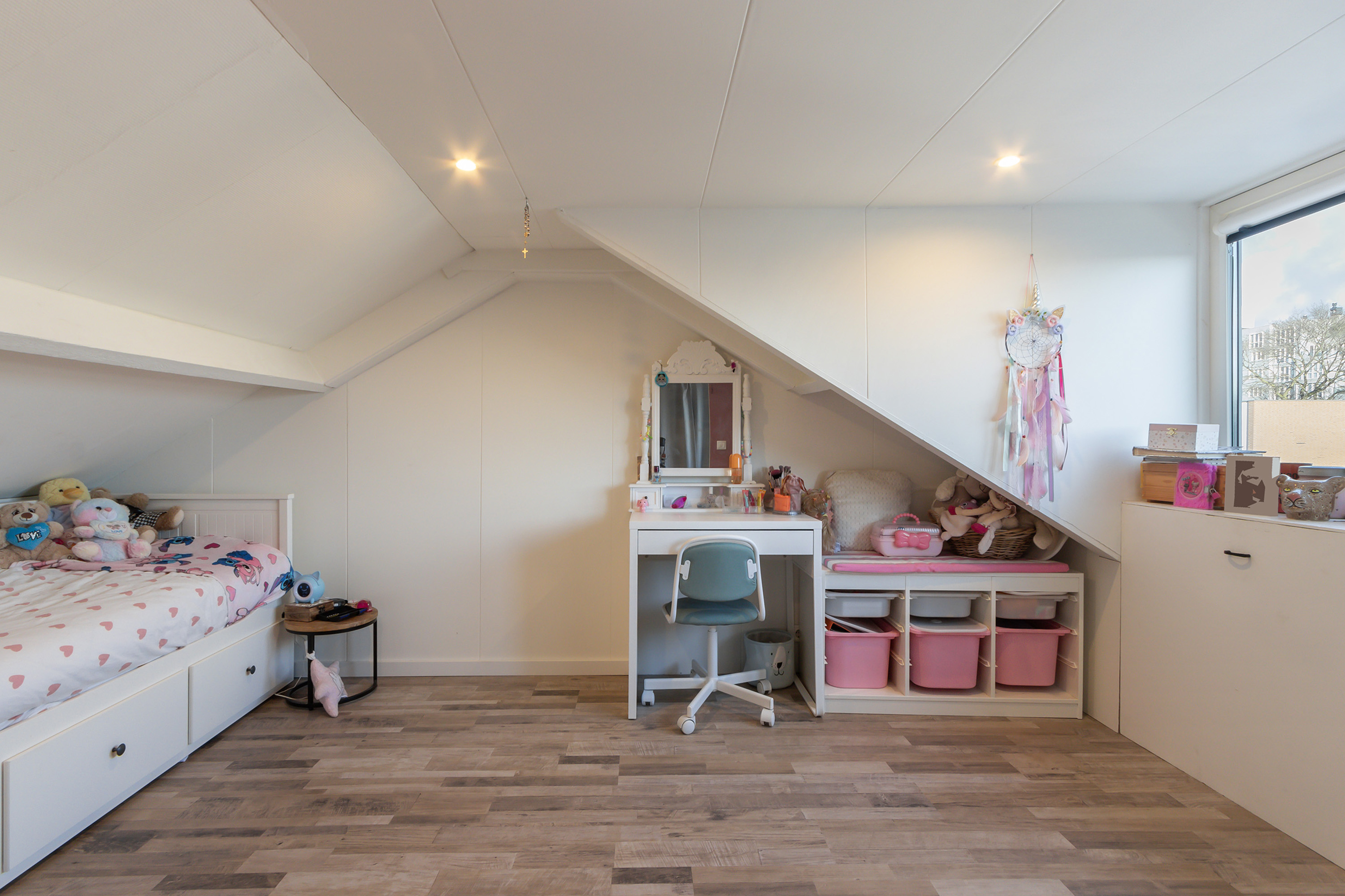 - Zolderkamer (hoogte ca. 1.88 m.) met kunststof dakkapel, extra bergruimte achter de knieschotten en een plafond met spotverlichting.