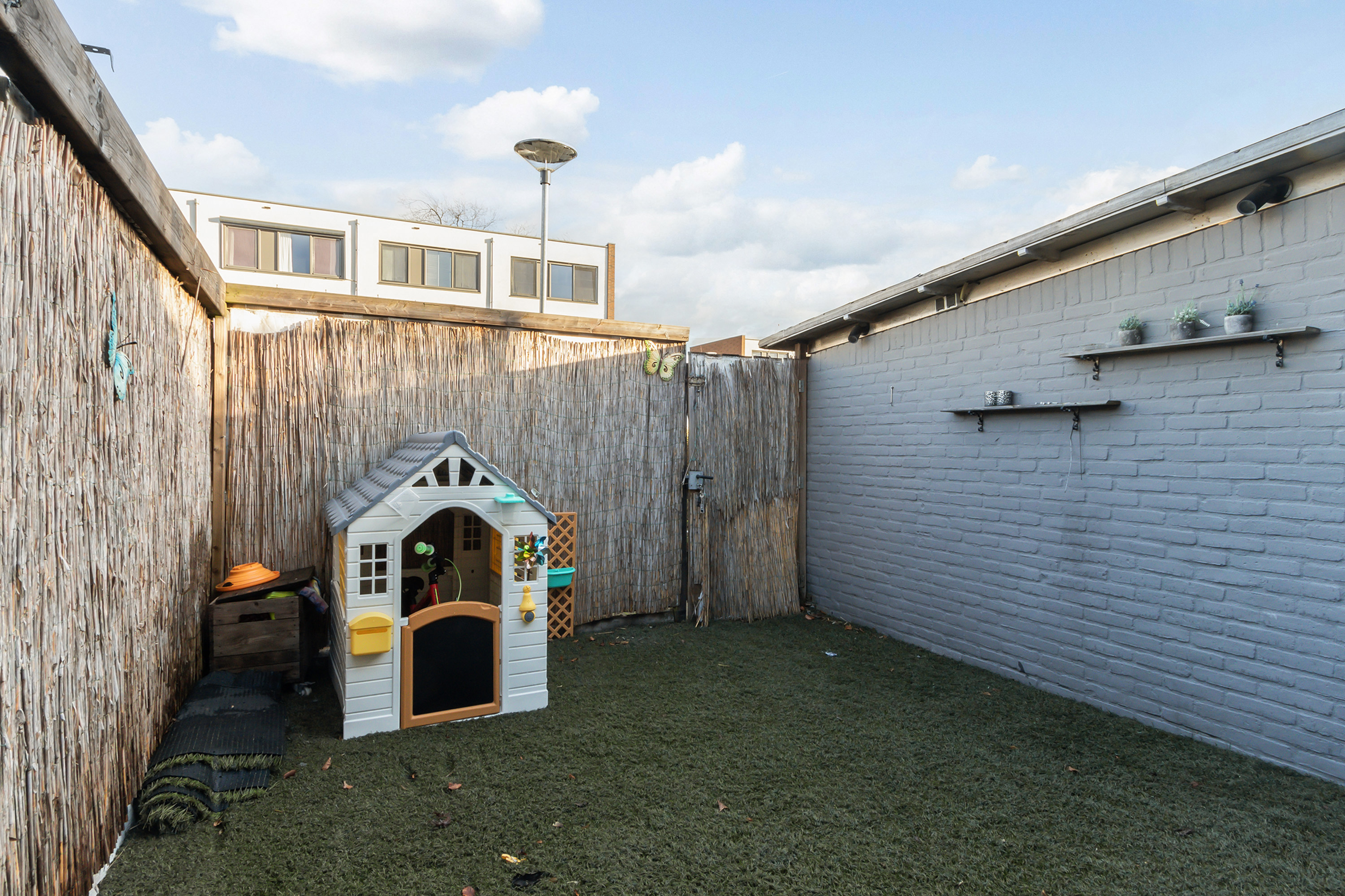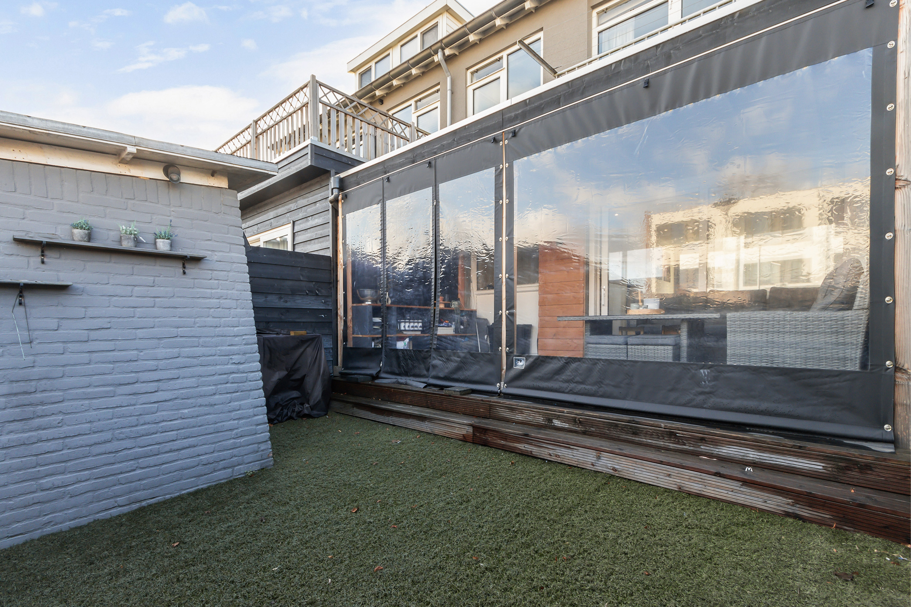 - Achtertuin: ca. 7.90 m. x 5.60 m., gesitueerd op het oosten. De tuin beschikt over een achterom en een waterkraan. In de tuin bevindt zich een stenen berging met een betontegelvloer en elektra. Aan de voorzijde ligt een verhoogd terras met grote terrastegels en een stoere houten lounge-overkapping. Aan de achterzijde is de tuin afgewerkt met kunstgras.